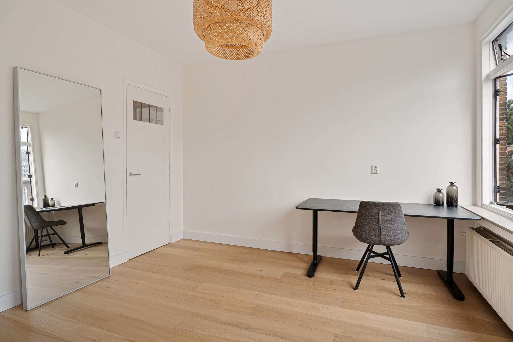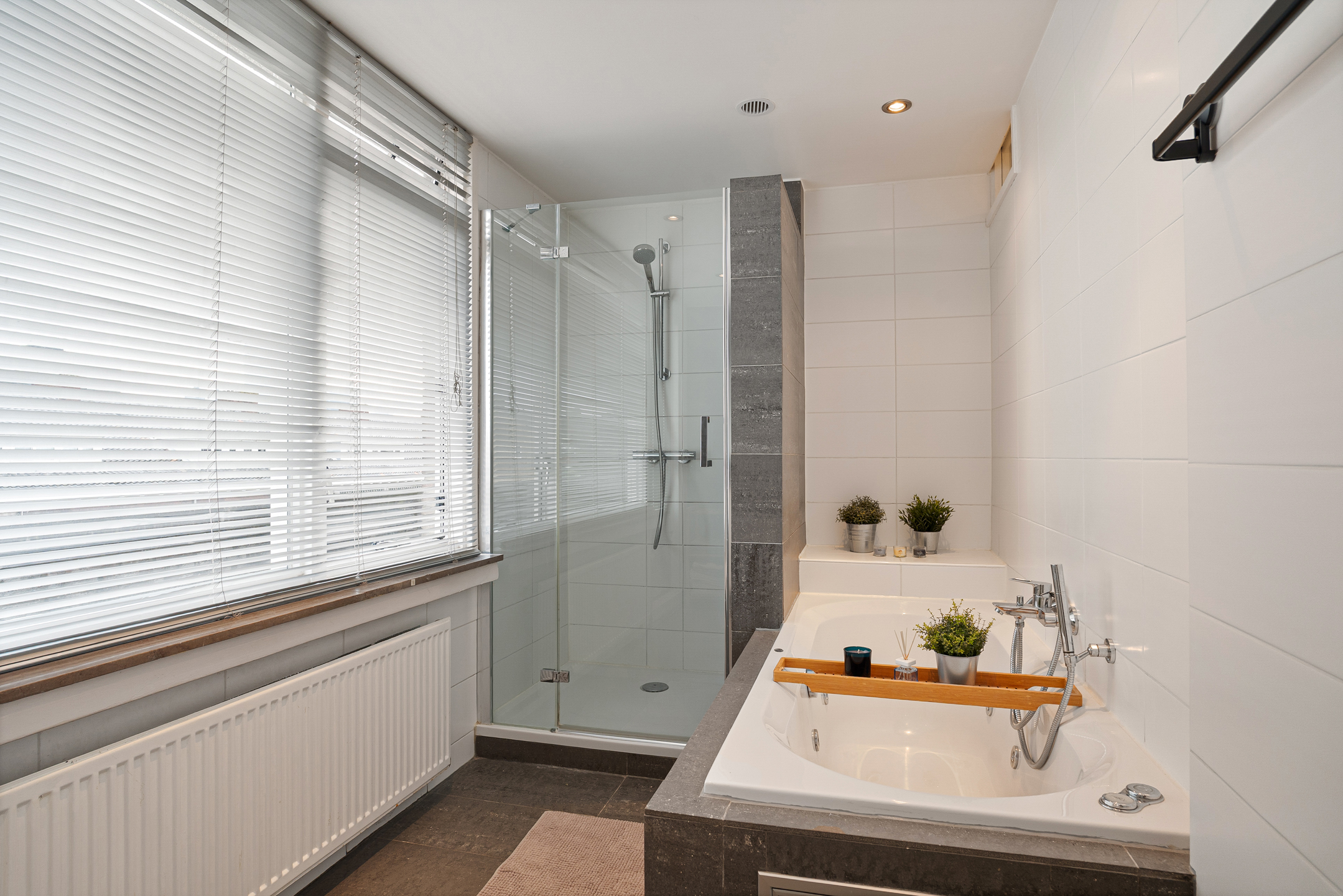 De bovenverdieping biedt een ruime tweede slaapkamer met voldoende plek voor een grote kledingkast en toegang tot het balkon over de volledige breedte van de woning. Aangrenzend vind je de badkamer. Deze is ruim opgezet en compleet uitgevoerd met een ligbad, aparte douche en een breed wastafelmeubel. Hier kom je echt tot rust na een lange dag.