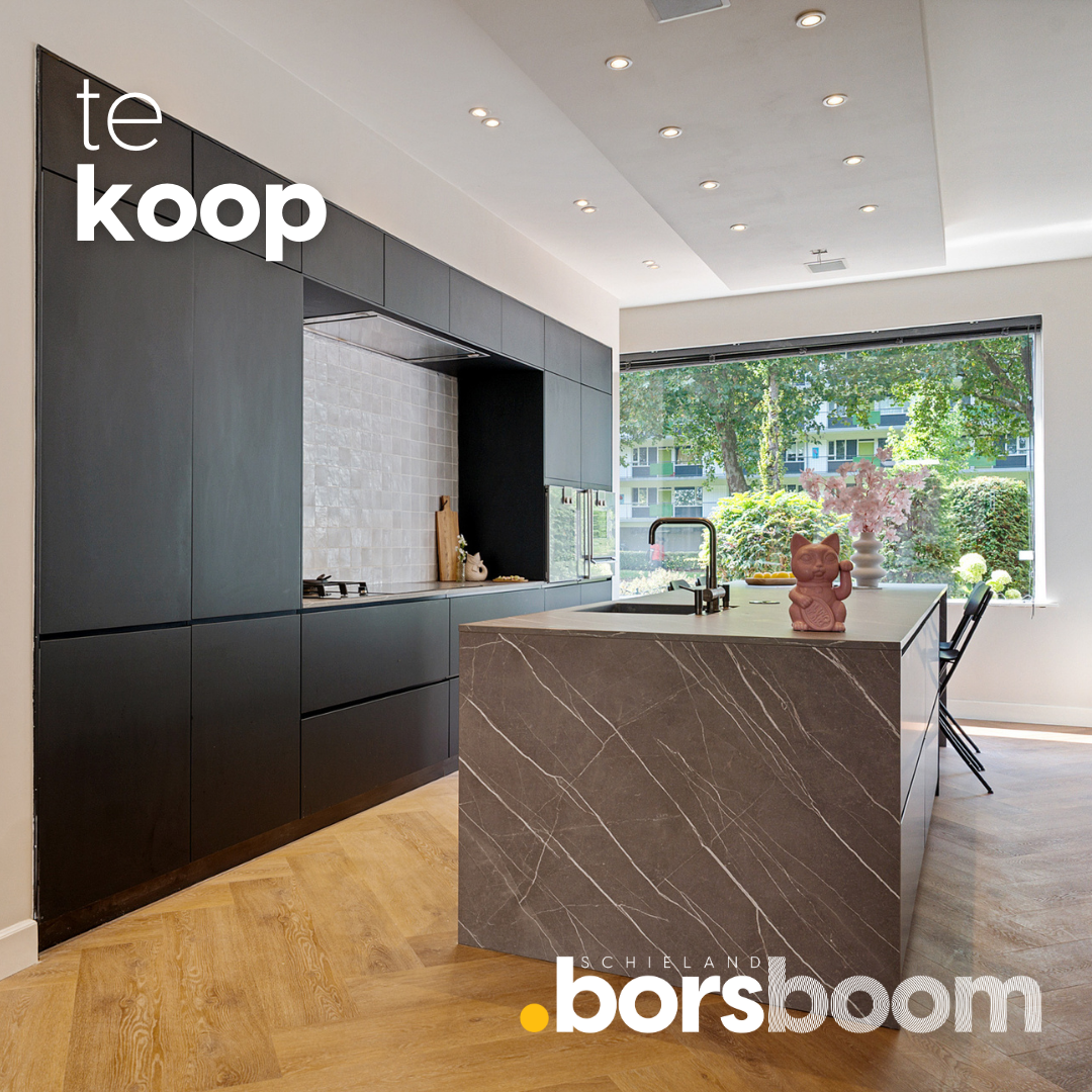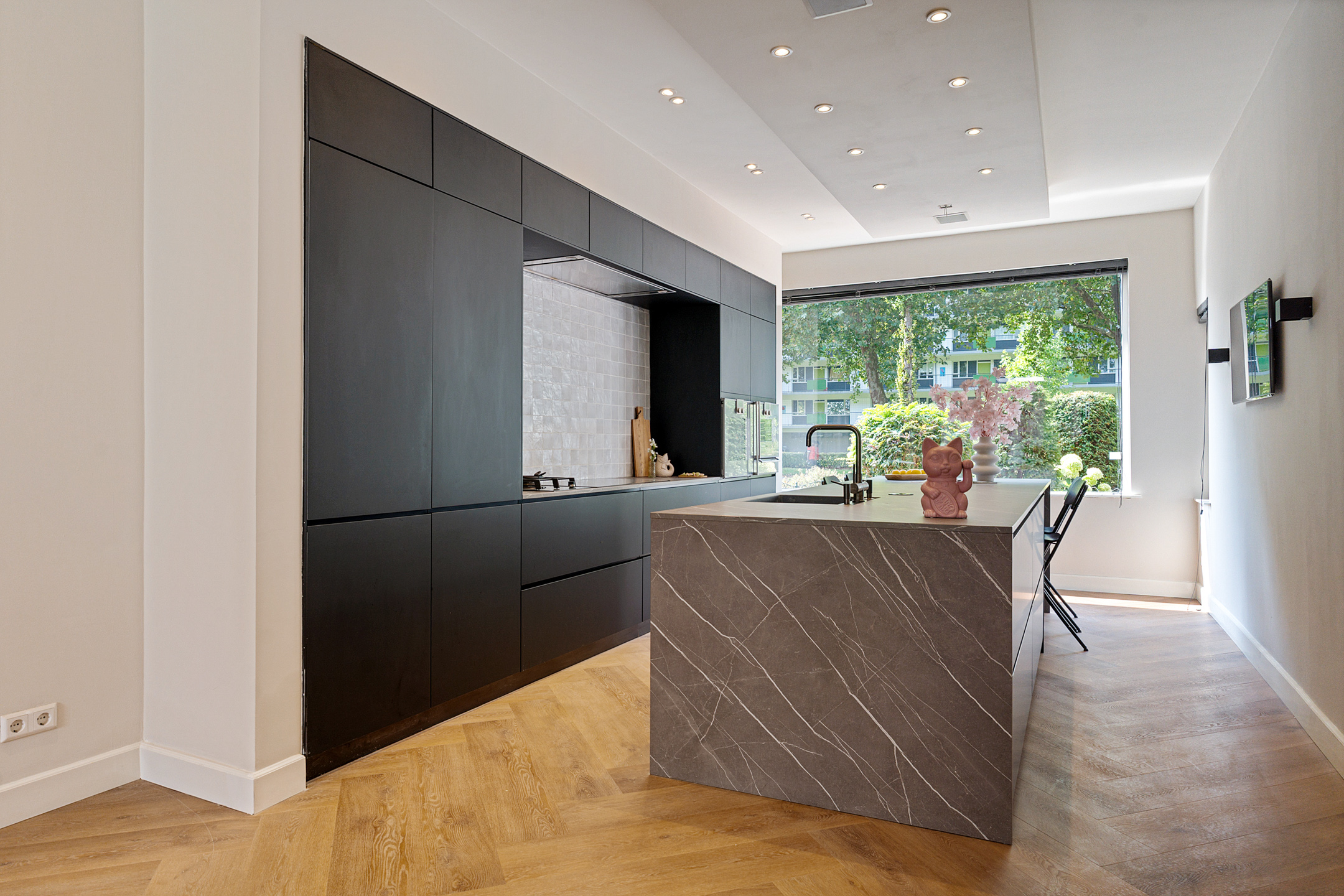Vanuit de hal kom je in de royale, uitgebouwde woonkamer, voorzien van een eikenhouten visgraatvloer. Aan de voorzijde van de woning bevindt zich de moderne, open keuken, uitgevoerd met zwarte kastdeuren en een marmerlook-aanrechtblad. De keuken beschikt over diverse inbouwapparatuur, waaronder een 6-zone inductiekookplaat (AEG), afzuigschouw, combi-oven, stoomoven, bordenwarmer (Gaggenau) en een koelkast. Het spoeleiland is uitgerust met een zwarte gootsteen, luxe kokend waterkraan, twee zeepdispensers, een vaatwasser en veel ruime lades. Bovendien is er een praktische eetbar voor vier personen, ideaal voor een snelle maaltijd of een gezellig ontbijt.