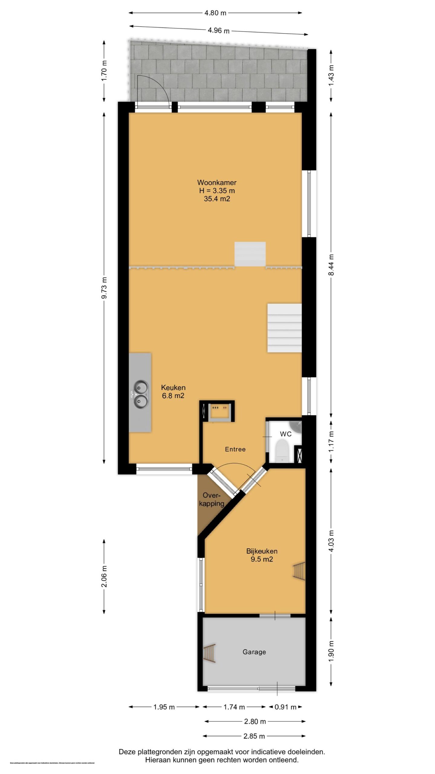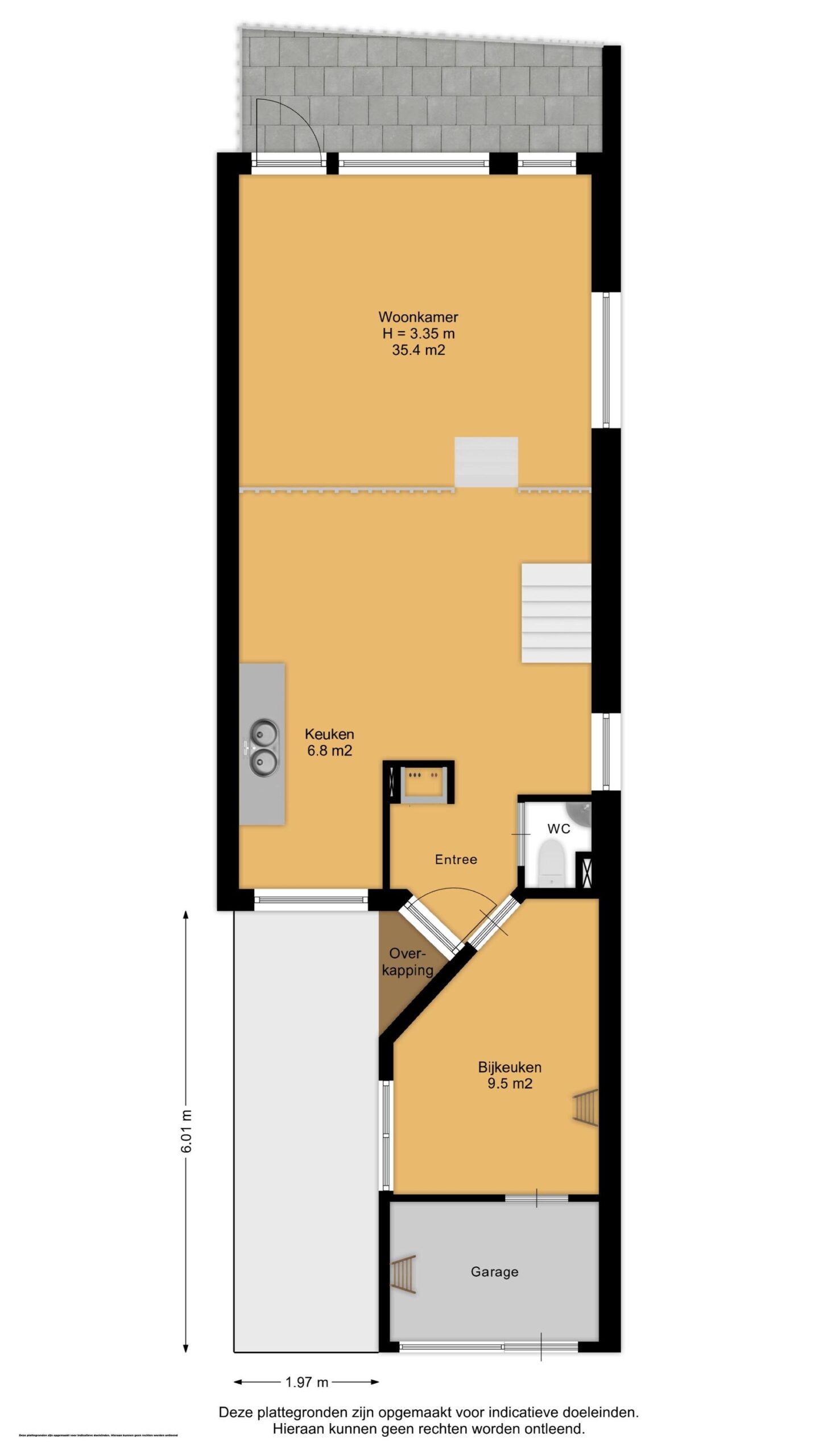 Via de voortuin bereik je de entree van de woning. De hal geeft toegang tot het toilet, de bijkeuken en de woonkamer. De woonkamer is opgedeeld in twee niveaus, waardoor je op een speelse manier verschillende leefhoeken kunt creëren. Grote ramen zorgen voor veel lichtinval, ook dankzij het extra zijraam. Aan de voorzijde bevindt zich de keuken, die nog volledig naar eigen smaak ingericht kan worden. Vanuit de bijkeuken is er toegang tot de bergvliering boven de garage, handig voor koffers, seizoensspullen of voorraad. Wil je extra ruimte? Dan is de garage eenvoudig te vergroten door een deel van de bijkeuken erbij te trekken.
