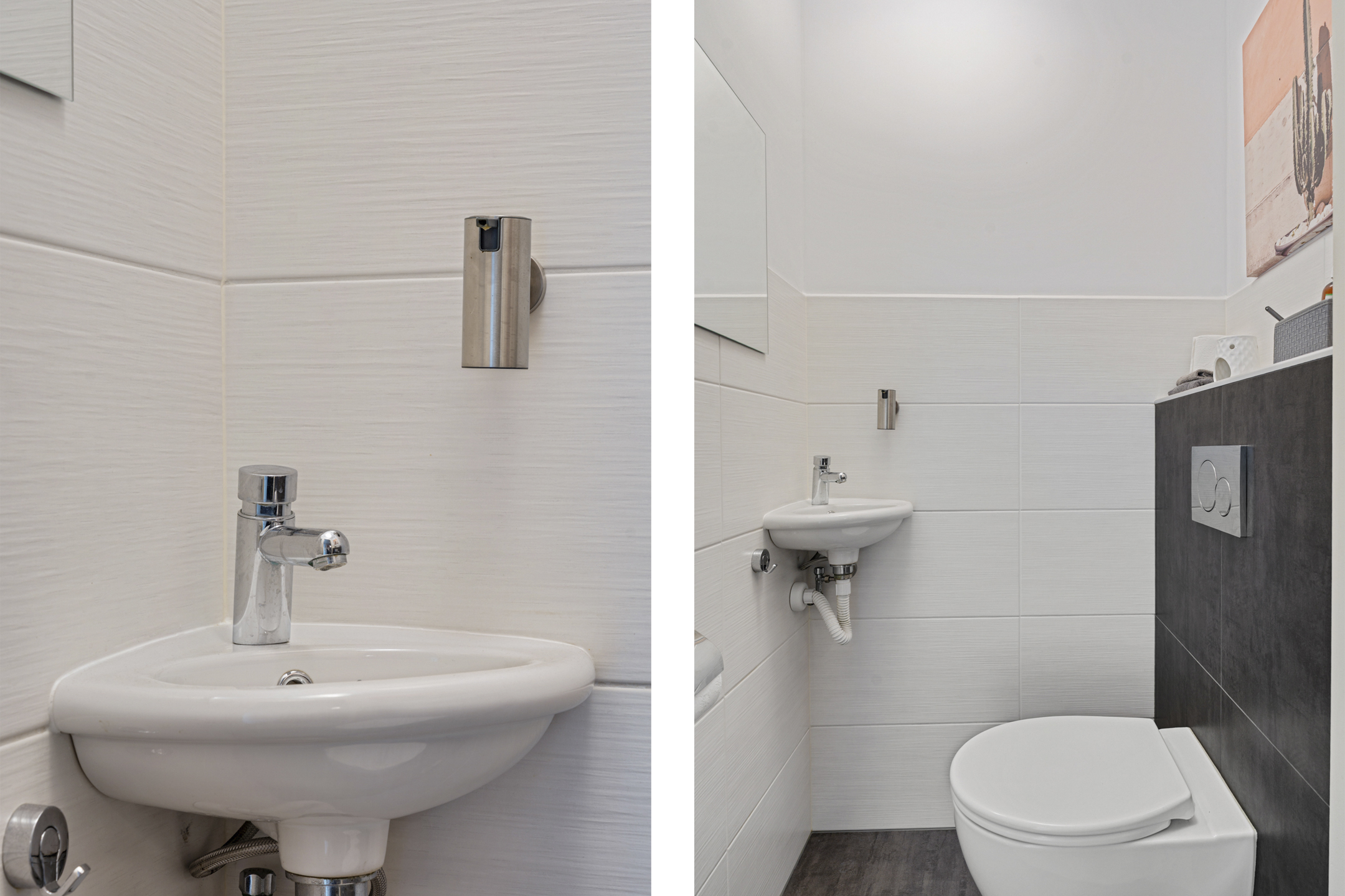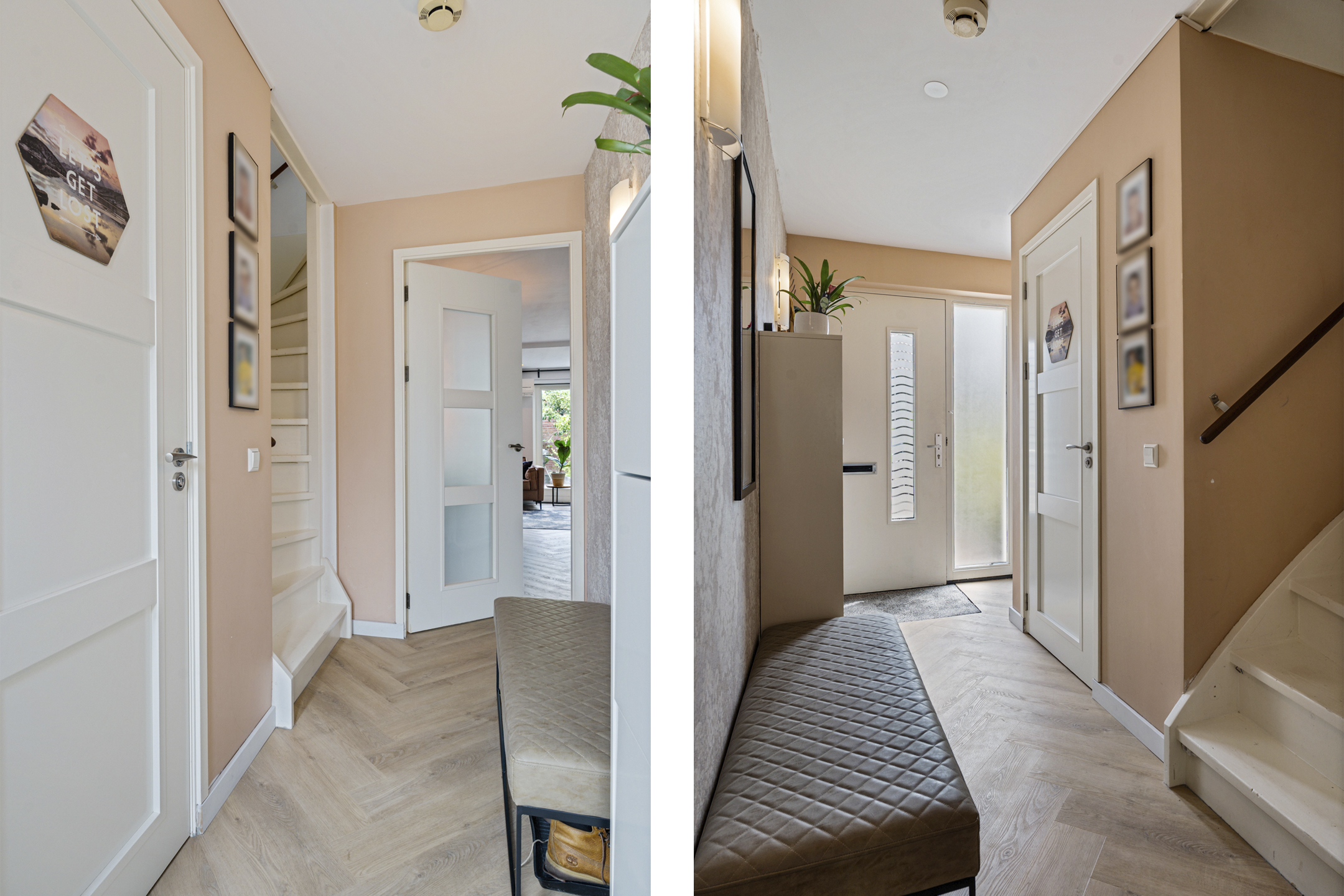 Via de nette voortuin met sierhekwerk en onderhoudsvriendelijke beplanting bereik je de entree. De hal is ruim opgezet en biedt toegang tot de meterkast, een modern toilet met fonteintje en de lichte, uitgebouwde woonkamer.