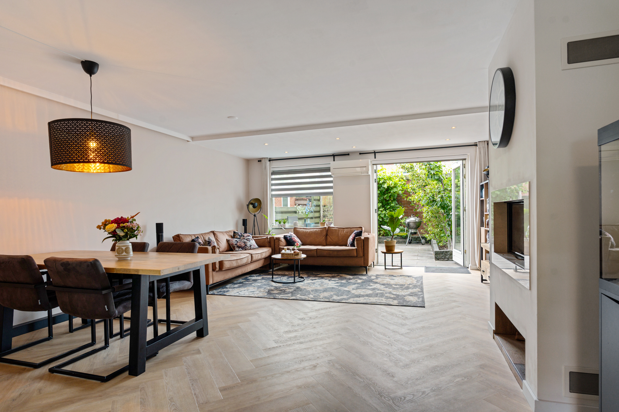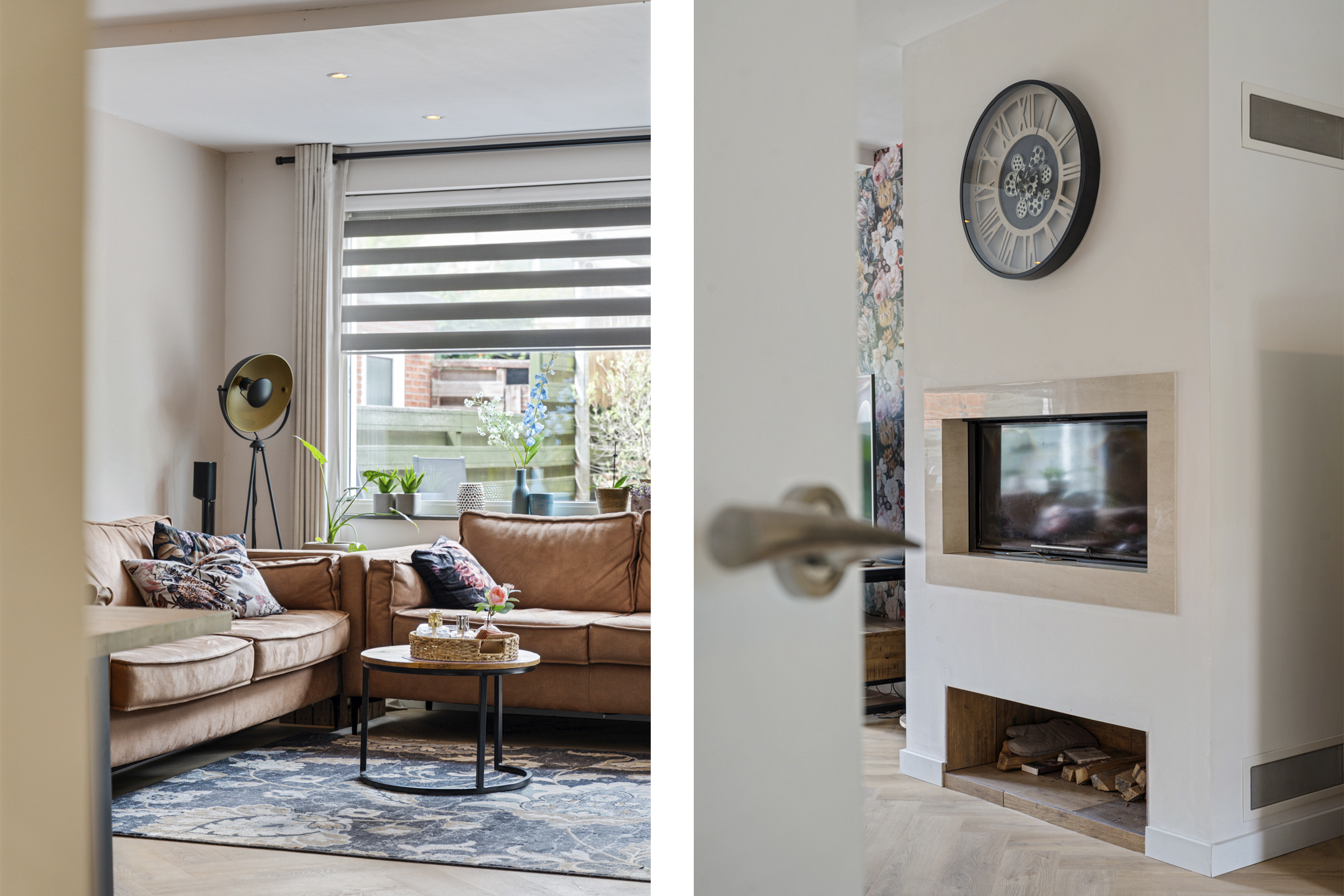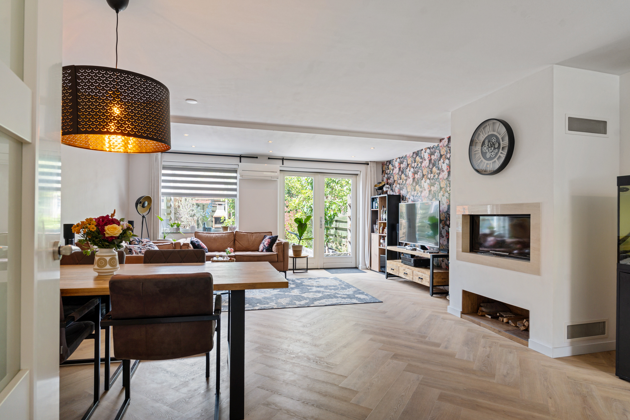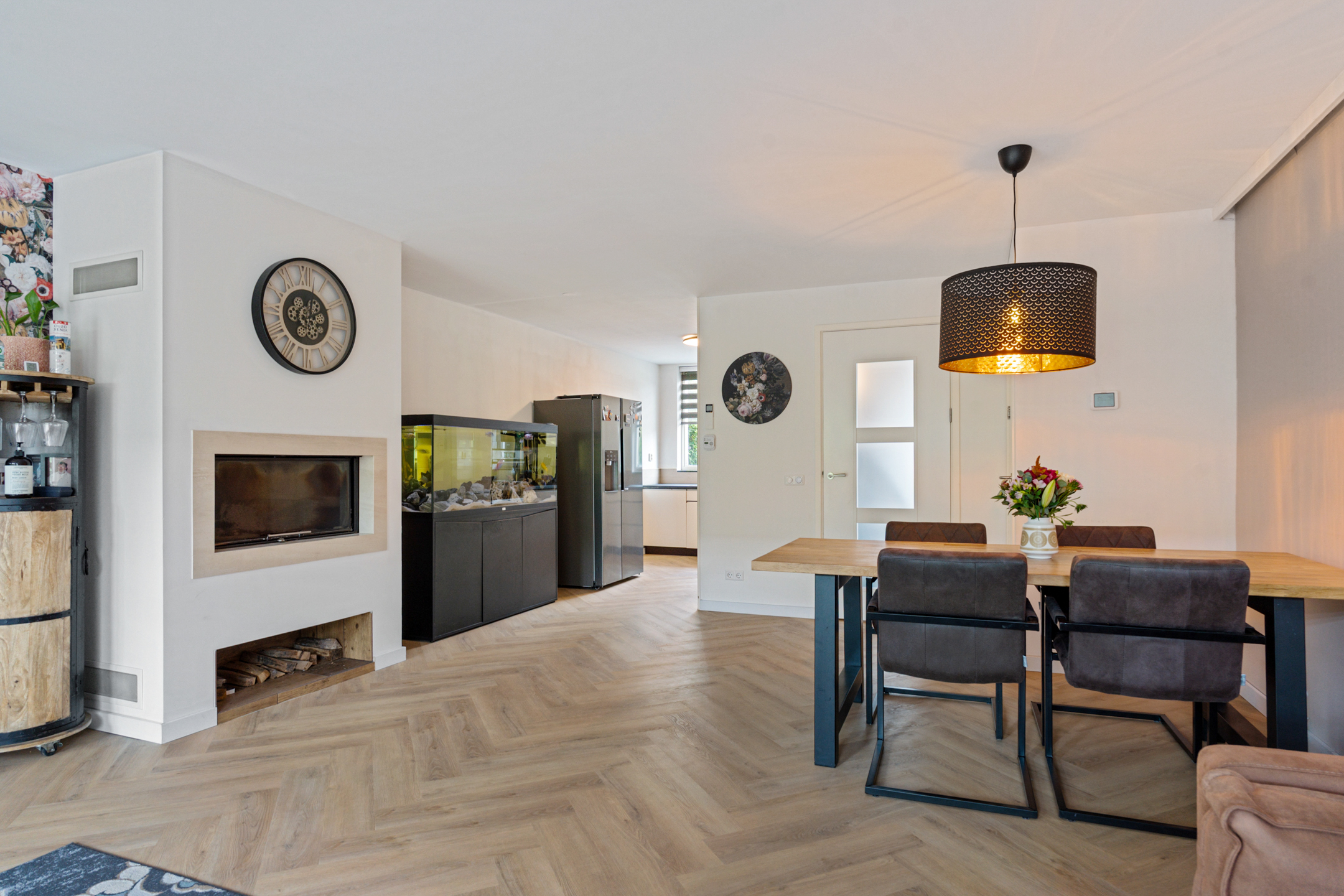 De woonkamer is voorzien van een sfeervolle open haard, strak gestuukte wanden en plafonds en een moderne PVC visgraatvloer met vloerverwarming (2024). Grote raampartijen en openslaande deuren naar de tuin zorgen voor een prettige lichtinval. De uitbouw is afgewerkt met inbouwverlichting en geeft net dat beetje extra leefruimte.