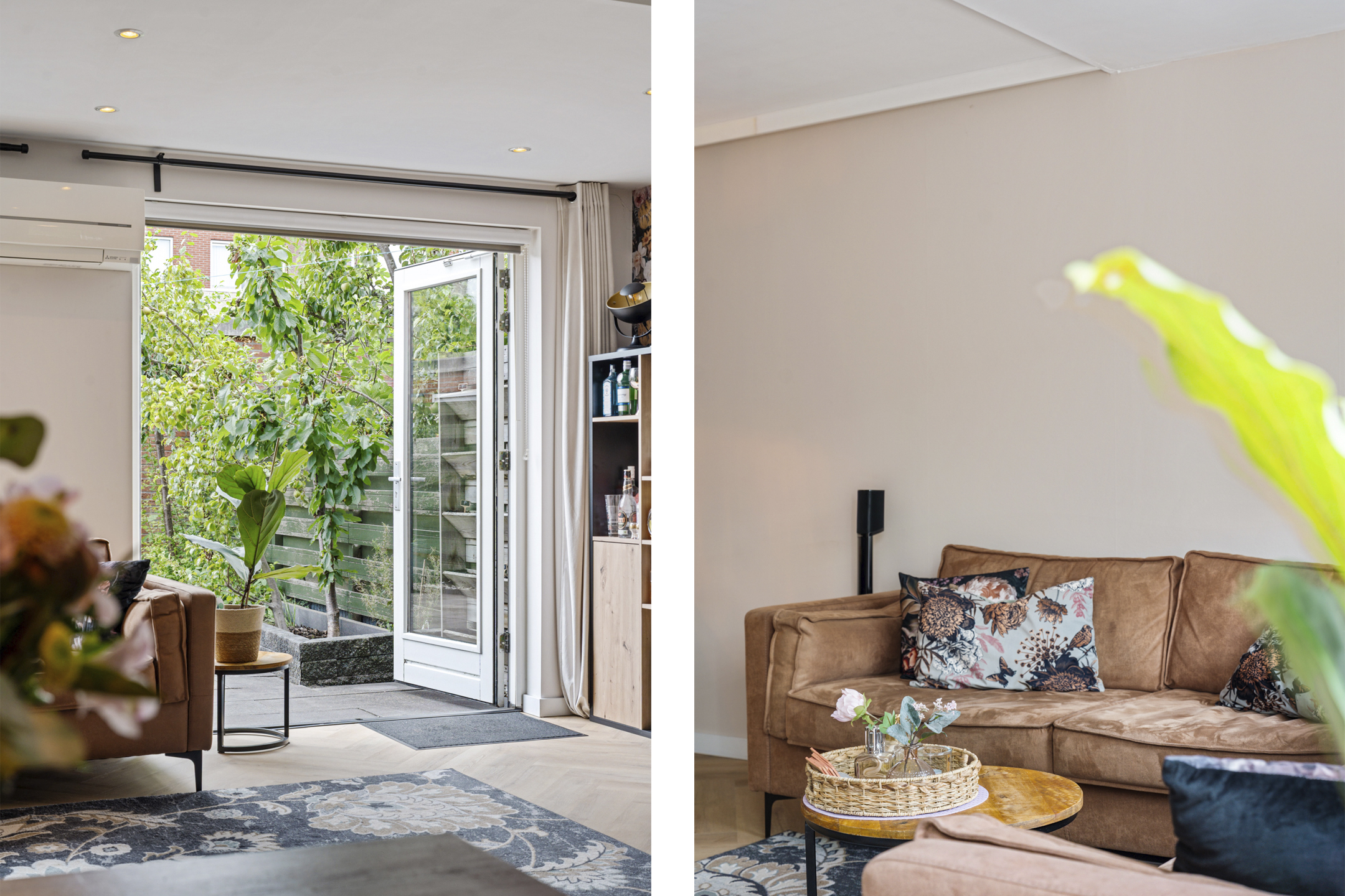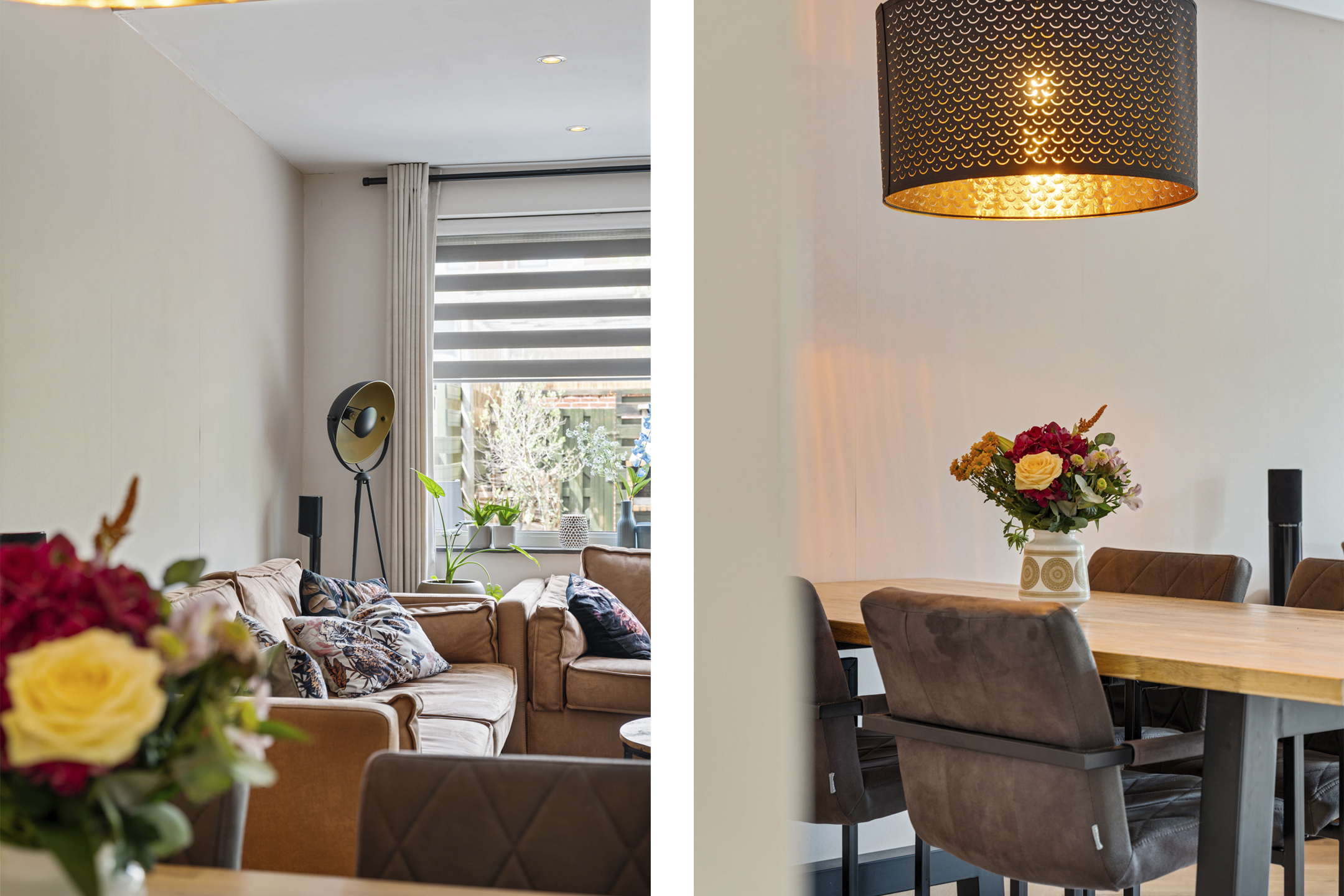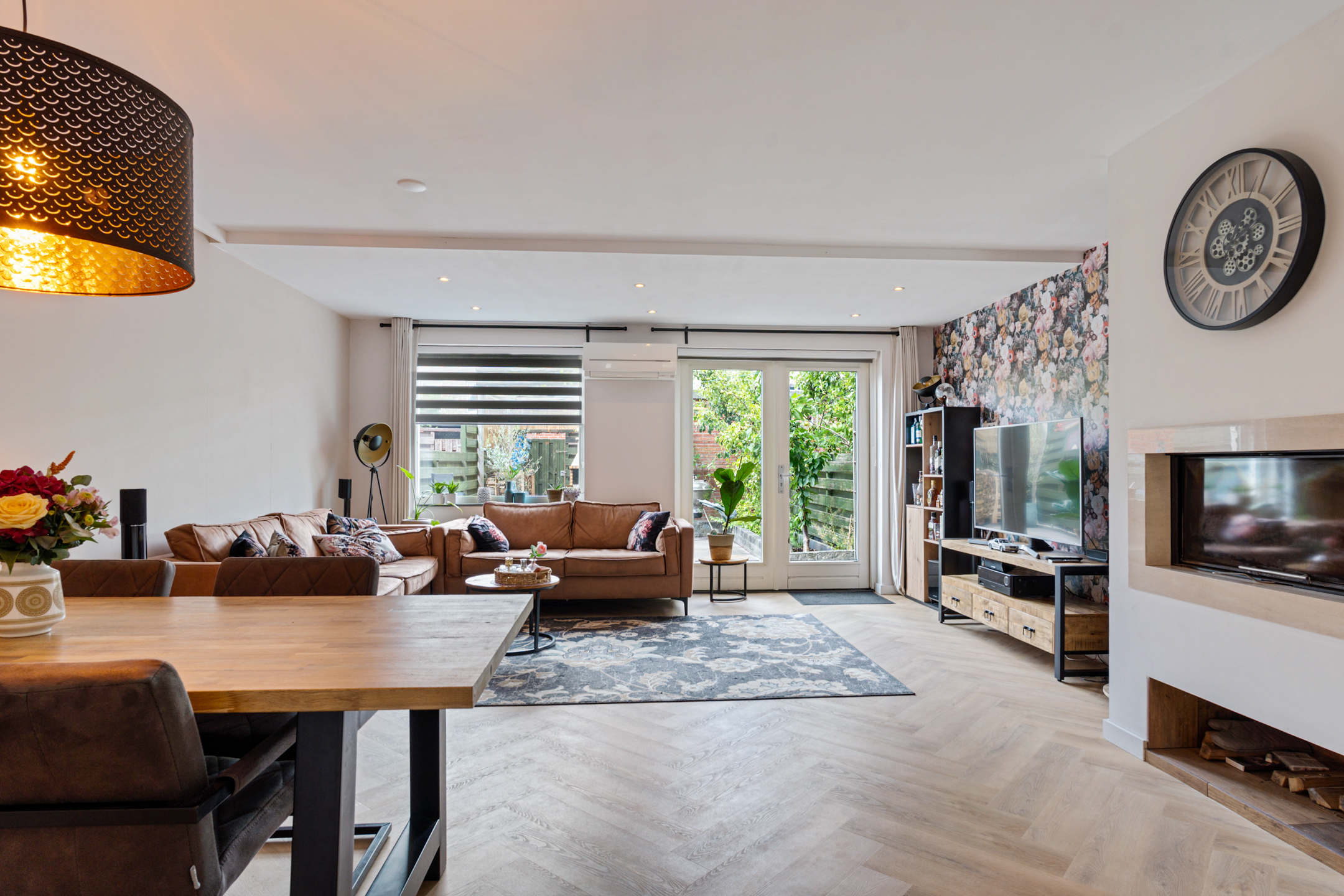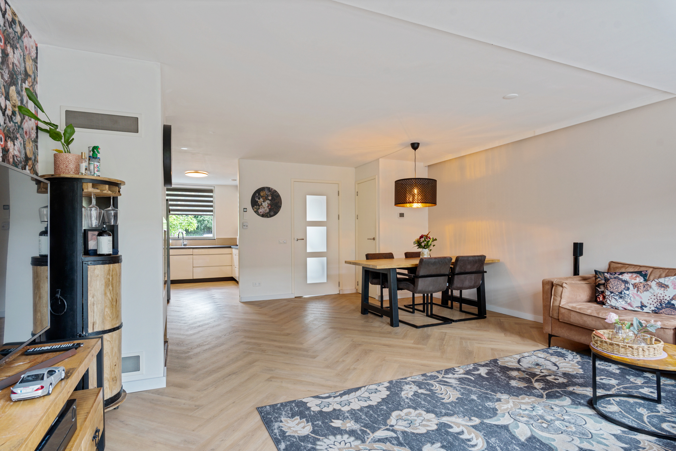 De woonkamer is voorzien van een sfeervolle open haard, strak gestuukte wanden en plafonds en een moderne PVC visgraatvloer met vloerverwarming (2024). Grote raampartijen en openslaande deuren naar de tuin zorgen voor een prettige lichtinval. De uitbouw is afgewerkt met inbouwverlichting en geeft net dat beetje extra leefruimte.