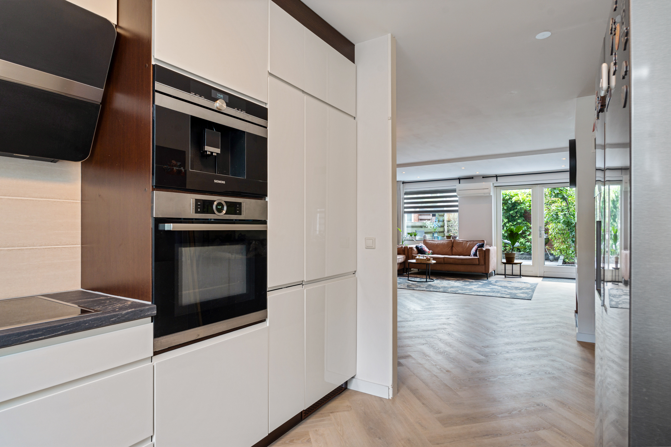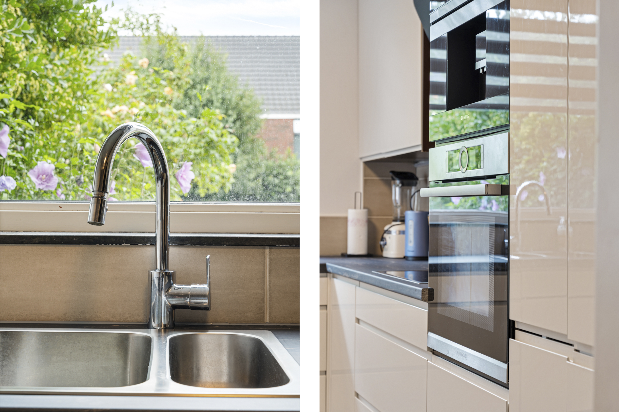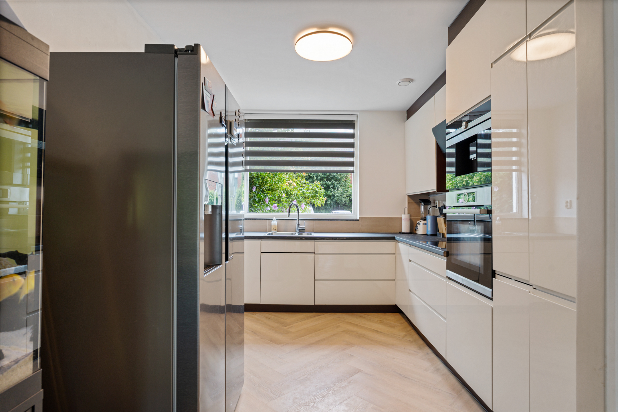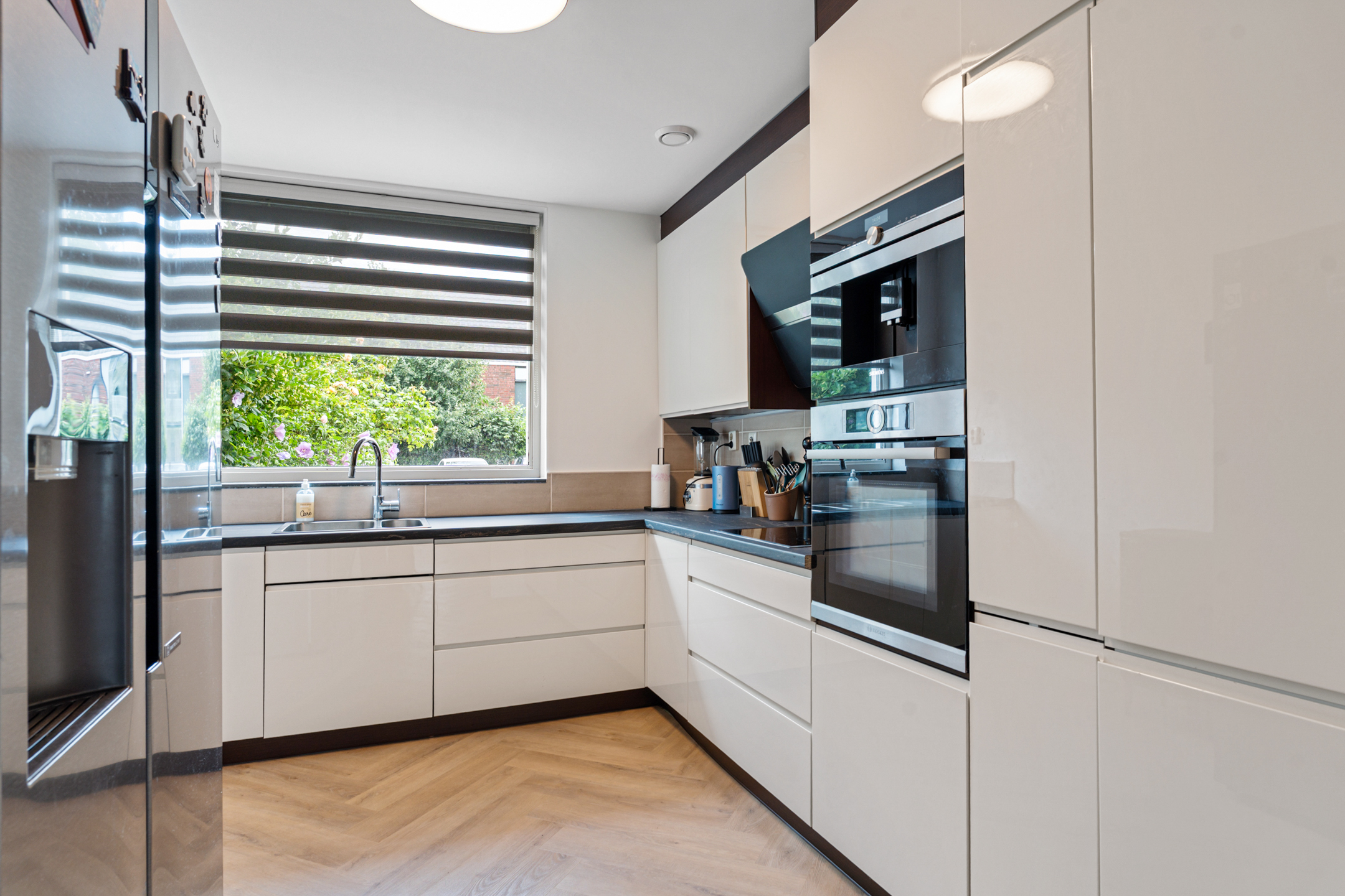 Aan de voorzijde ligt de luxe hoekkeuken in hoogglans wit, uitgerust met een inductiekookplaat, afzuigkap met buitenafvoer, ingebouwd koffieapparaat (ter overname) en vaatwasser.