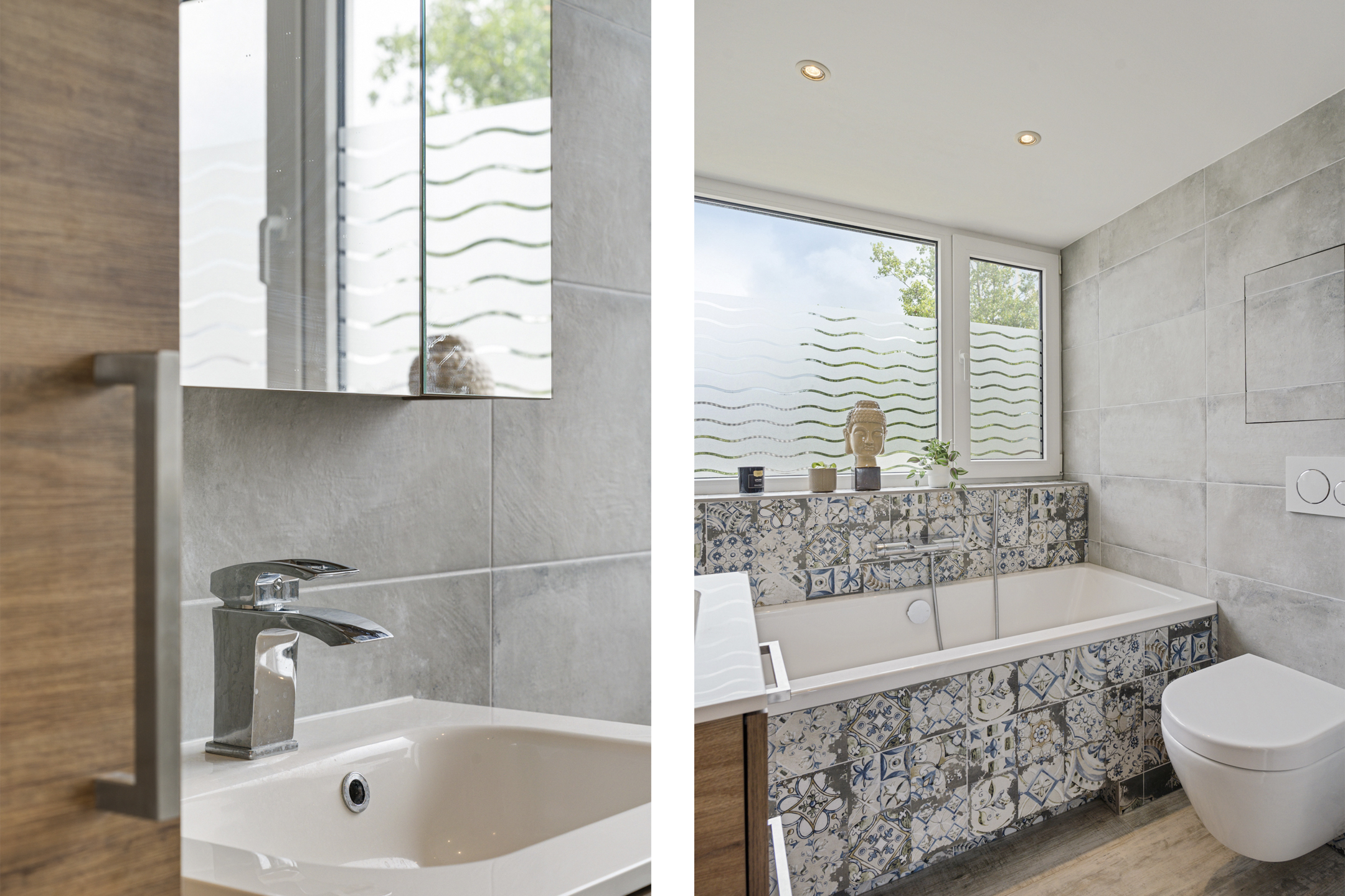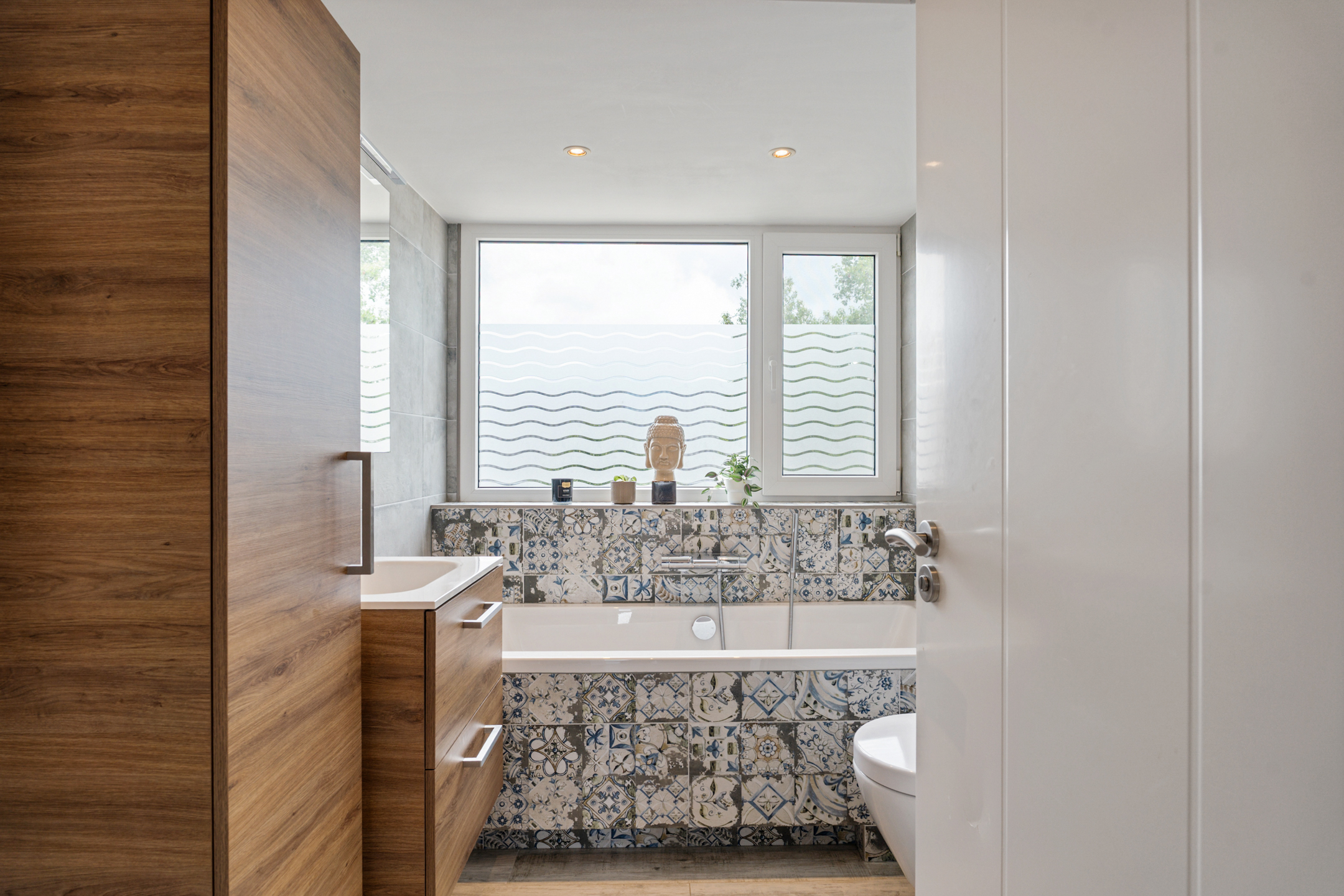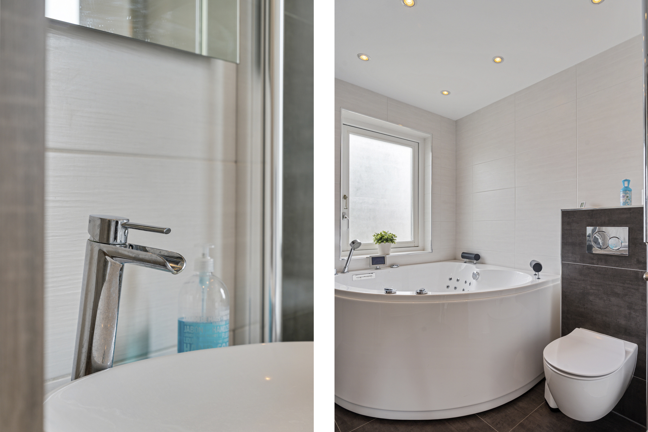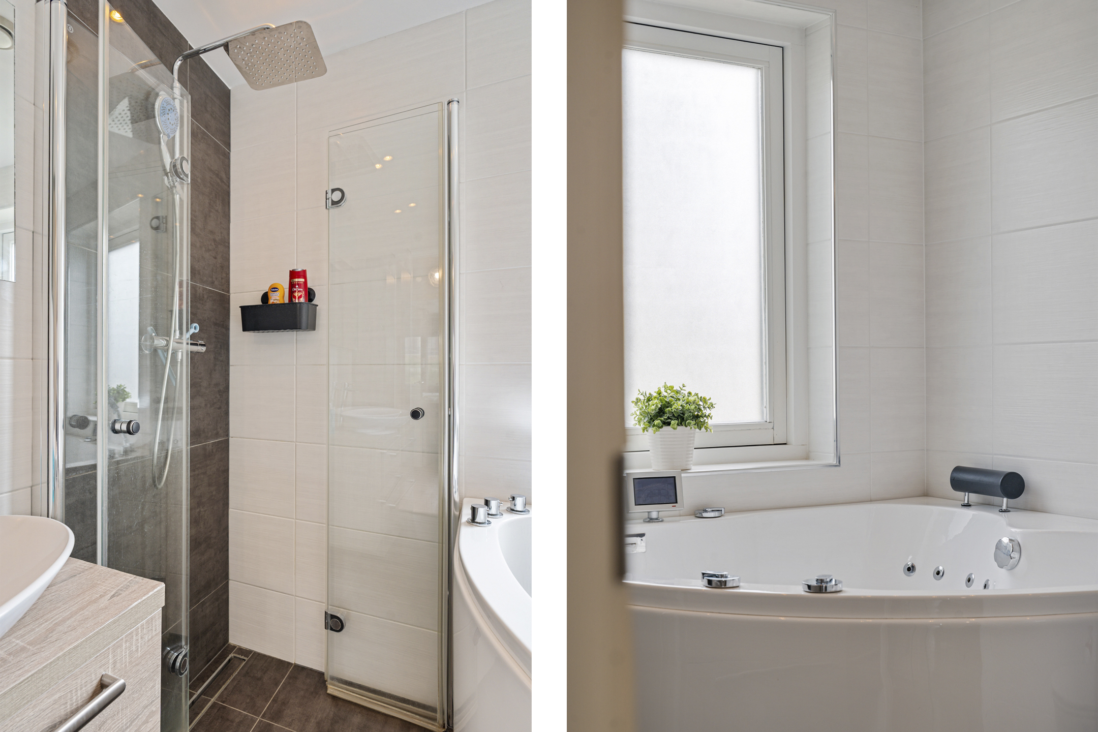 De moderne badkamer (2017) is uitgerust met een jacuzzi, ruime inloopdouche, zwevend toilet, designradiator, wastafelmeubel en inbouwverlichting. Het raam zorgt voor natuurlijke ventilatie, en de combinatie van lichte wanden met donkere vloertegels geeft de ruimte een luxe uitstraling.