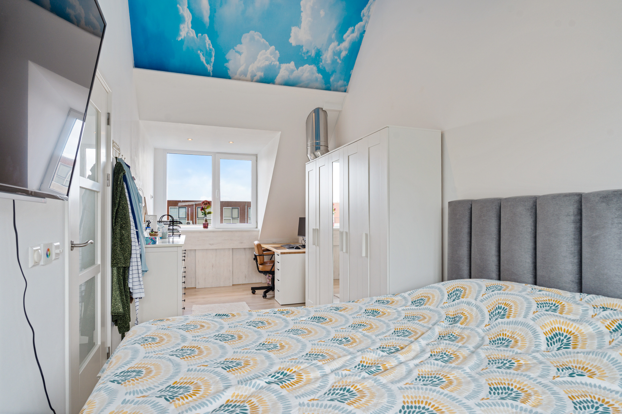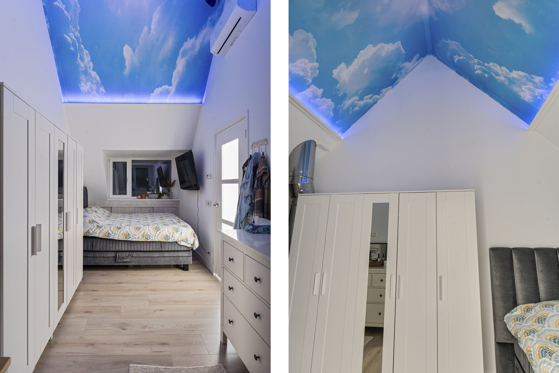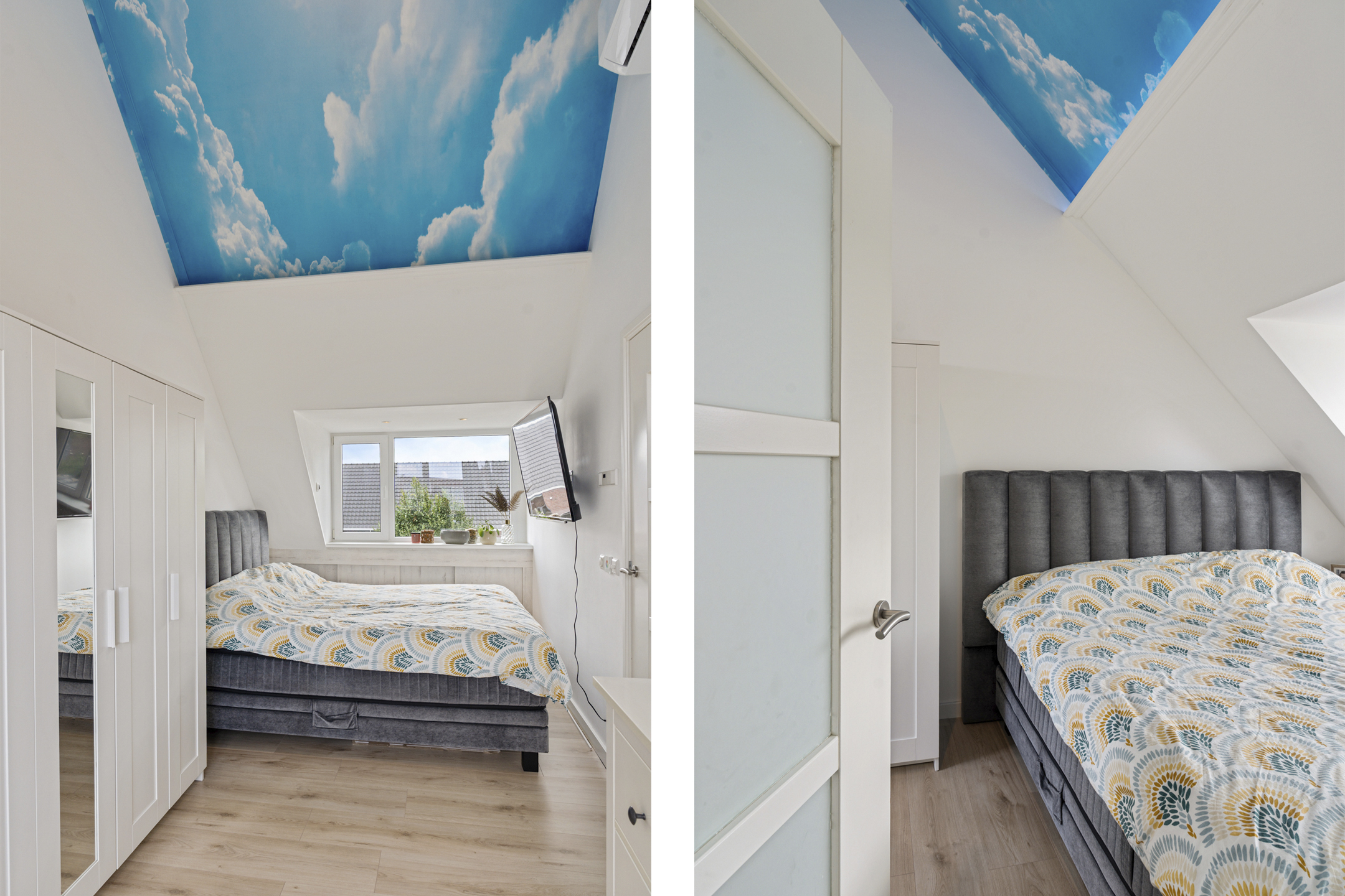 De tweede verdieping is verrassend ruim en praktisch ingericht en voorzien van vloerverwarming. Aan de achterzijde ligt een slaapkamer met brede dakkapel, inbouwverlichting en bergruimte achter de knieschotten. Aan de voorzijde vind je een tweede luxe afgewerkte slaapkamer die doorloopt tot de achterzijde. De slaapkamer is voorzien van airco, dakkapel, inbouw bluetooth radio en led hemelverlichting. Ook op deze verdieping is een luxe badkamer aanwezig, compleet met ligbad, wastafelmeubel, zwevend toilet en inbouwverlichting een ideale plek om even tot rust te komen.