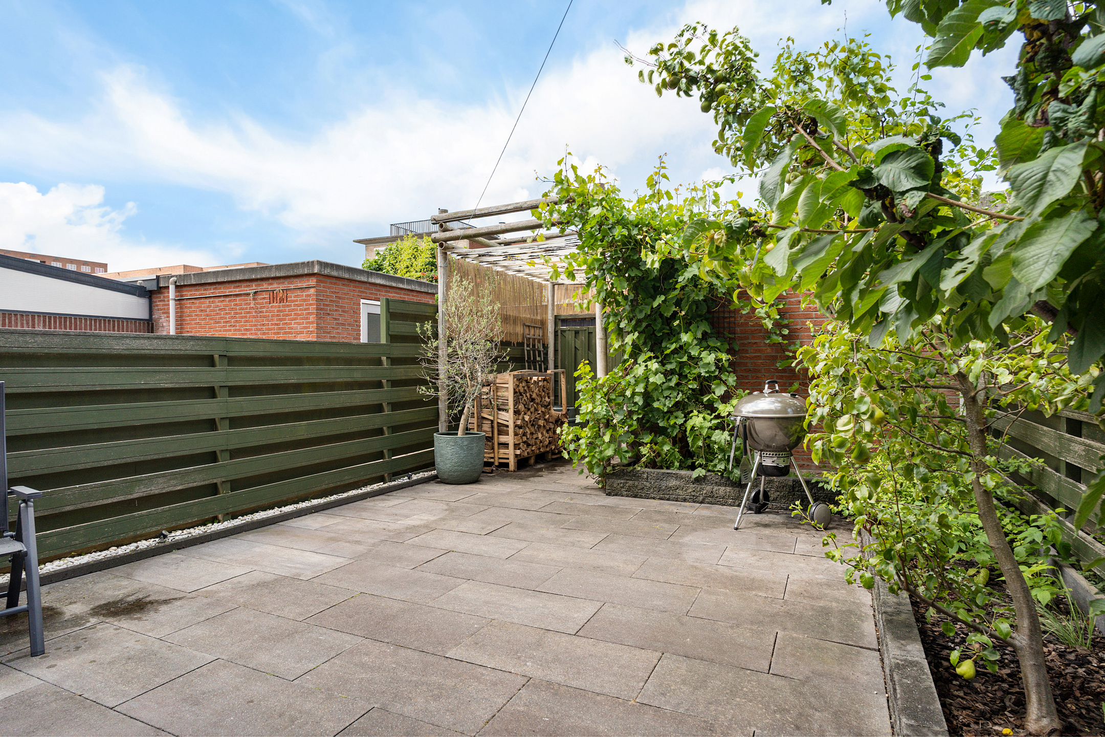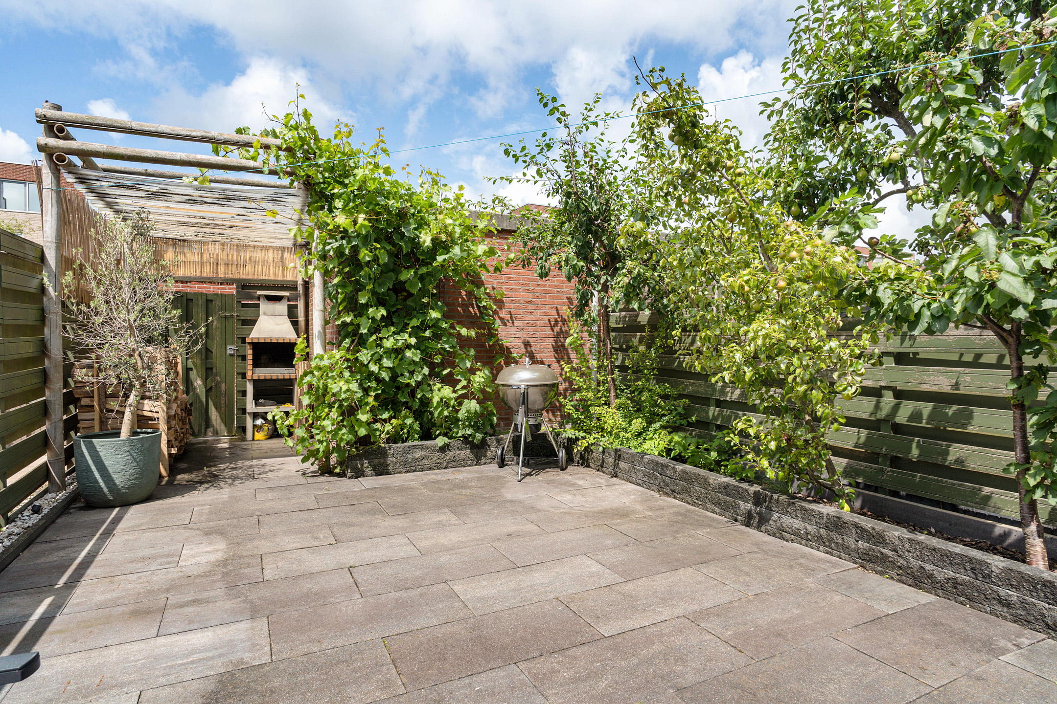 De zonnige achtertuin op het noordwesten is volledig bestraat, makkelijk in onderhoud en voorzien van sierbeplanting, een ruime berging met elektra en een achterom.