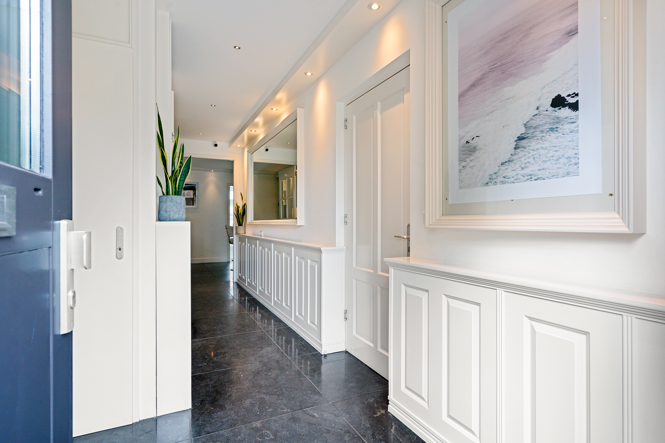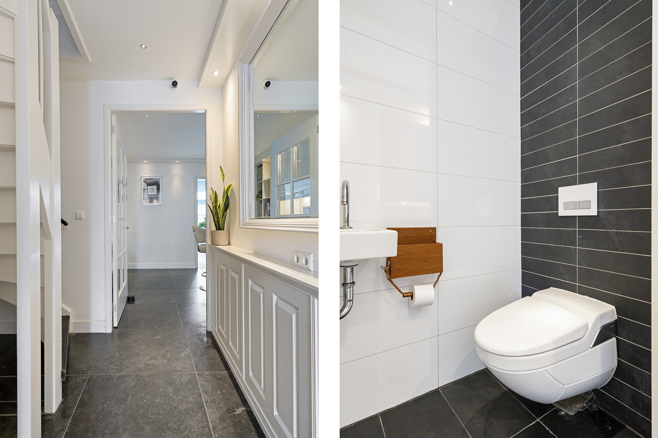 De entree straalt direct klasse uit dankzij de sfeervolle houten wandafwerking. Je vindt hier een ruime hal met een modern, separaat Geberit zelfreinigend toilet. Via de hal loop je naar de royale uitbouw aan de achterzijde – een ware blikvanger.