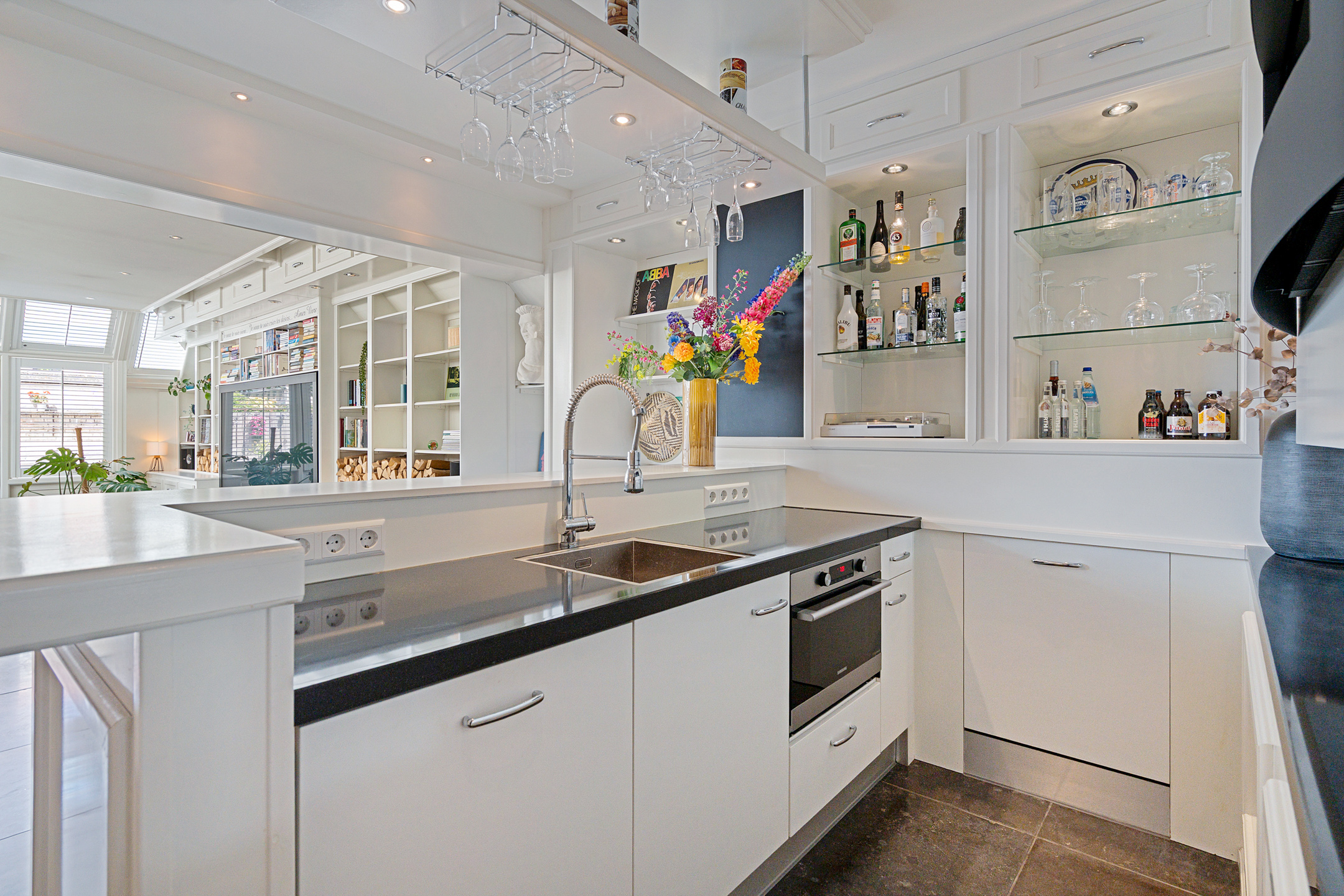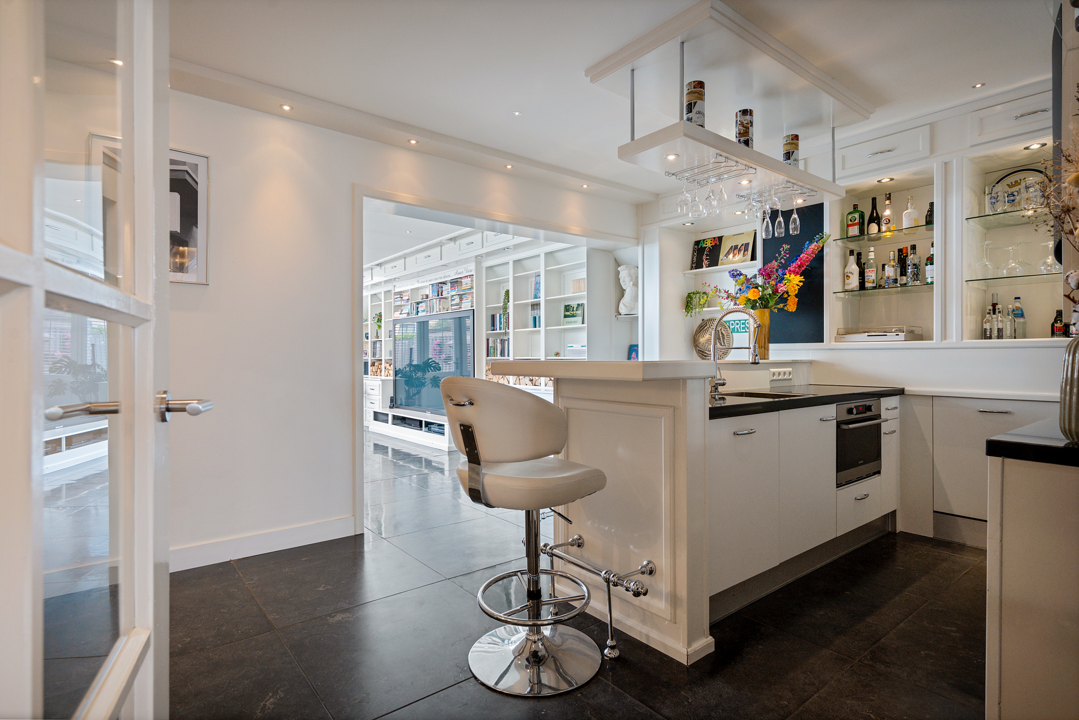 + Luxe bar in de uitbouw met ingebouwde oven, koelkast en vaatwasser