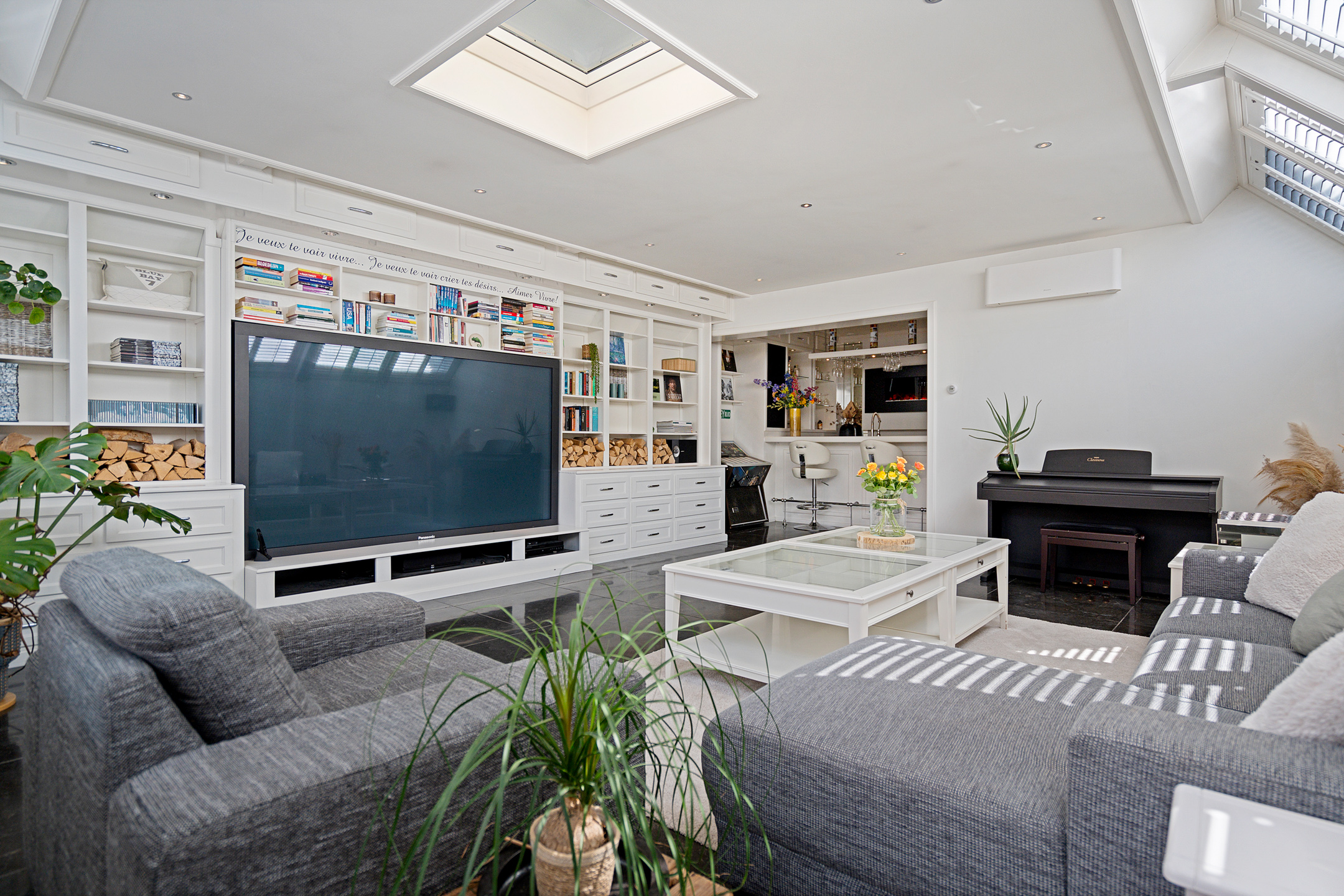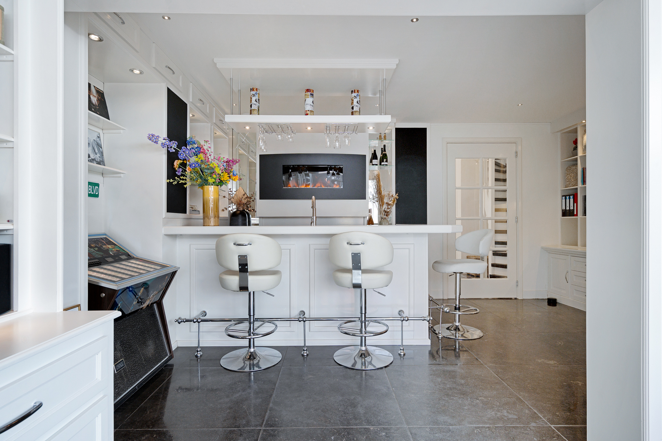 Hier is een stijlvolle bar gecreëerd met een sfeerhaard, ingebouwde oven, drankenkoelkast en vaatwasser, ideaal voor lange avonden met familie of vrienden. Een werkhoek met fraaie kastombouw en zelfs een jukebox maken deze ruimte uniek en multifunctioneel.