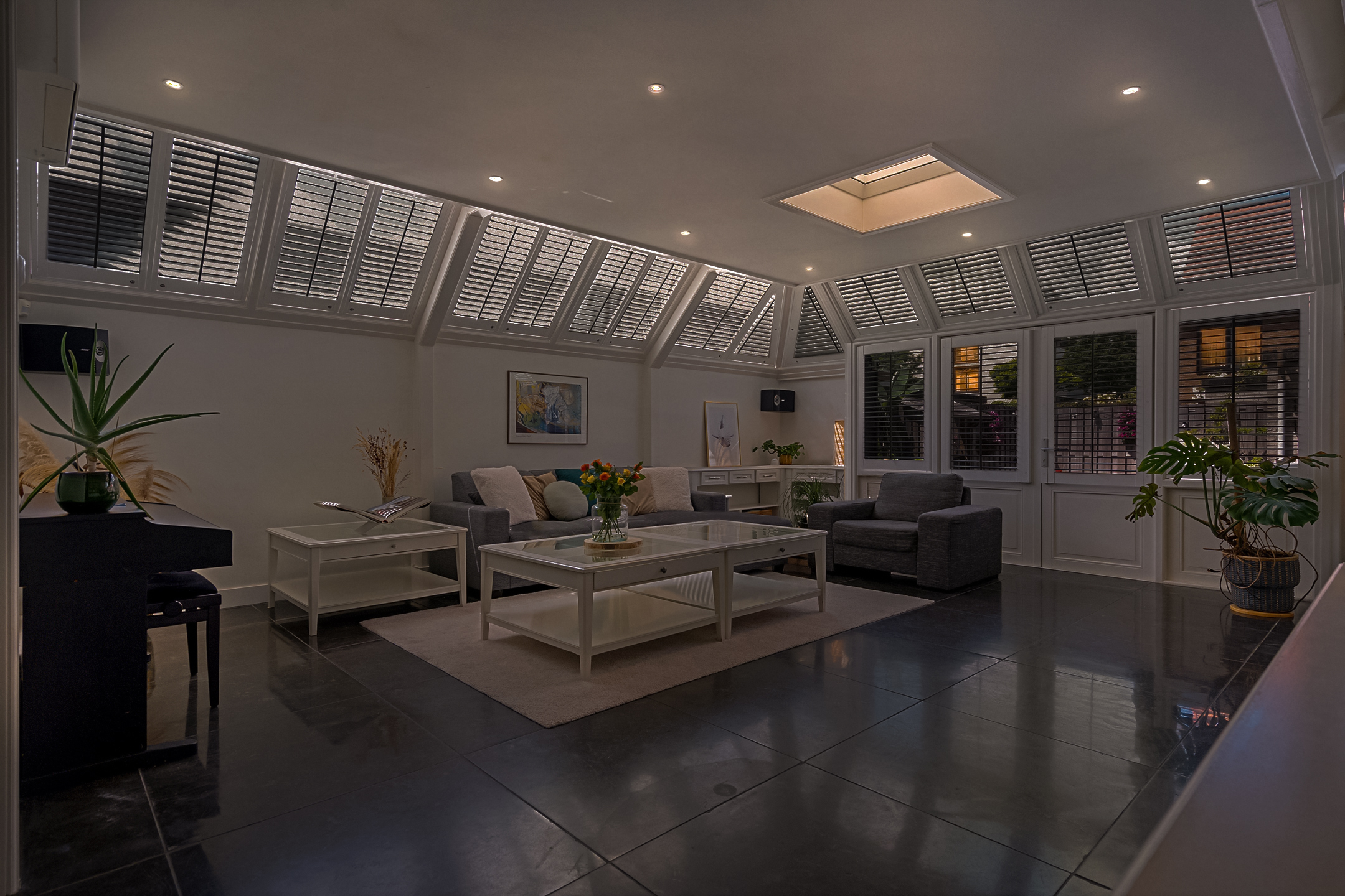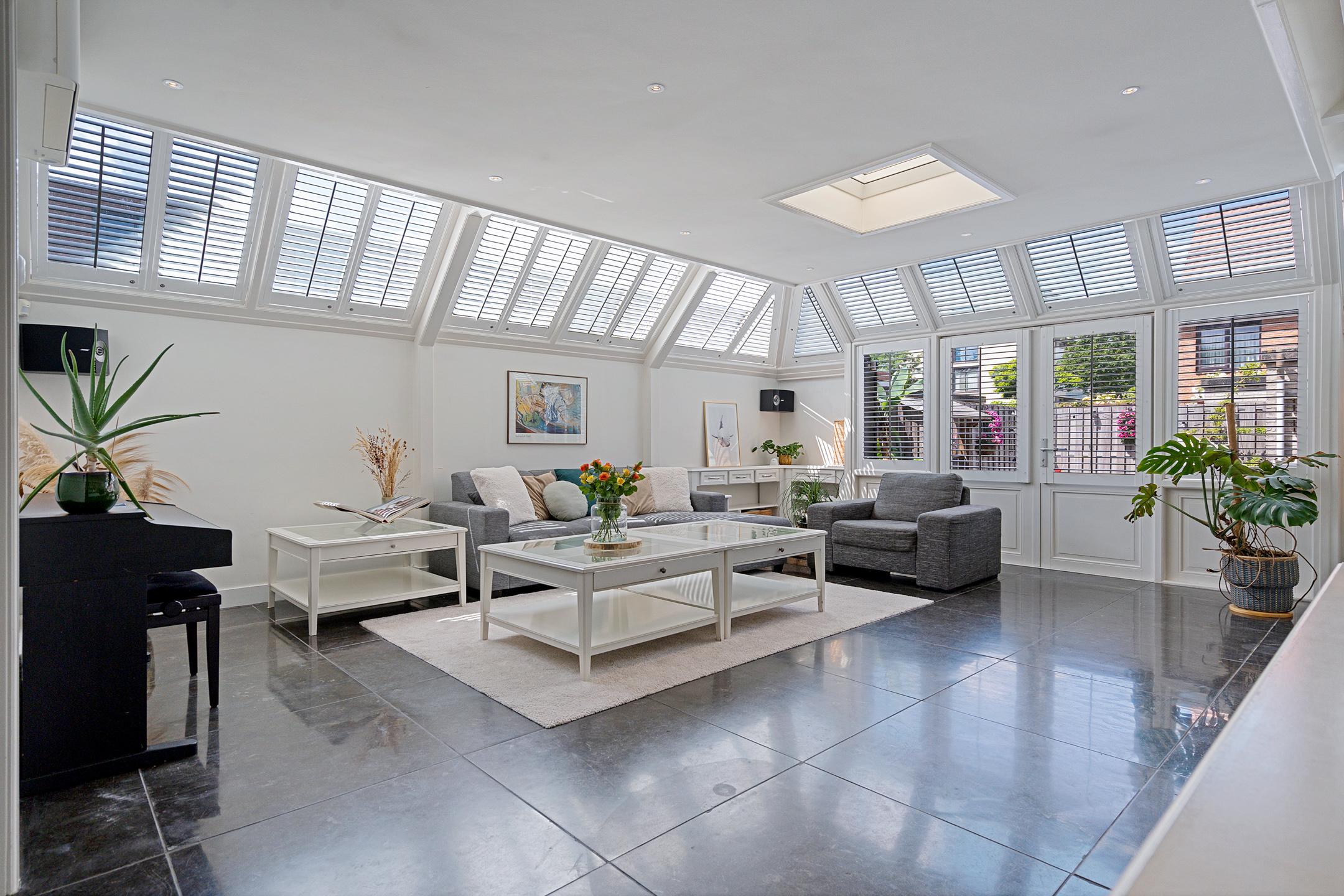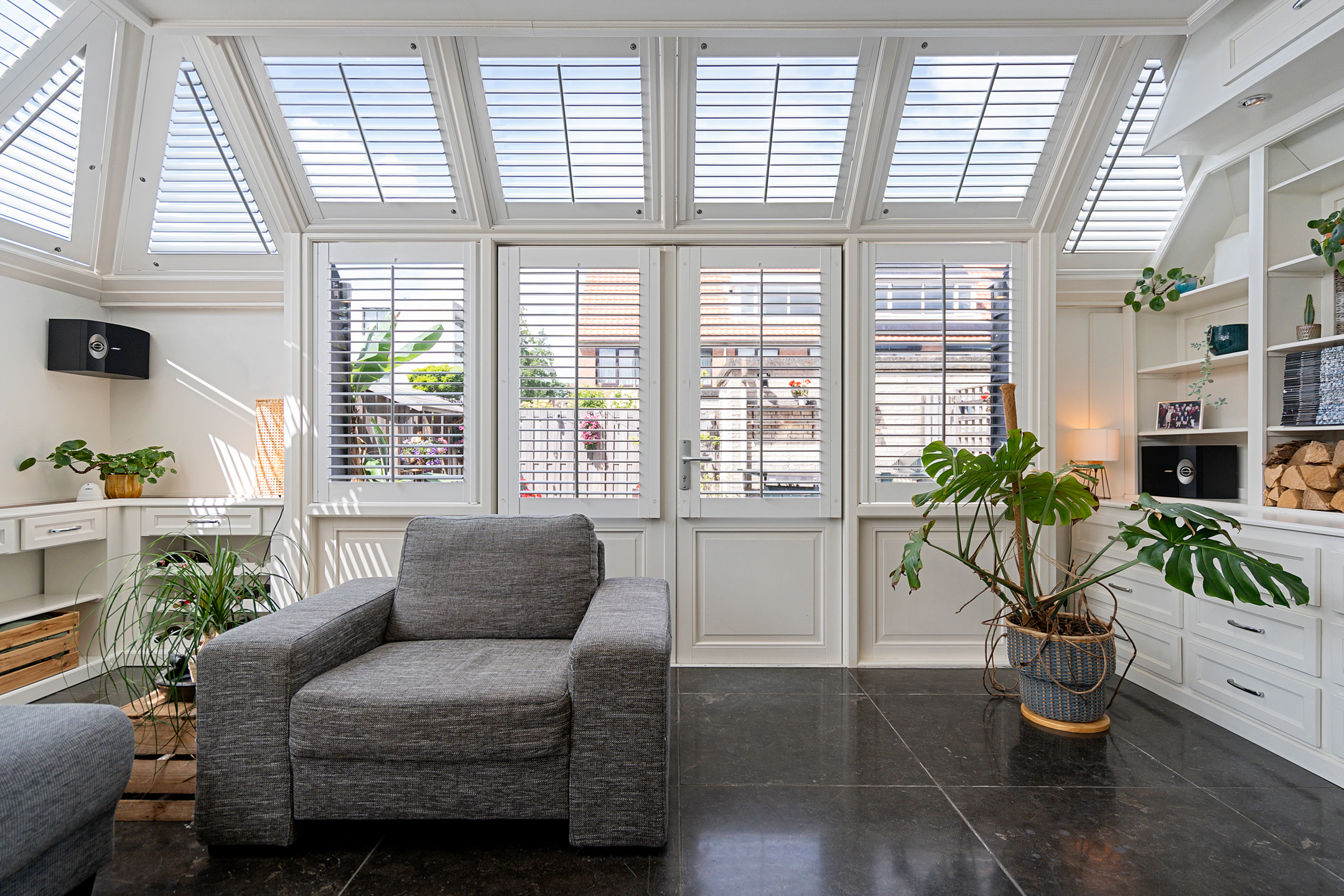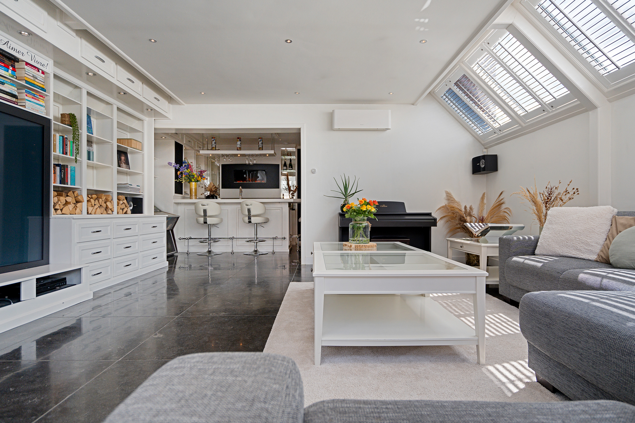 Dankzij de inbouwspotjes en de warme uitstraling van deze ruimte beleef je hier elk moment – van zonovergoten dagen tot sfeervolle avonden – in stijl.