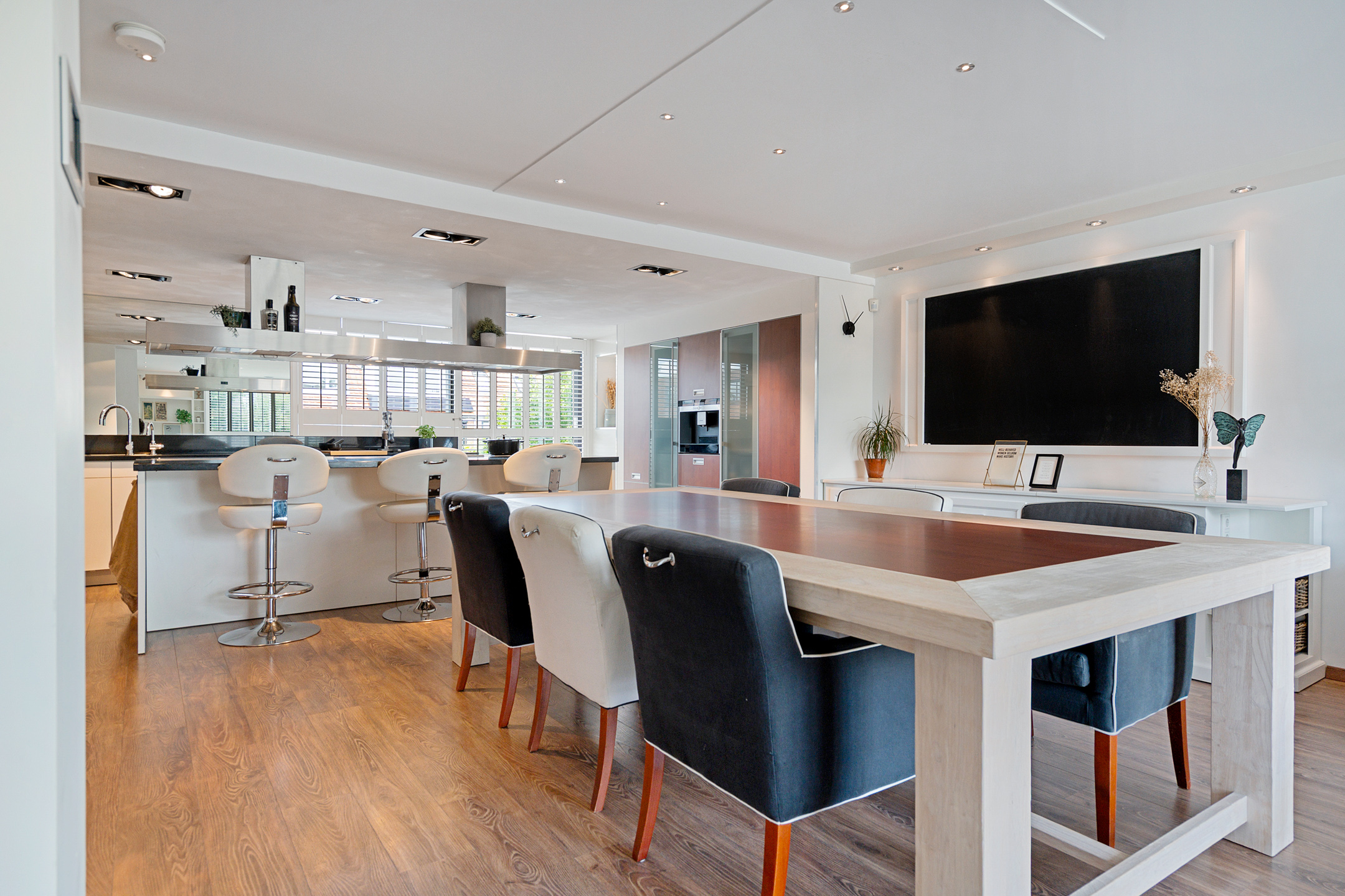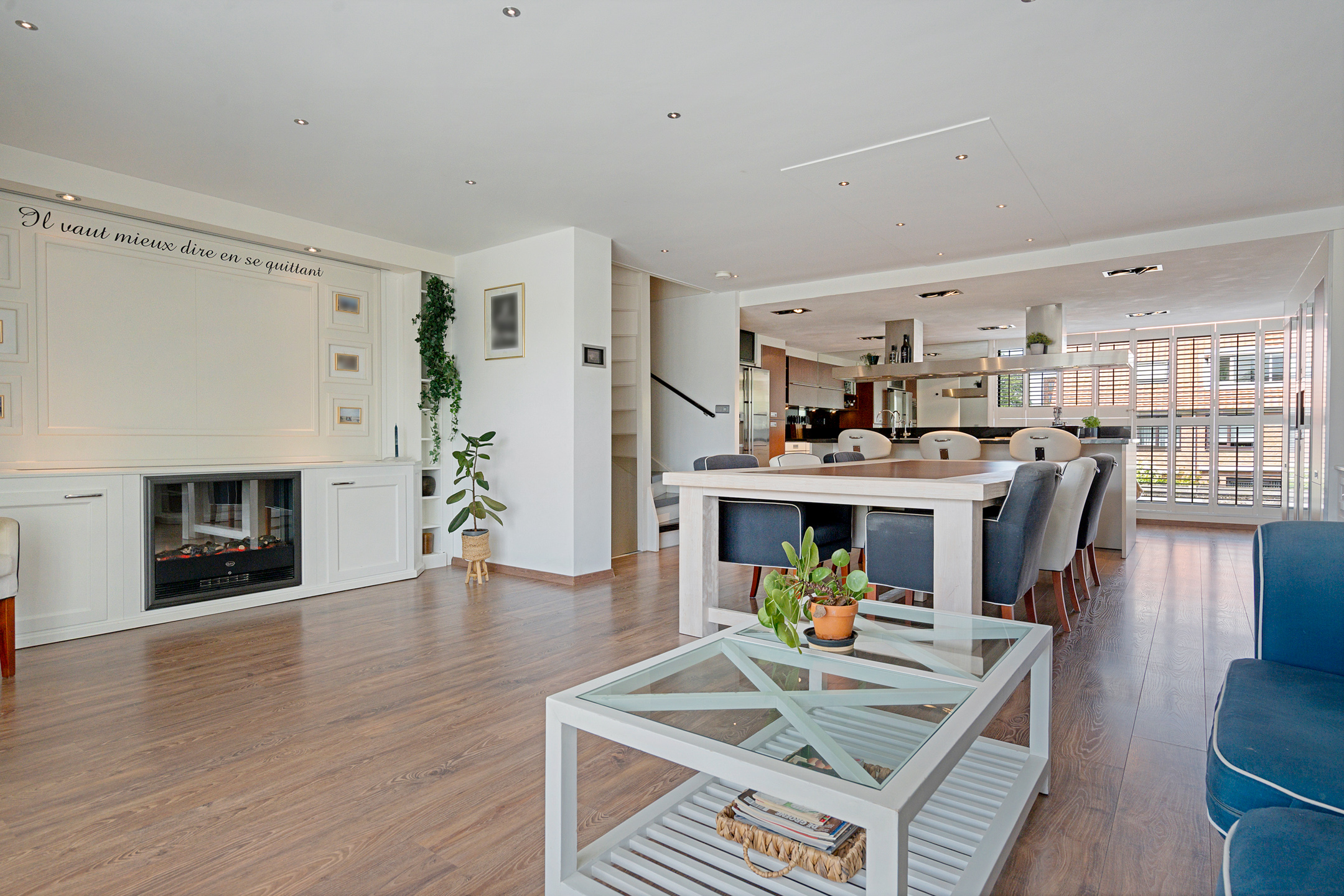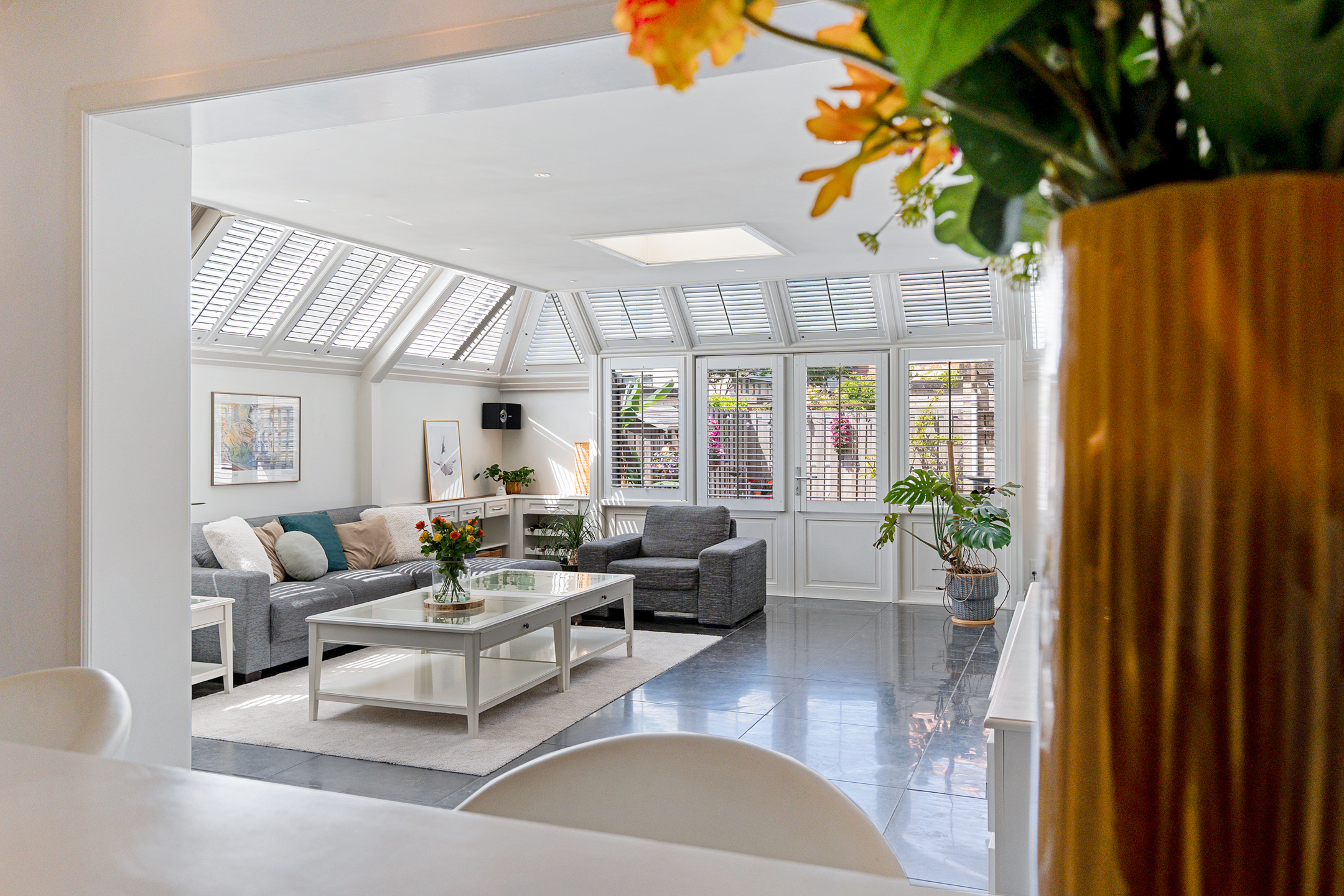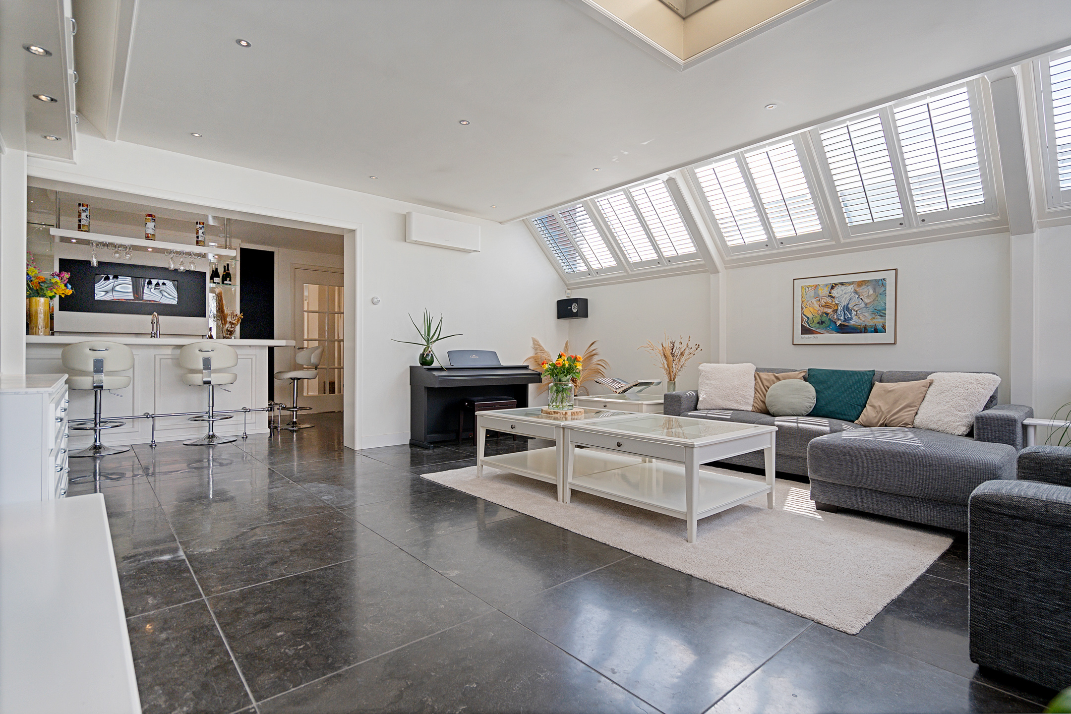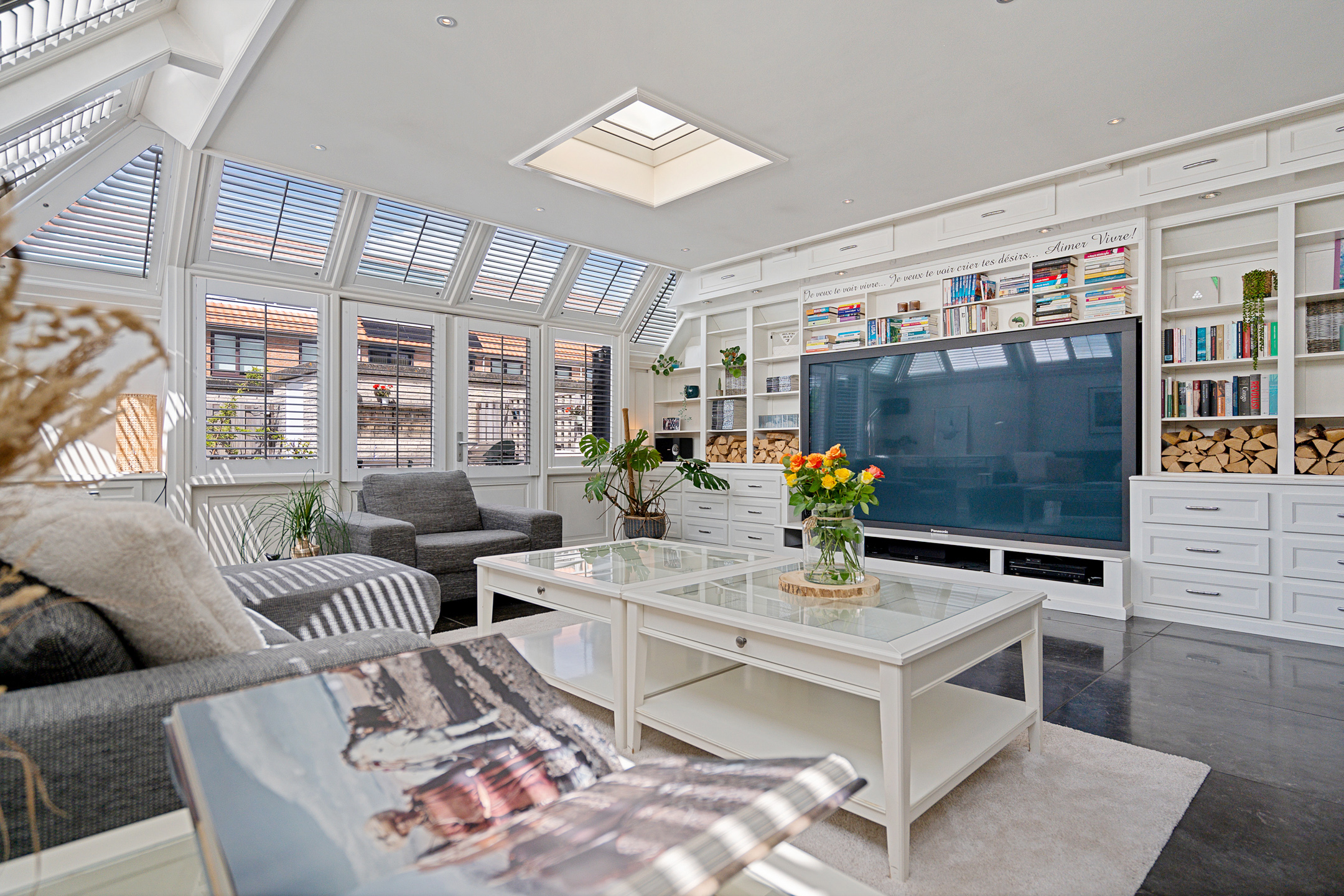 Dankzij de inbouwspotjes en de warme uitstraling van deze ruimte beleef je hier elk moment – van zonovergoten dagen tot sfeervolle avonden – in stijl.