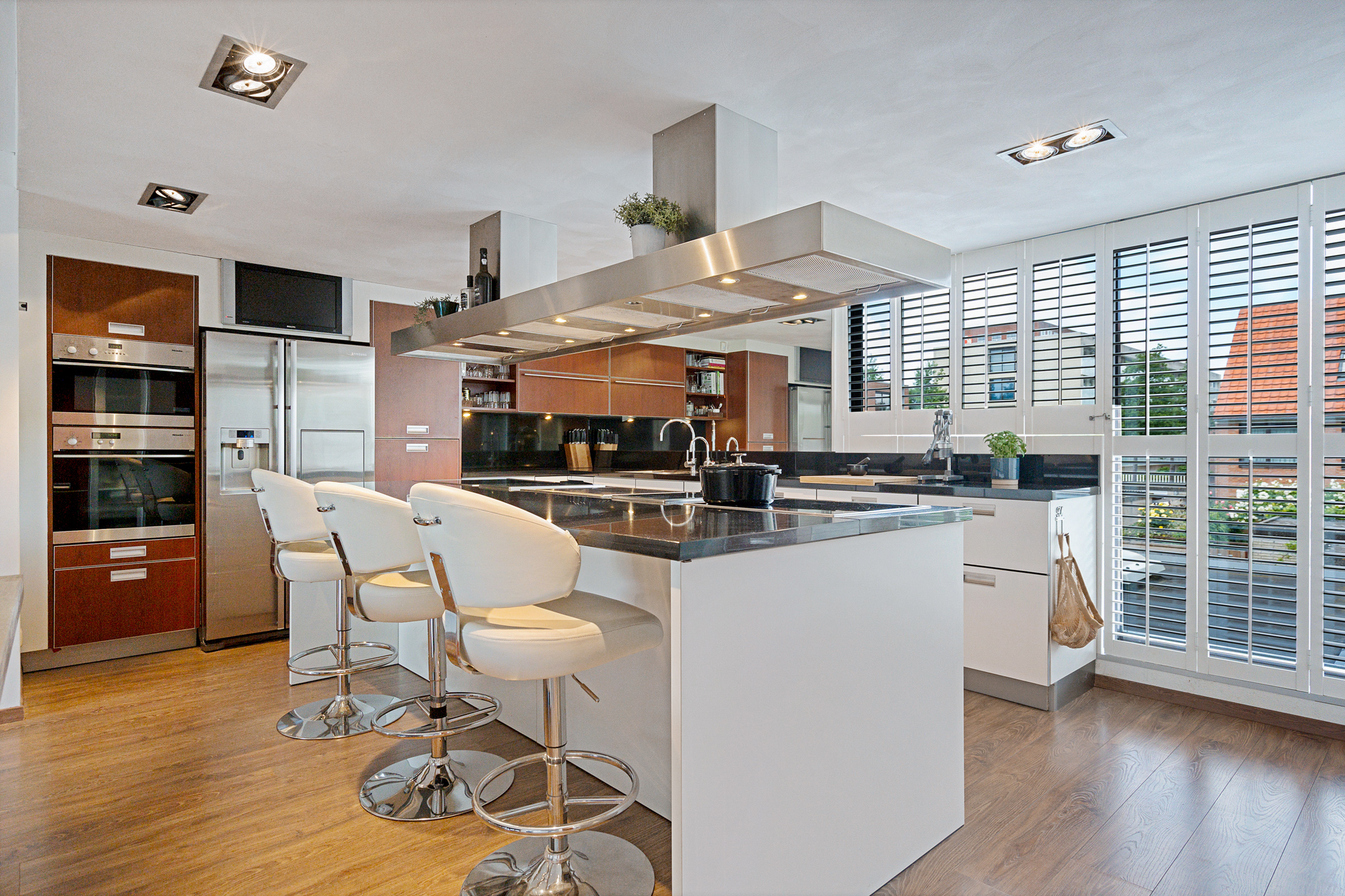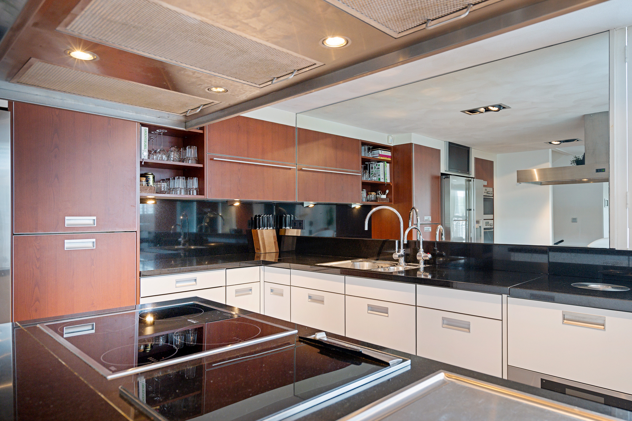 De luxe open keuken met kookeiland vormt het hart van deze etage en is werkelijk van alle gemakken voorzien: combi-ovenmagnetron, een gewone oven, stoomoven, Amerikaanse koelvriescombinatie, een koffieapparaat, twee inductiekookplaten met royale afzuigkap, twee frituurpannen, een teppanyaki, dubbele kraanopstelling waaronder een kokendwaterkraan en een grote spiegelwand.