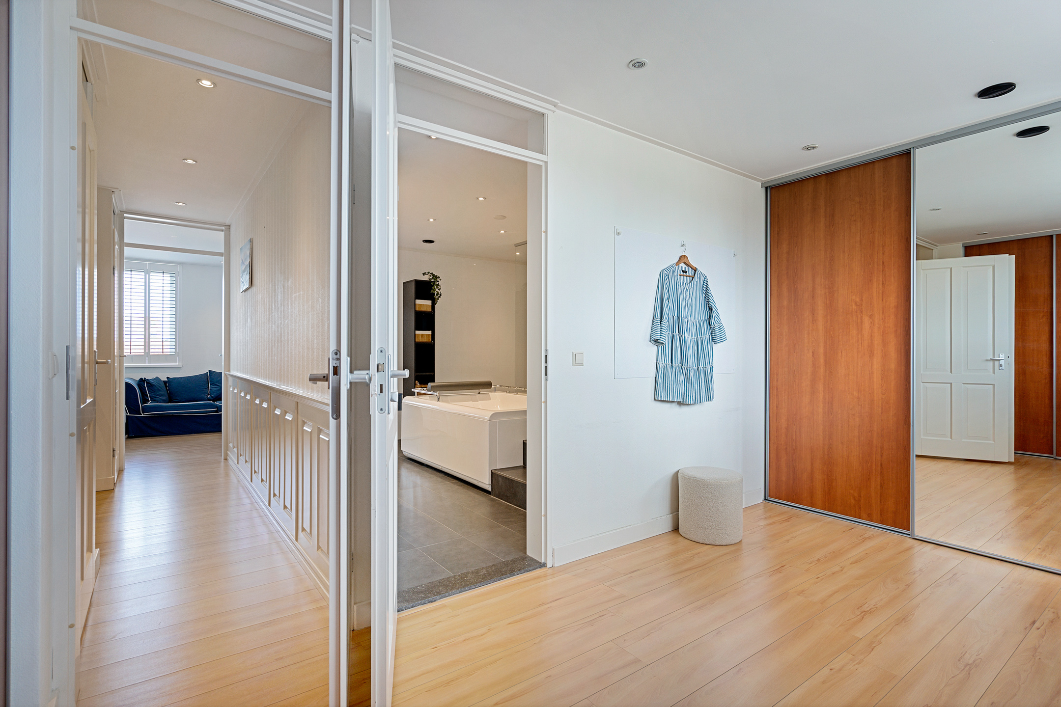 De bovenste verdieping voelt als een luxe hotelverdieping. Aan de ene zijde vind je een ruime inloopkast (voorzien van airco) deze kamer is eveneens gemakkelijk te gebruiken als extra slaapkamer, in het midden een royale luxe badkamer met een jacuzzi, dubbele regendouche, TV, dubbele wastafel en grote spiegel met spotverlichting.