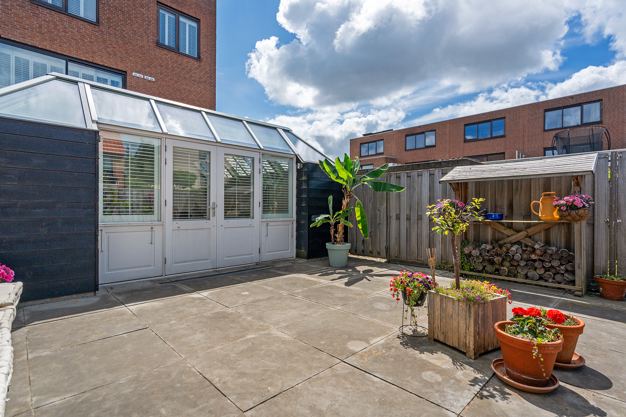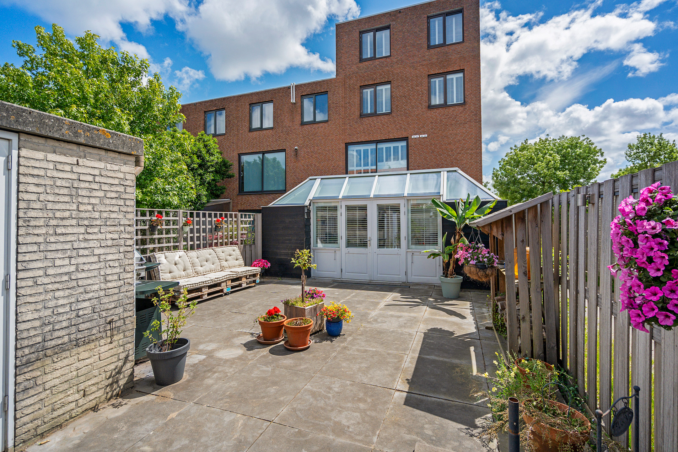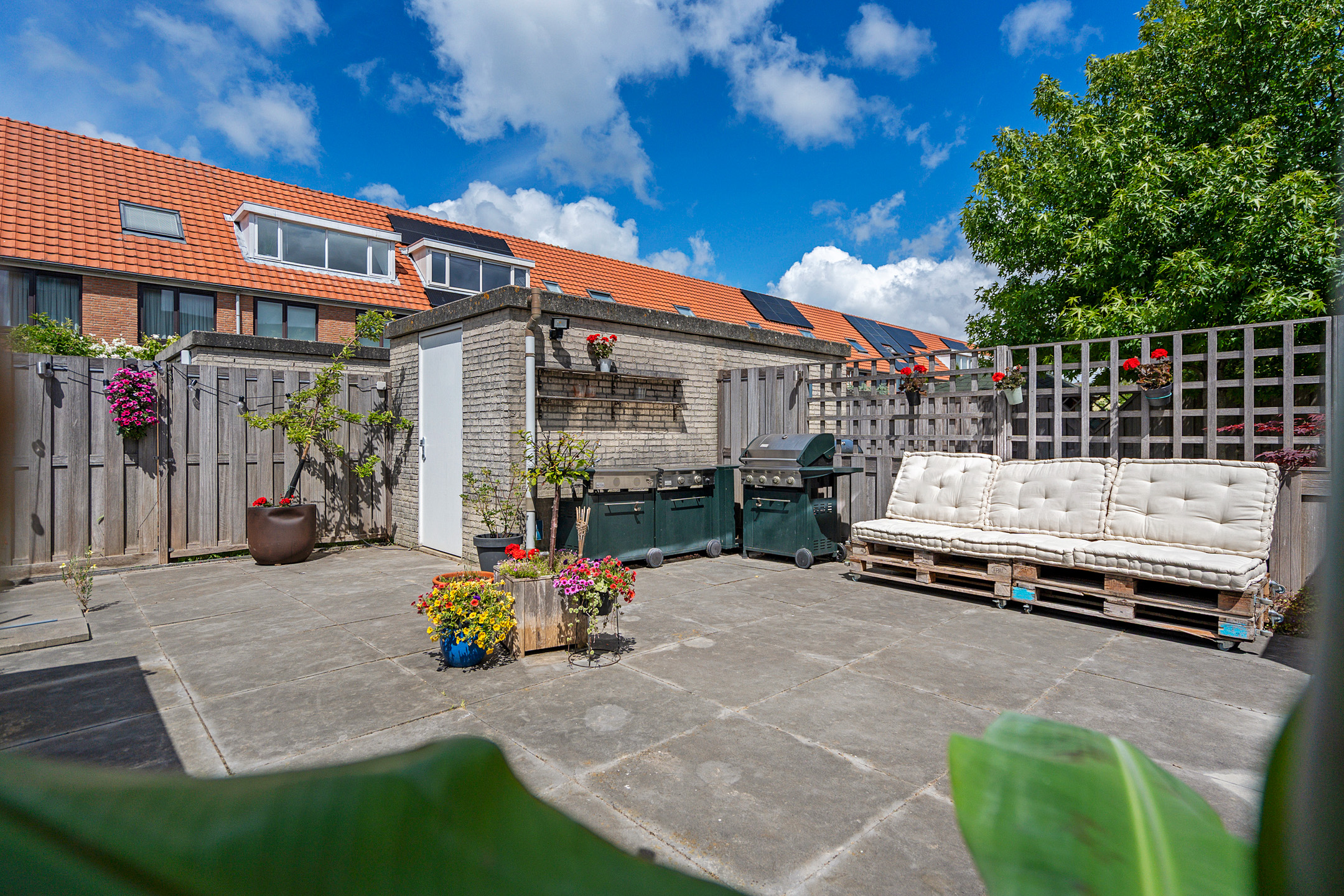 + Royale, volledig betegelde achtertuin op het westen met berging en achterom
