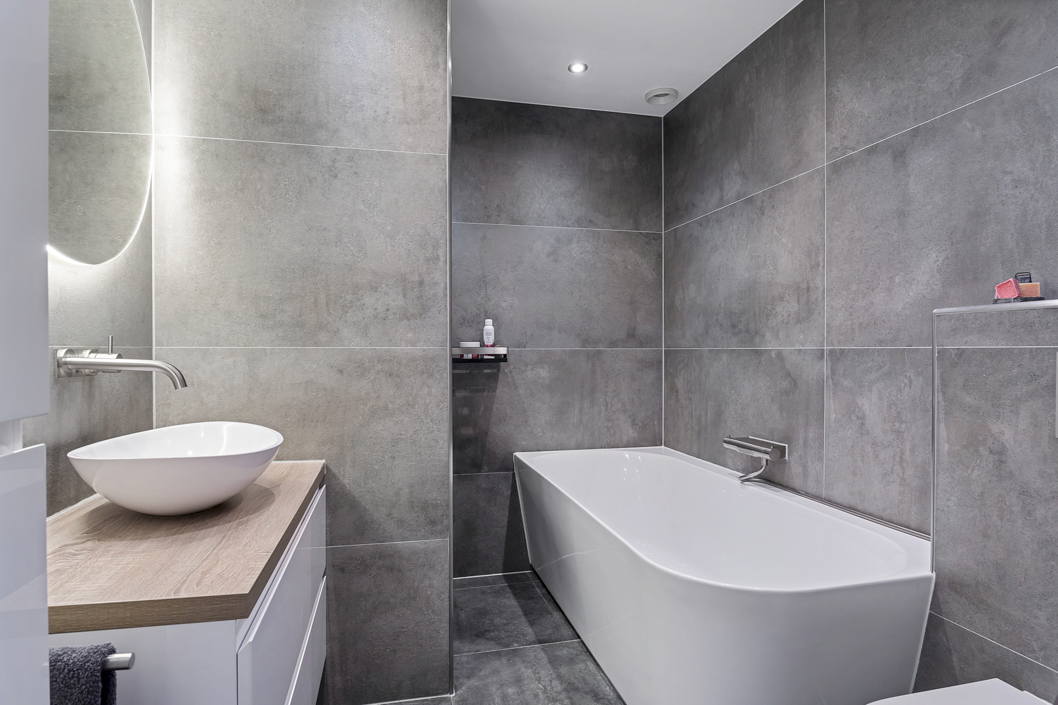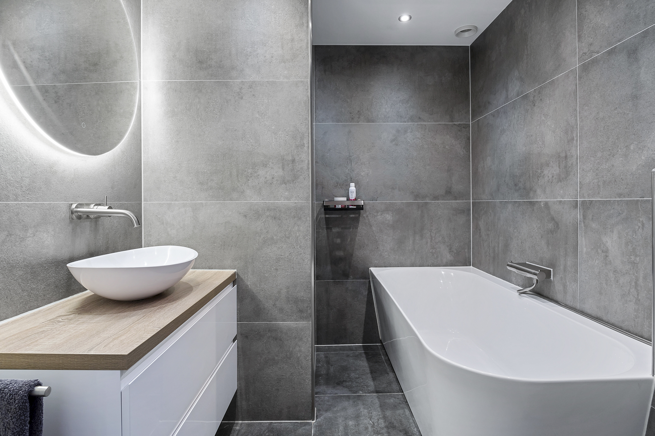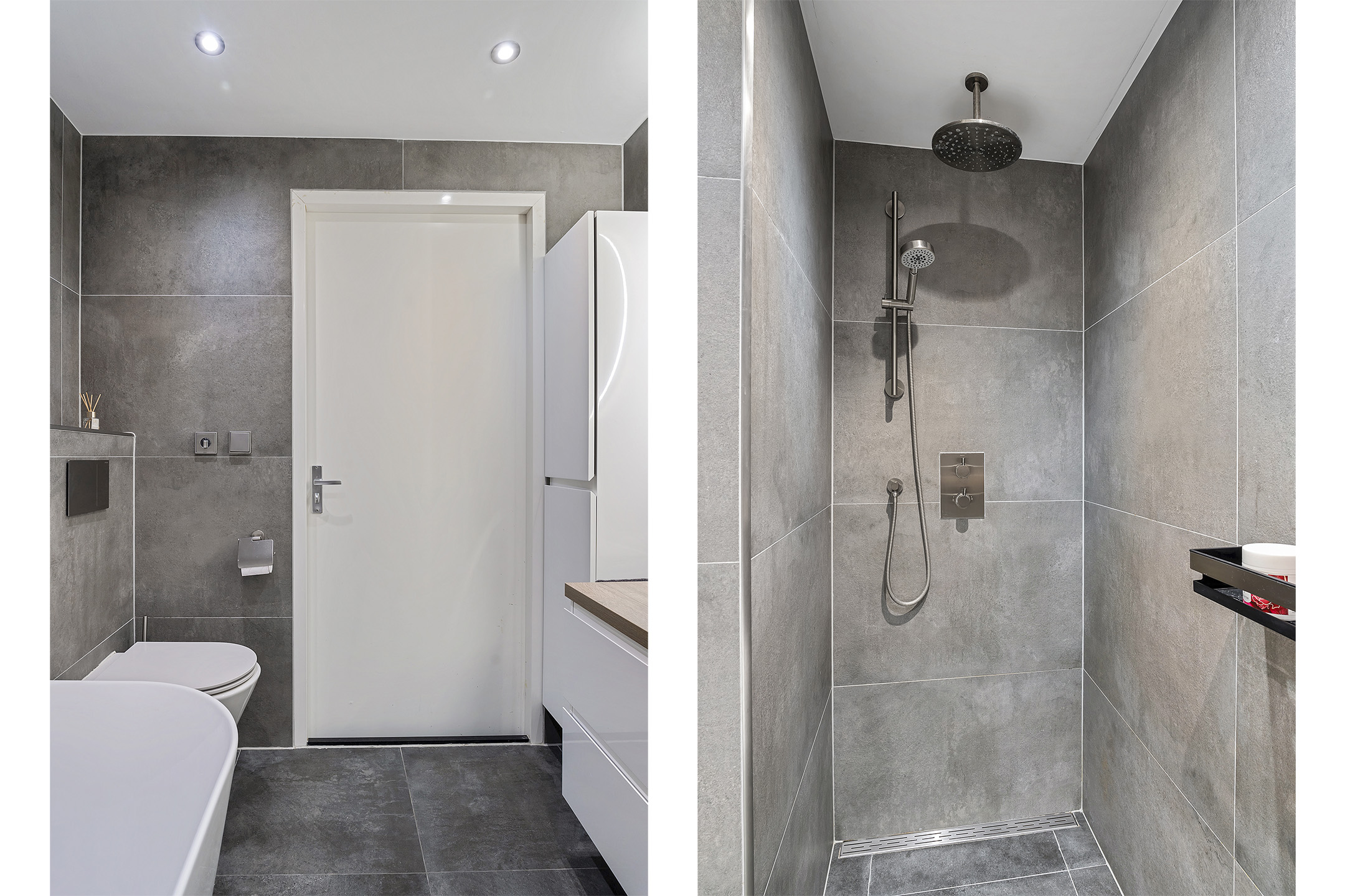 De moderne badkamer is van alle gemakken voorzien. Met stijlvolle wand- en vloertegels, een ruime inloopdouche, een ligbad, een wastafelmeubel en een toilet, ontbreekt het je hier aan niets.
