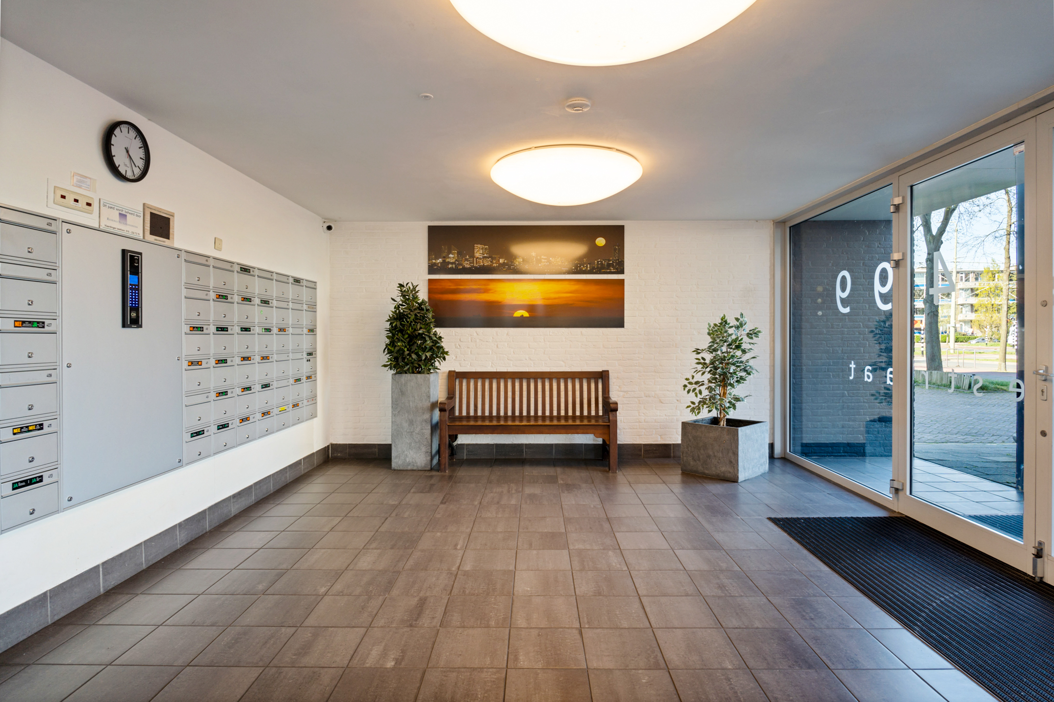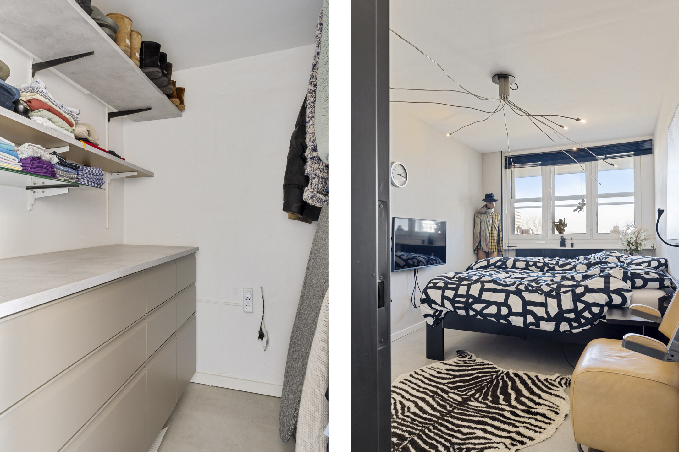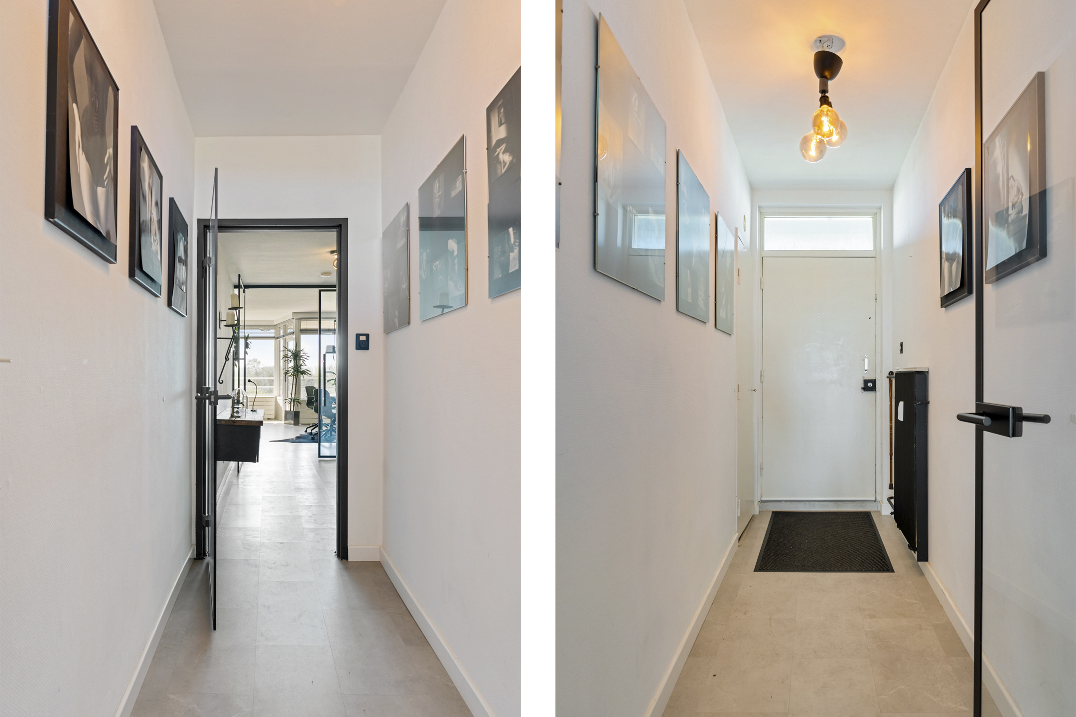 Je komt binnen via een verzorgde, gezamenlijke entree. In de hal van de woning valt meteen de logische en praktische indeling op. Aan de linkerkant ligt de ruime slaapkamer aan de koele noordzijde, voorzien van een luxe walk-in closet – perfect voor wie extra bergruimte en comfort zoekt.