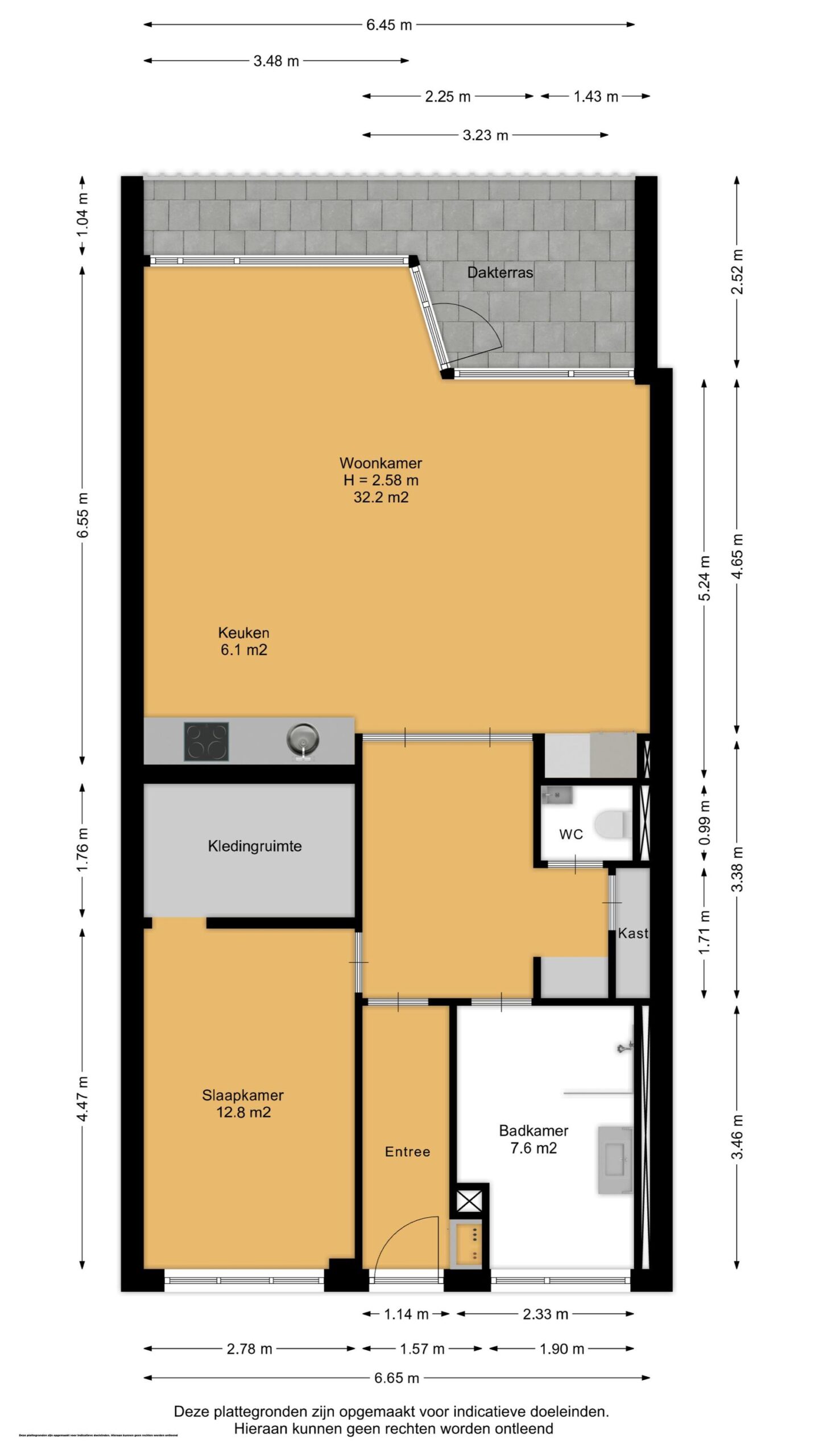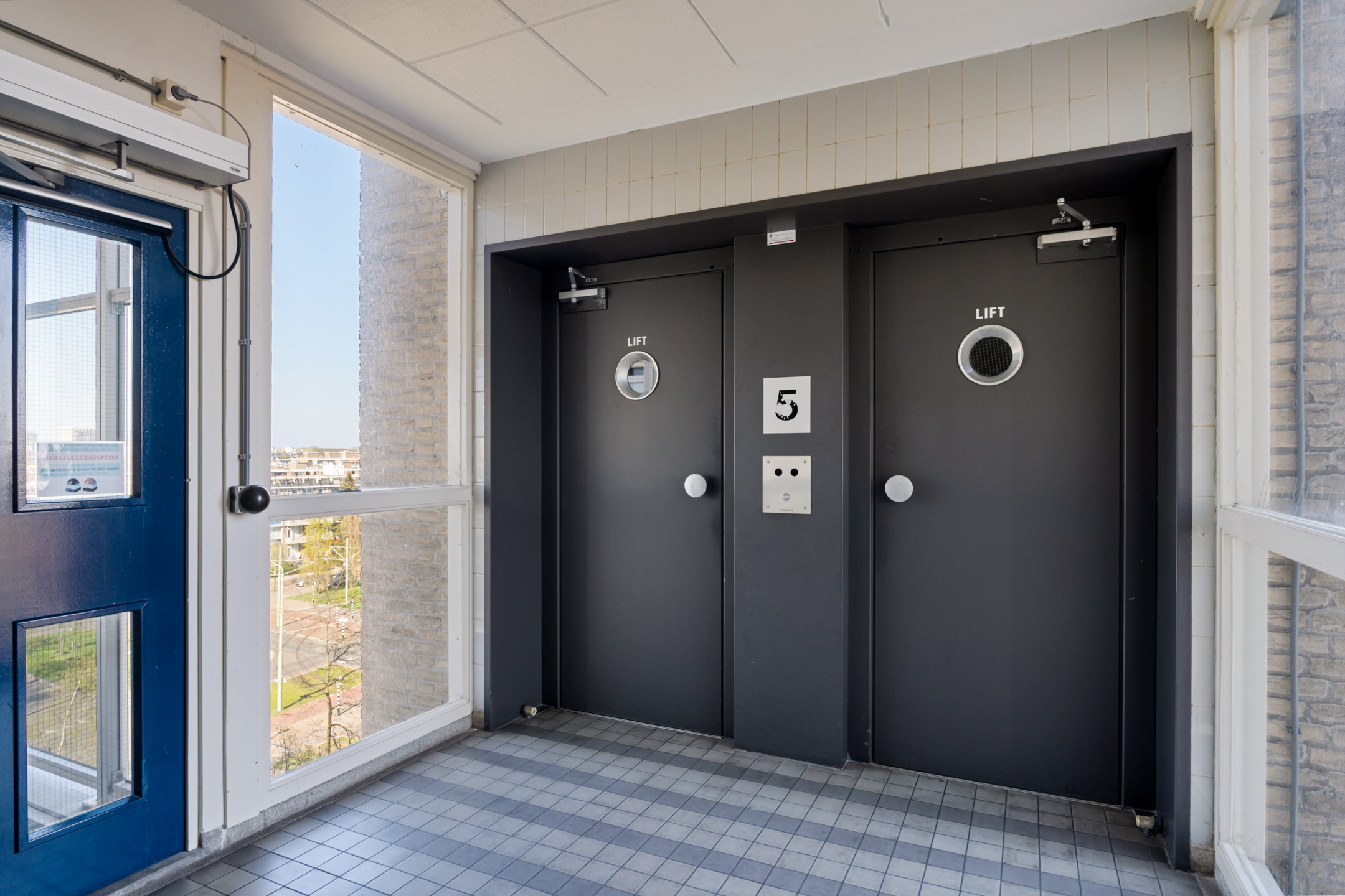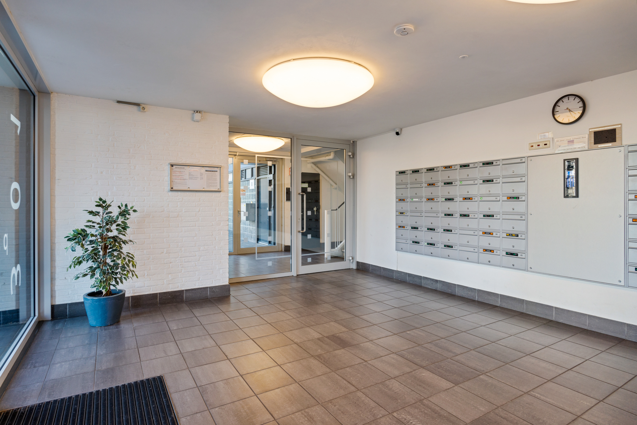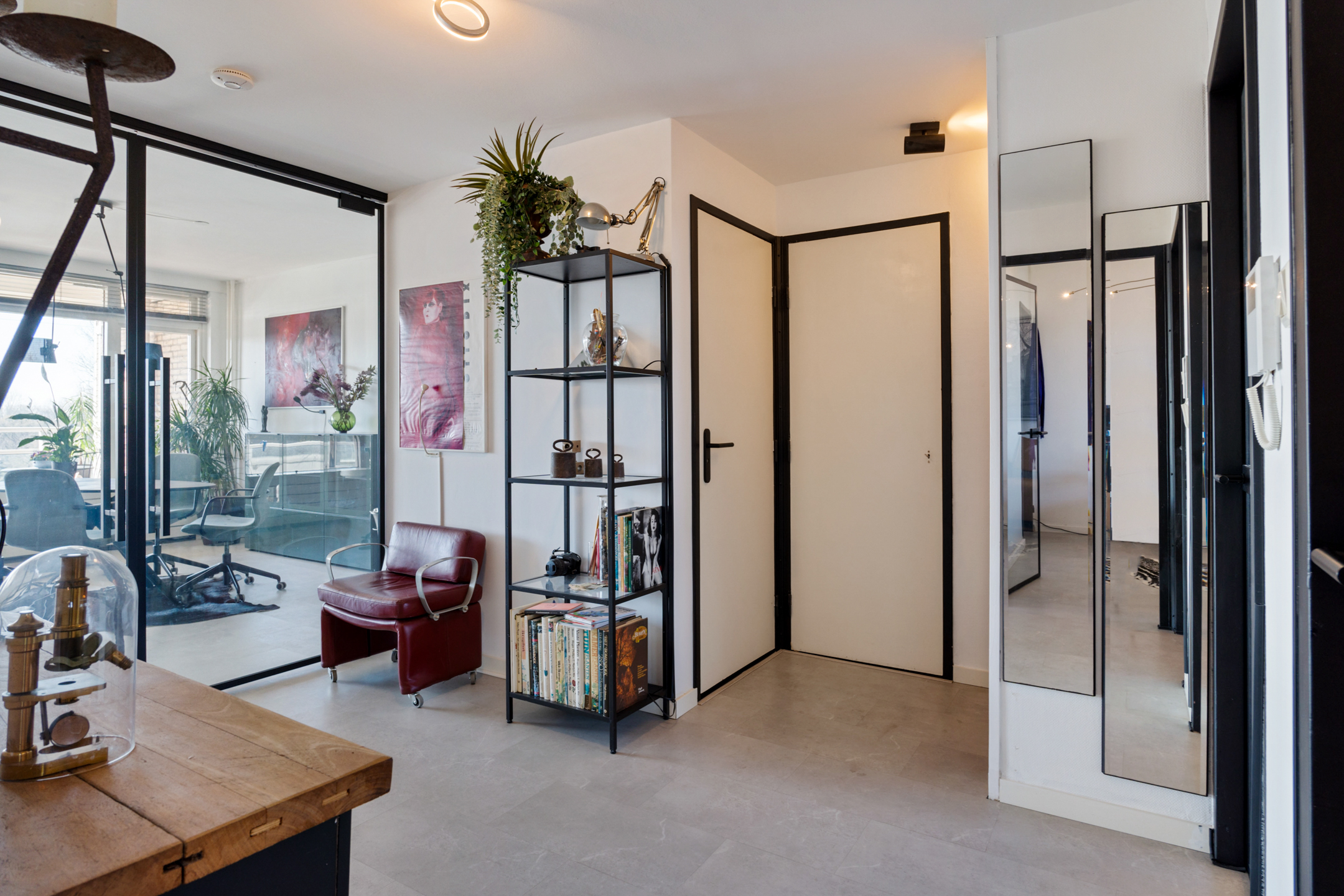 Je komt binnen via een verzorgde, gezamenlijke entree. In de hal van de woning valt meteen de logische en praktische indeling op. Aan de linkerkant ligt de ruime slaapkamer aan de koele noordzijde, voorzien van een luxe walk-in closet – perfect voor wie extra bergruimte en comfort zoekt.