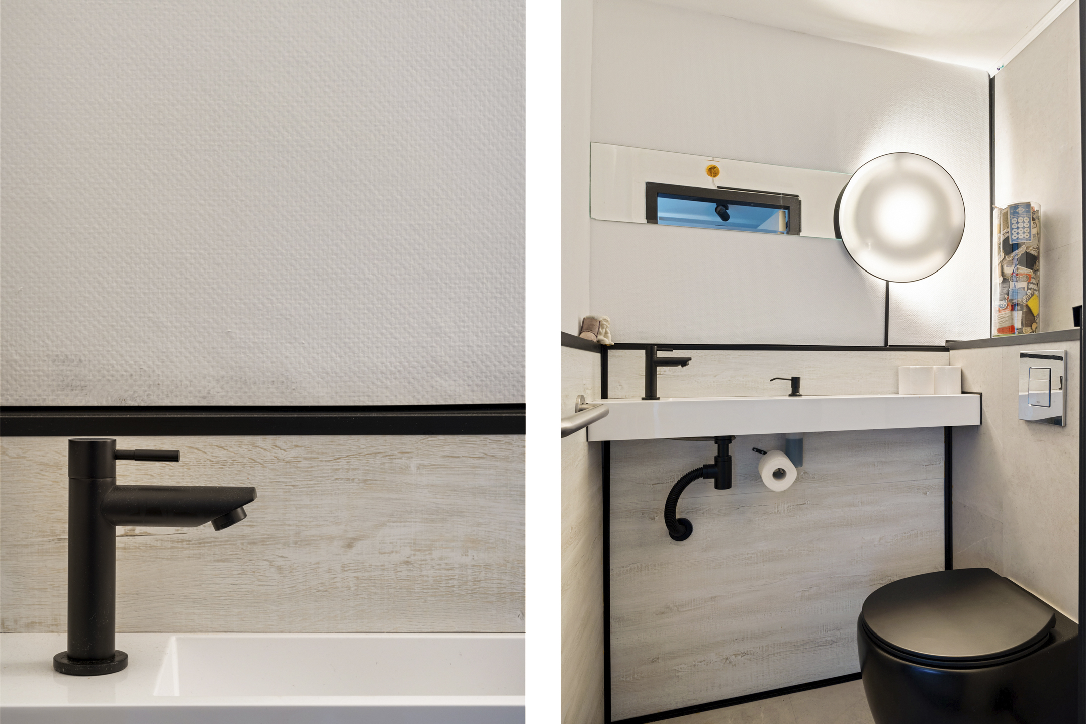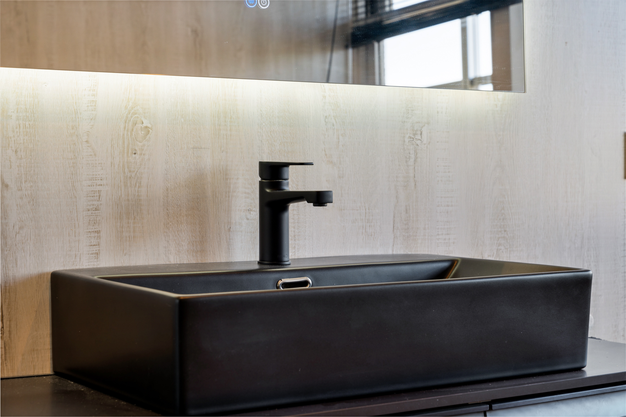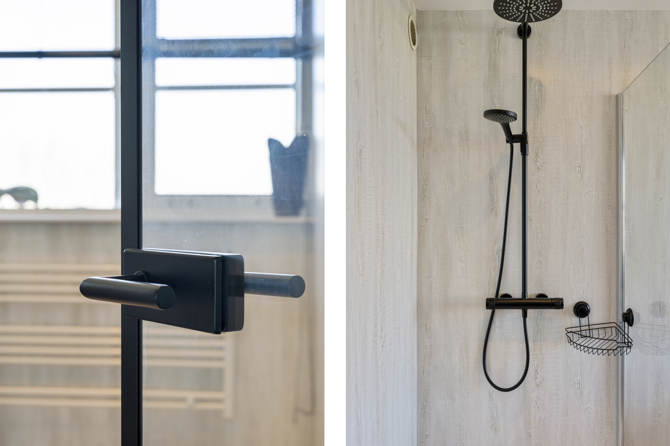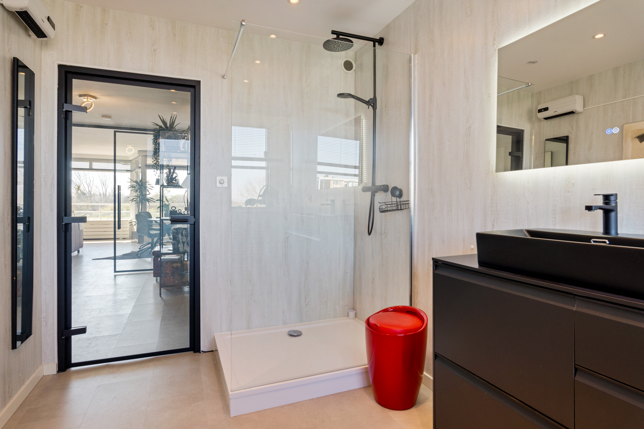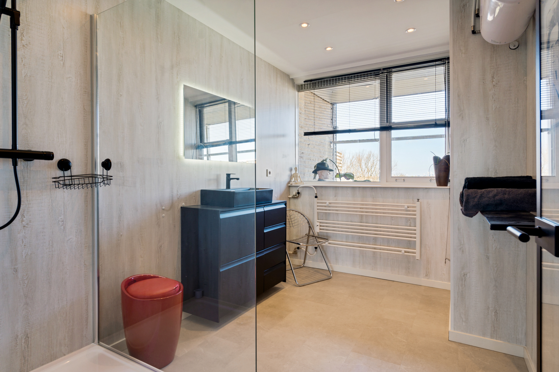 De badkamer is strak, modern en met oog voor detail afgewerkt. Je vindt hier een inloopdouche, een stijlvol wastafelmeubel en ruimte voor een wasmachine.