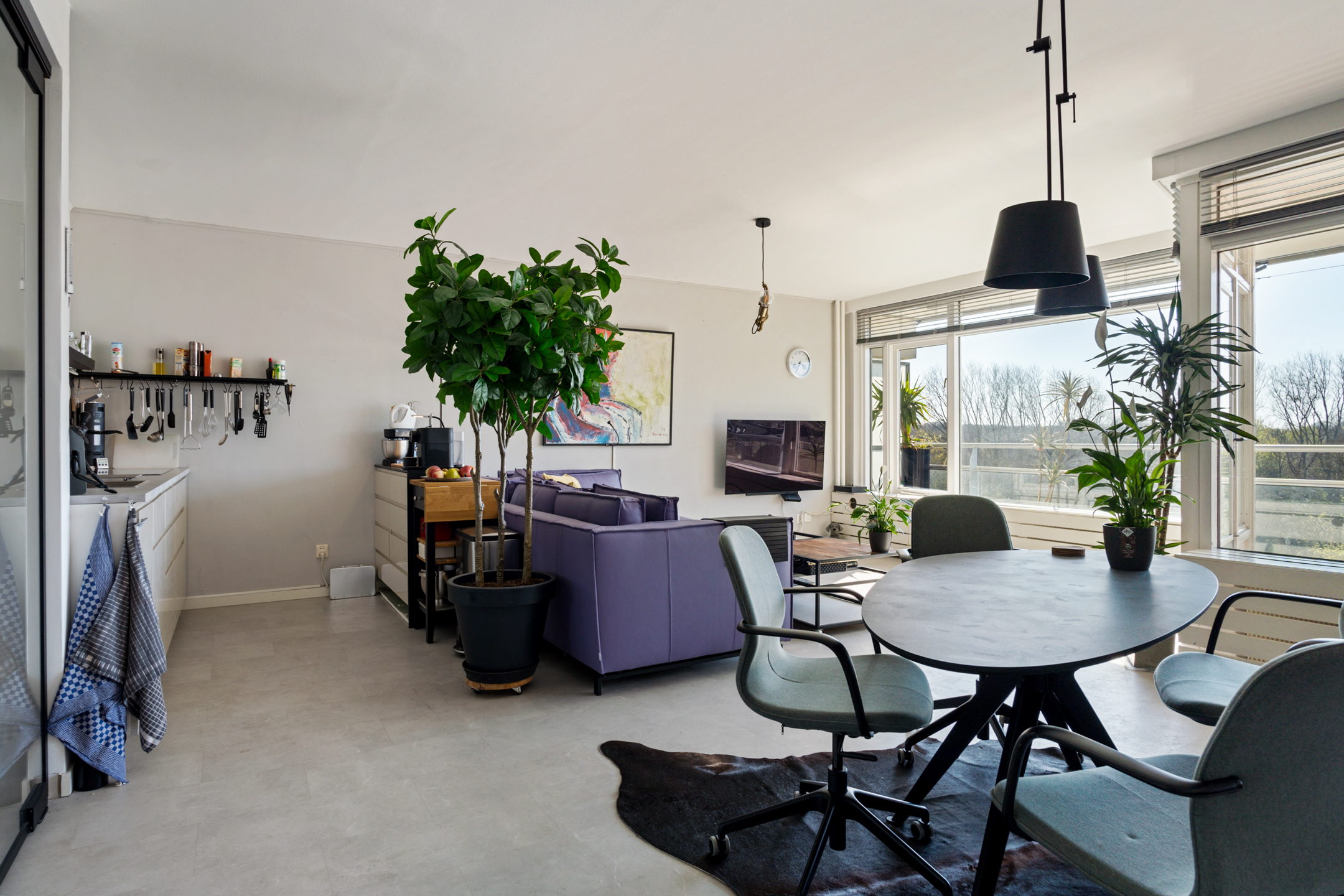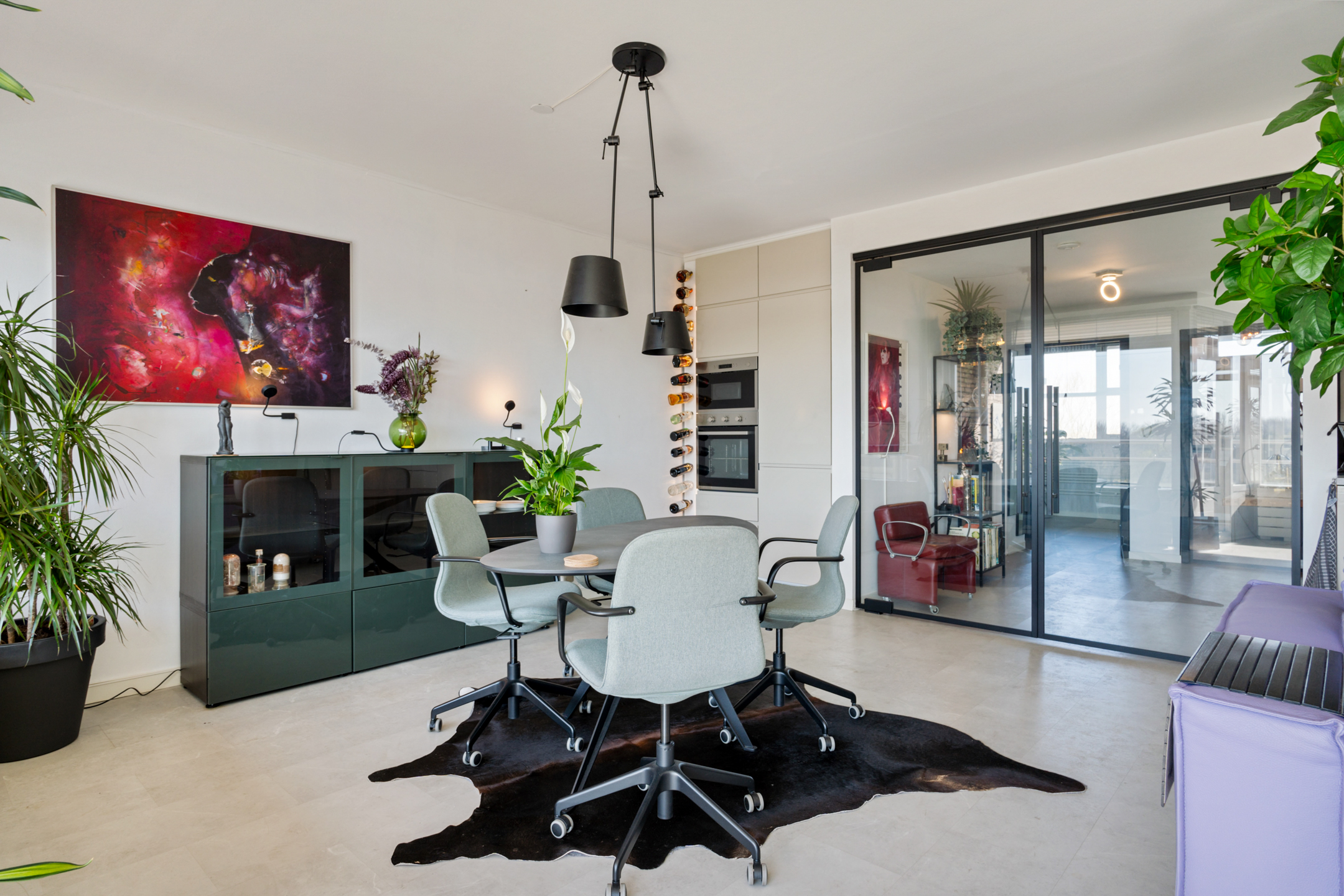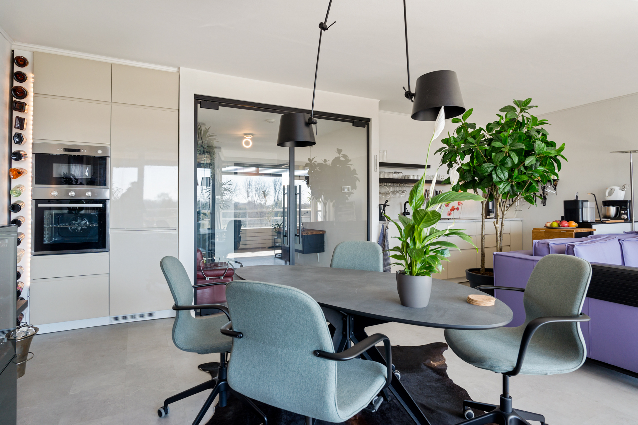 Aan de achterzijde bevindt zich de open keuken met gezellig eetgedeelte. De keuken is compleet uitgerust met inbouwapparatuur zoals een oven, kookplaat, afzuigkap en vaatwasser. Openslaande deuren geven toegang tot het zonnige balkon van circa 10 m², dat zich over de volle breedte van het appartement uitstrekt. Hier zit je in alle rust, met vrij uitzicht en volop privacy.