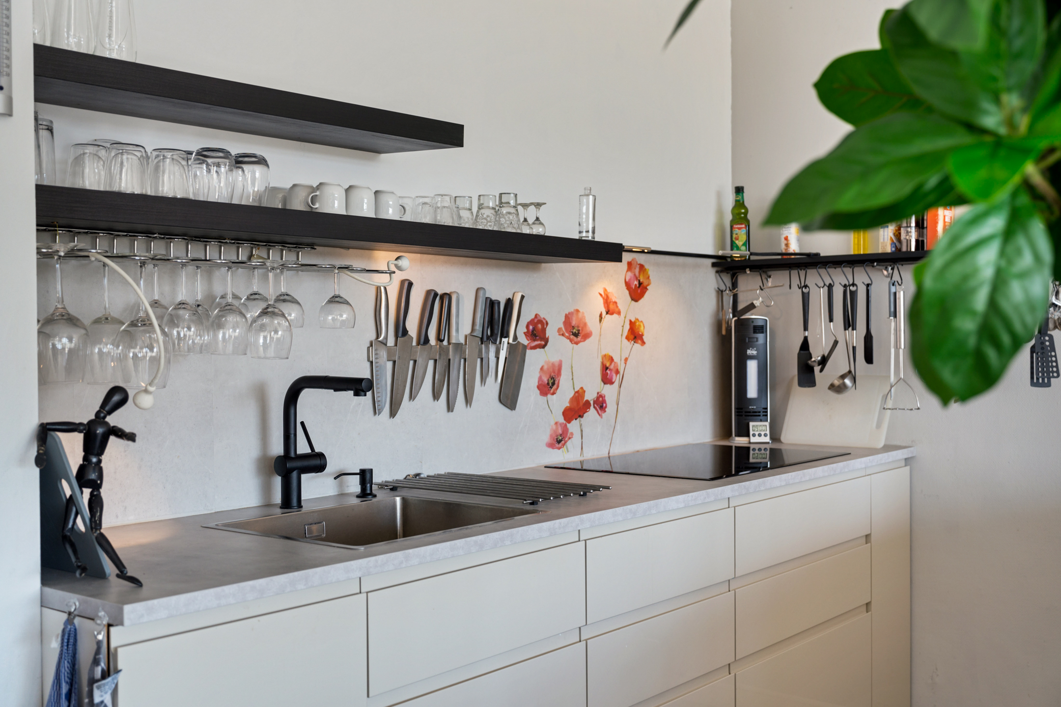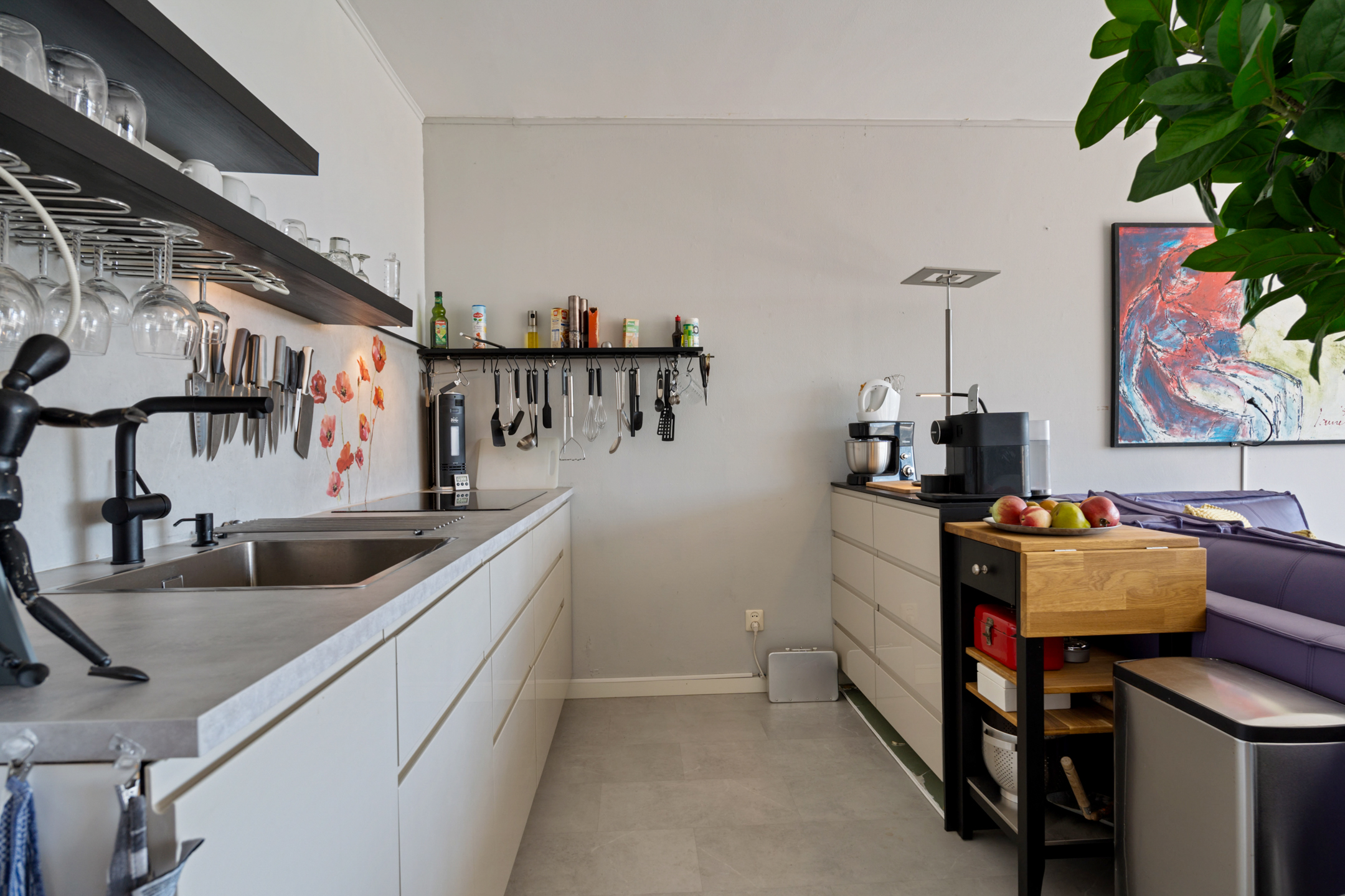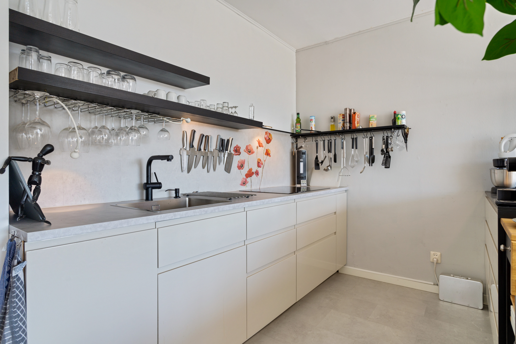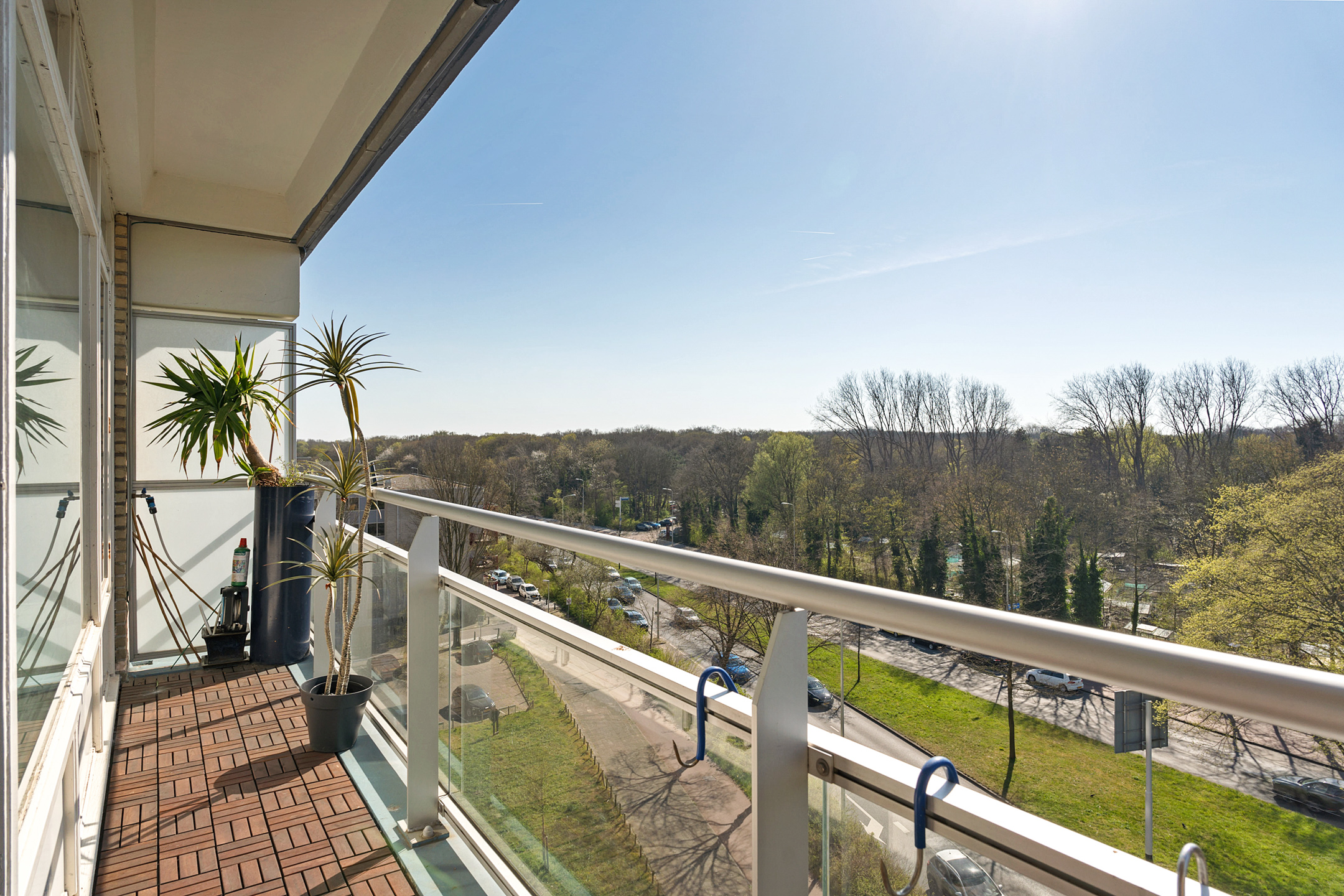 Aan de achterzijde bevindt zich de open keuken met gezellig eetgedeelte. De keuken is compleet uitgerust met inbouwapparatuur zoals een oven, kookplaat, afzuigkap en vaatwasser. Openslaande deuren geven toegang tot het zonnige balkon van circa 10 m², dat zich over de volle breedte van het appartement uitstrekt. Hier zit je in alle rust, met vrij uitzicht en volop privacy.