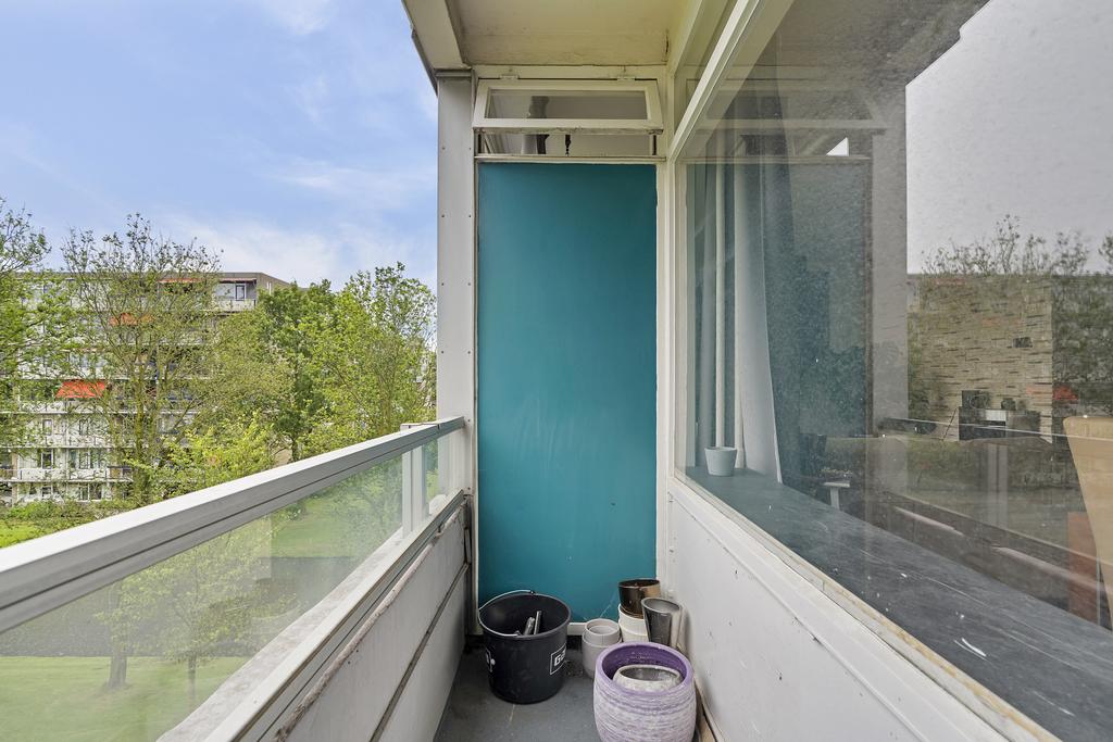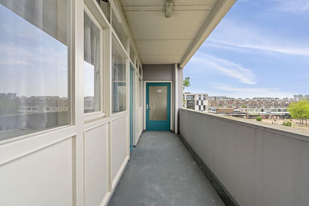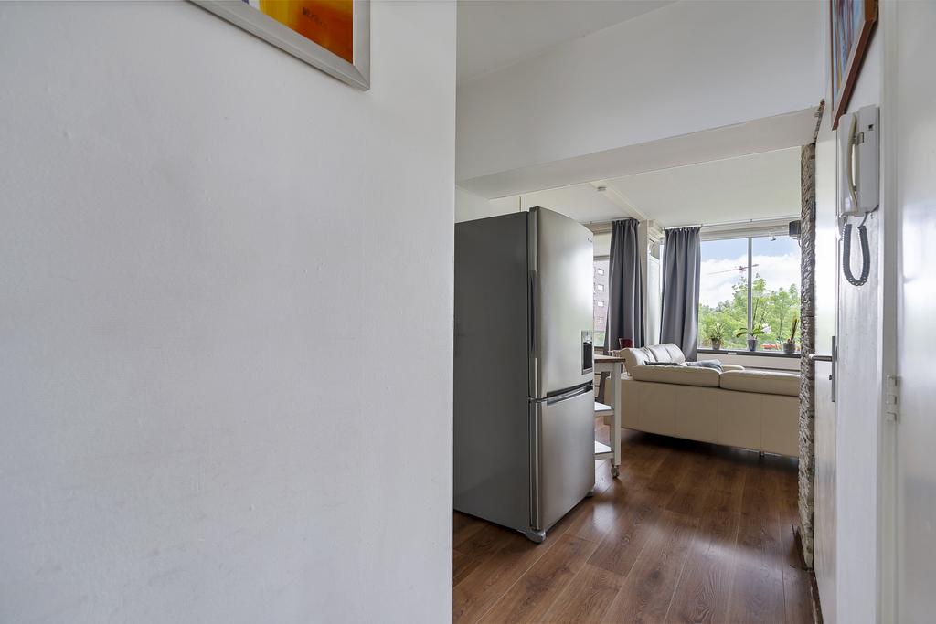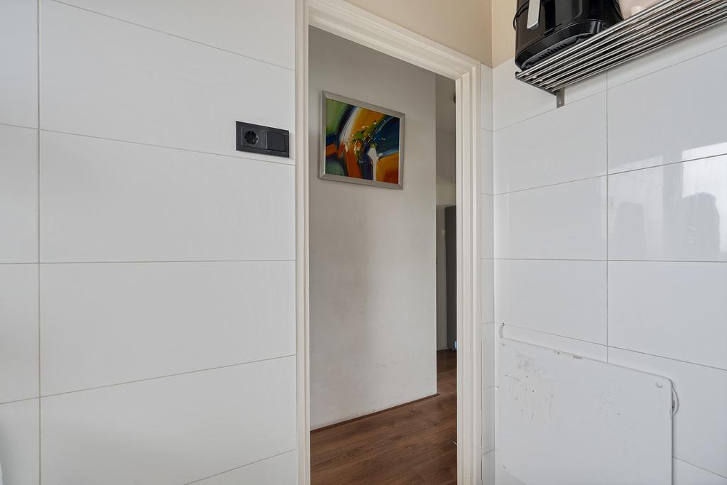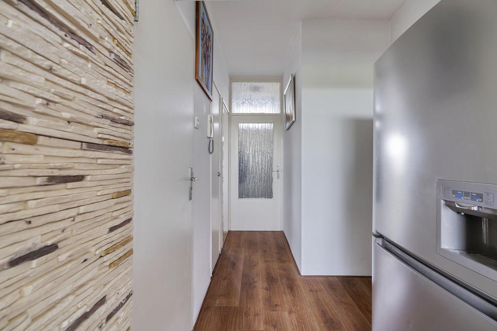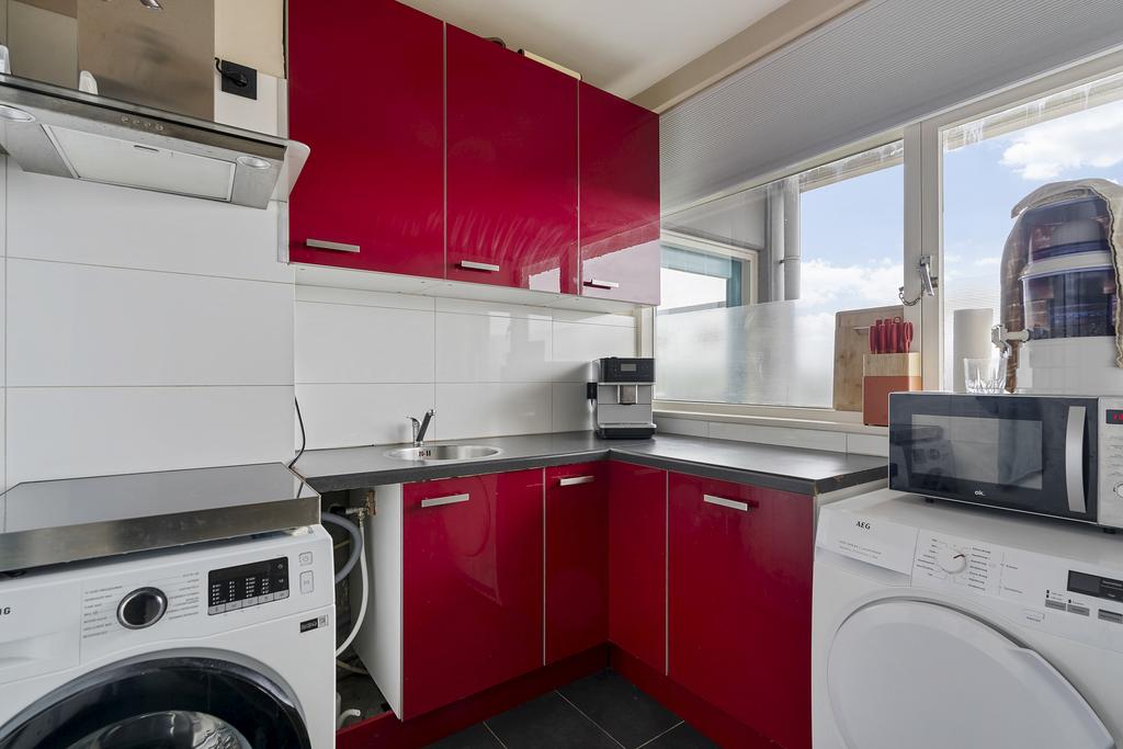 Aan het einde van de galerij is het appartement gelegen. Via het tochtportaal is de hal bereikbaar en direct aan de rechterkant is de keuken aan de voorzijde van de woning gelegen. De keuken is voorzien van een wastafel, kookplaat, losse magnetron, wasmachine en droger.