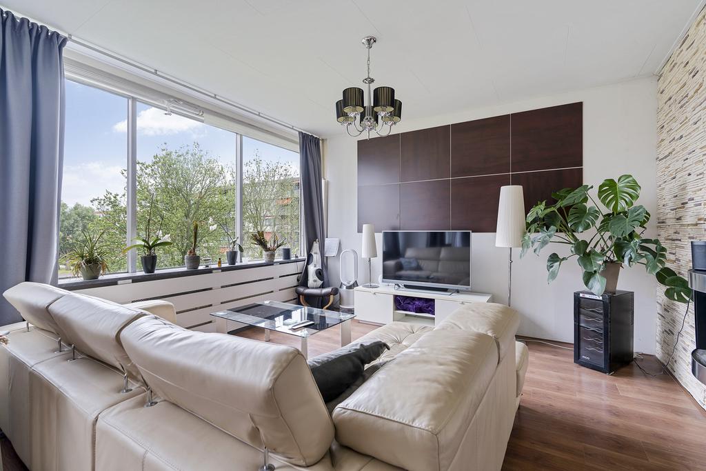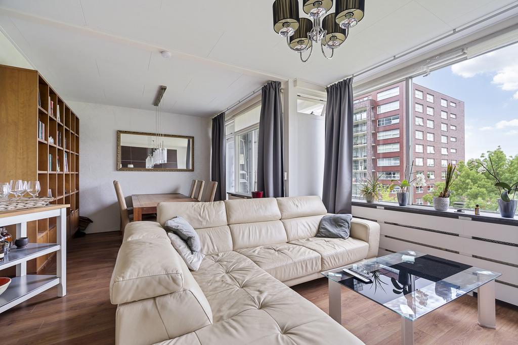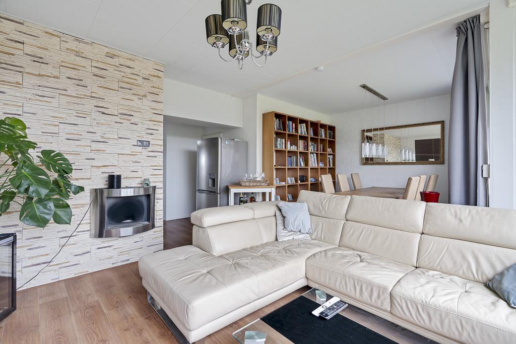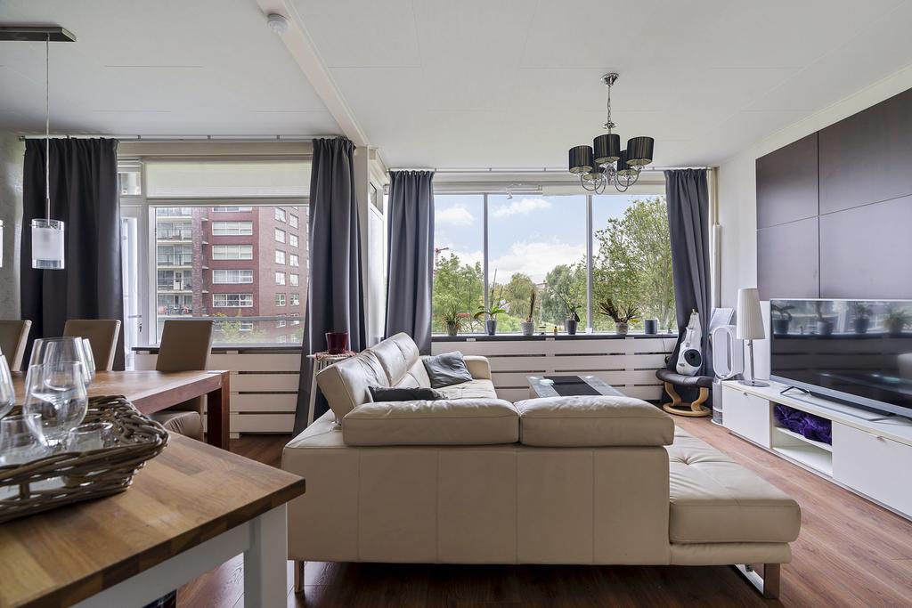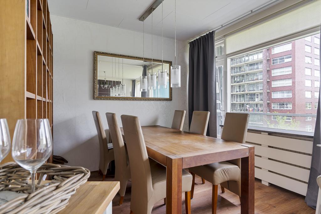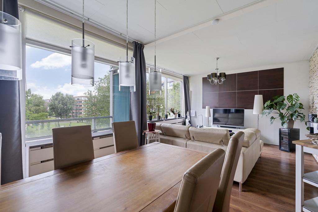 Aan de achterzijde zijn de ruime woon- en eetkamer te vinden. Door de grote raampartijen is het hier erg licht. Via de eetkamer is het fijne op het zuiden gelegen balkon bereikbaar.