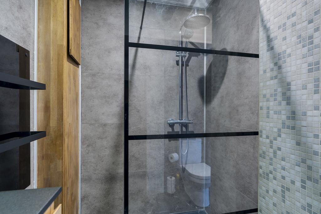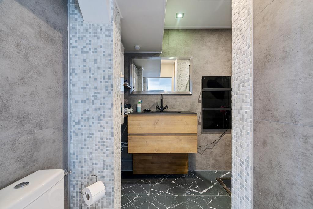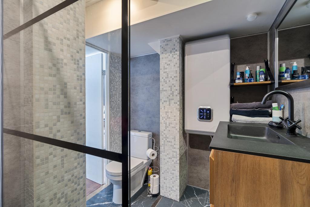 Naast de keuken is de moderne badkamer gelegen. De badkamer is volledig betegeld, modern afgewerkt en beschikt over een toilet, wastafelmeubel, spiegel en inloopdouche met hardglazen douchescherm.