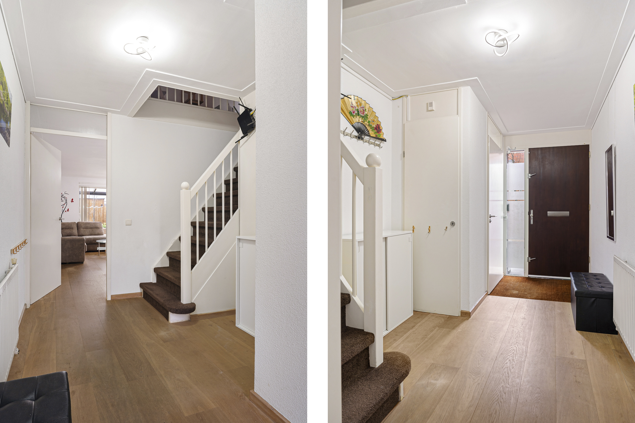 Via de voortuin kom je binnen in een ruime en verzorgde hal met garderoberuimte, een meterkast met aparte groep voor de zonnepanelen en een modern toilet met fonteintje.