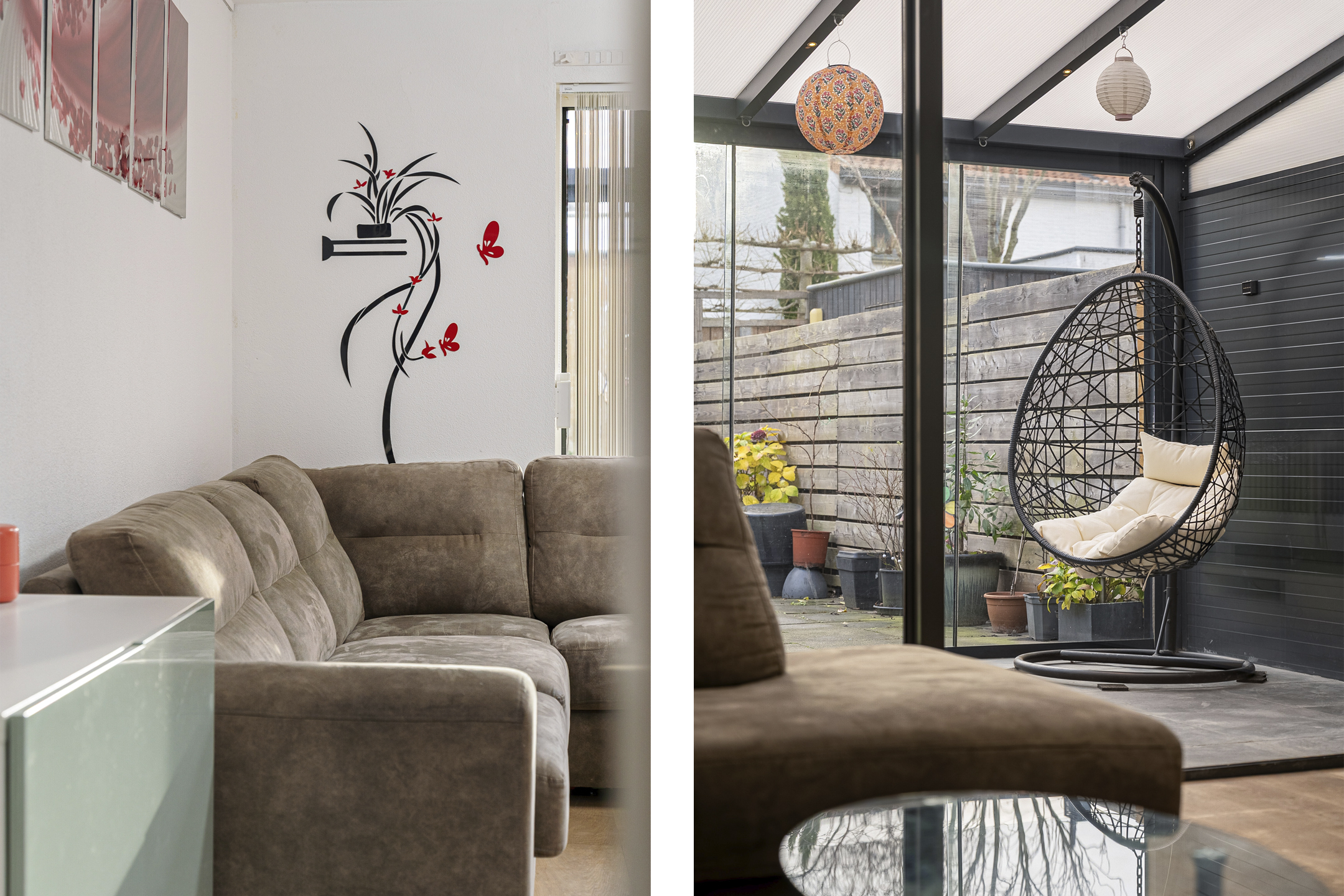 De serre, aangebouwd in 2021, vormt een prettige verlenging van de woonkamer en maakt het mogelijk om in alle seizoenen van de tuin te genieten.