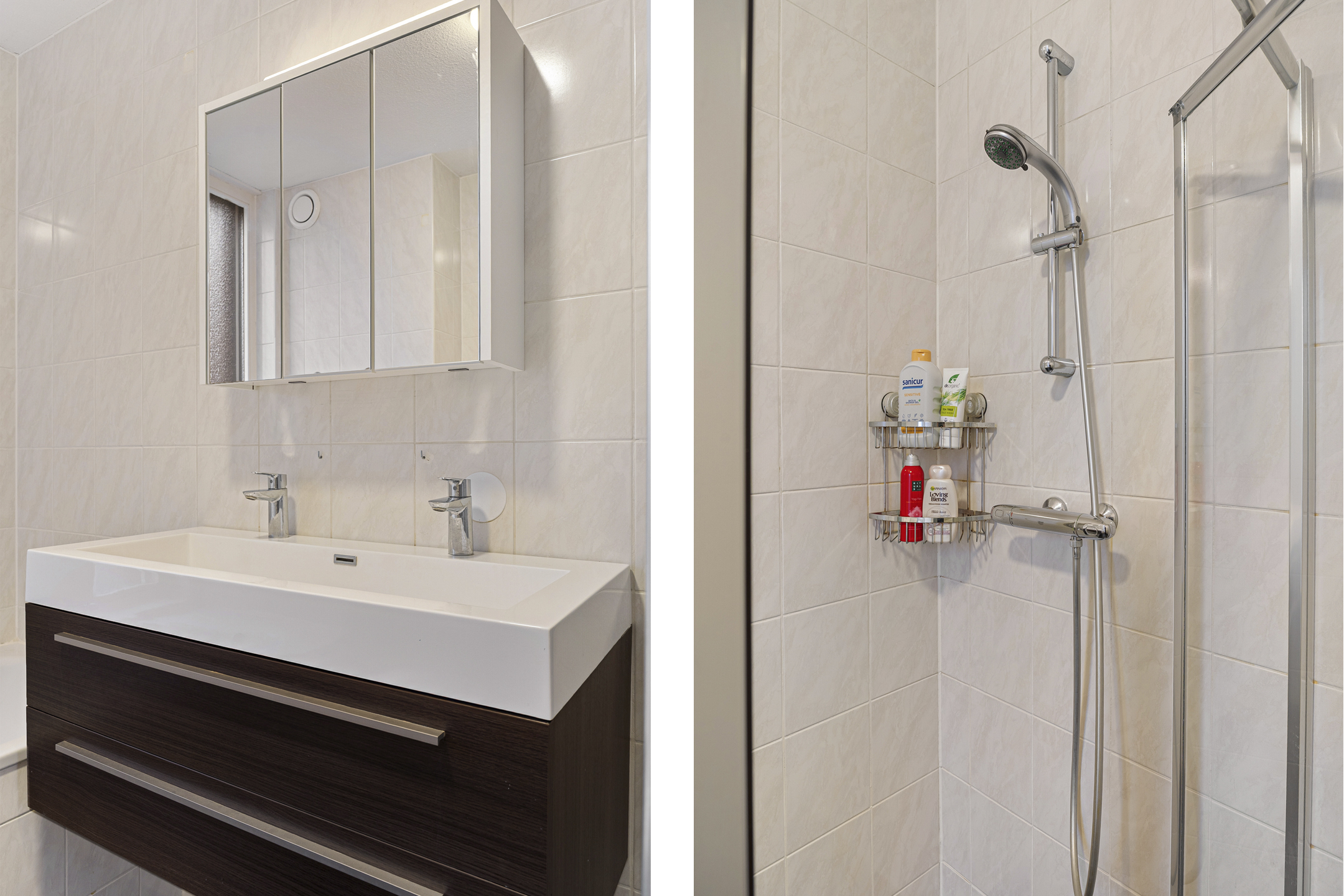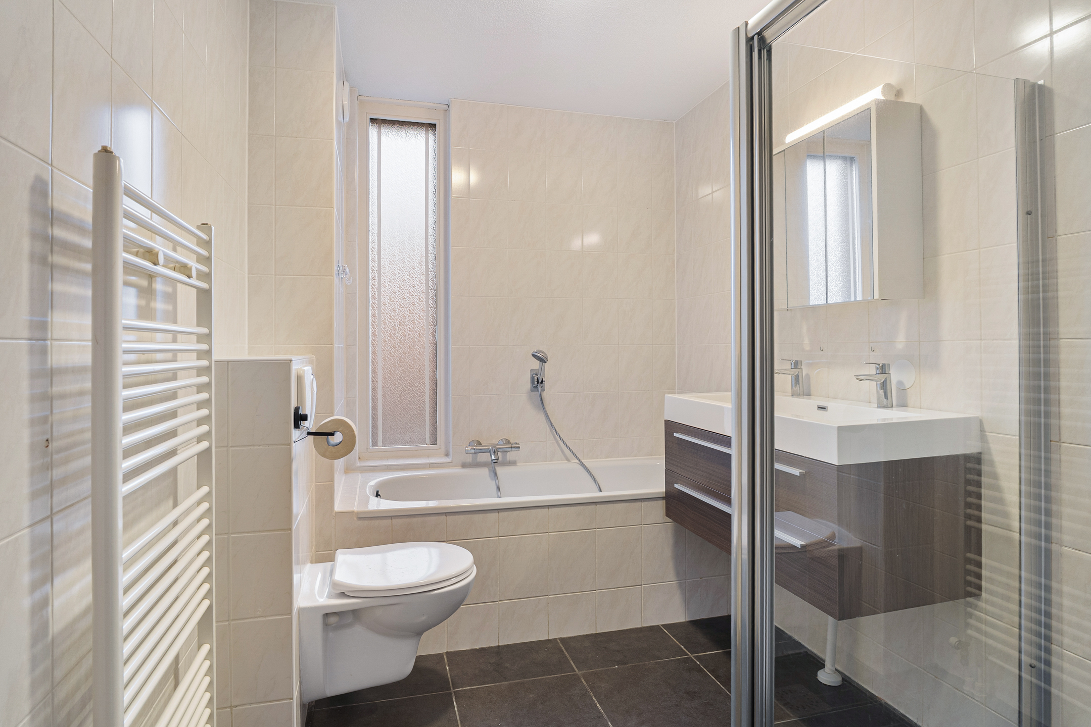 De badkamer ligt eveneens aan de voorzijde en is compleet uitgevoerd met een ligbad, separate douche, dubbele wastafel met meubel, vrijhangend toilet en designradiator. De afwerking is tijdloos en verzorgd.
