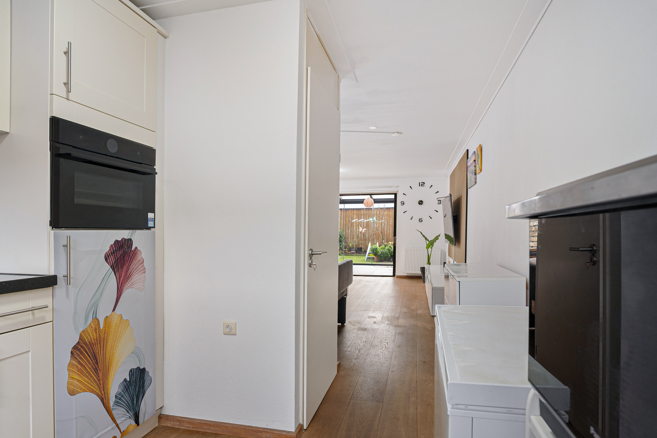 Aan de voorzijde ligt de moderne keuken in L-opstelling, uitgevoerd in een lichte kleurstelling en voorzien van een stijlvol werkblad, inductiekookplaat, RVS afzuigkap naar buiten, vaatwasser, koelkast en volop kastruimte.