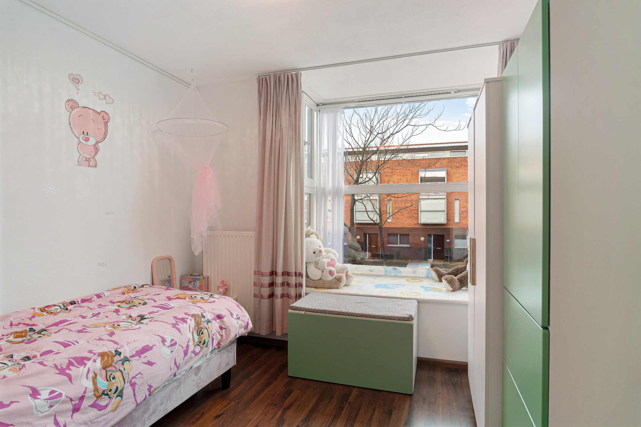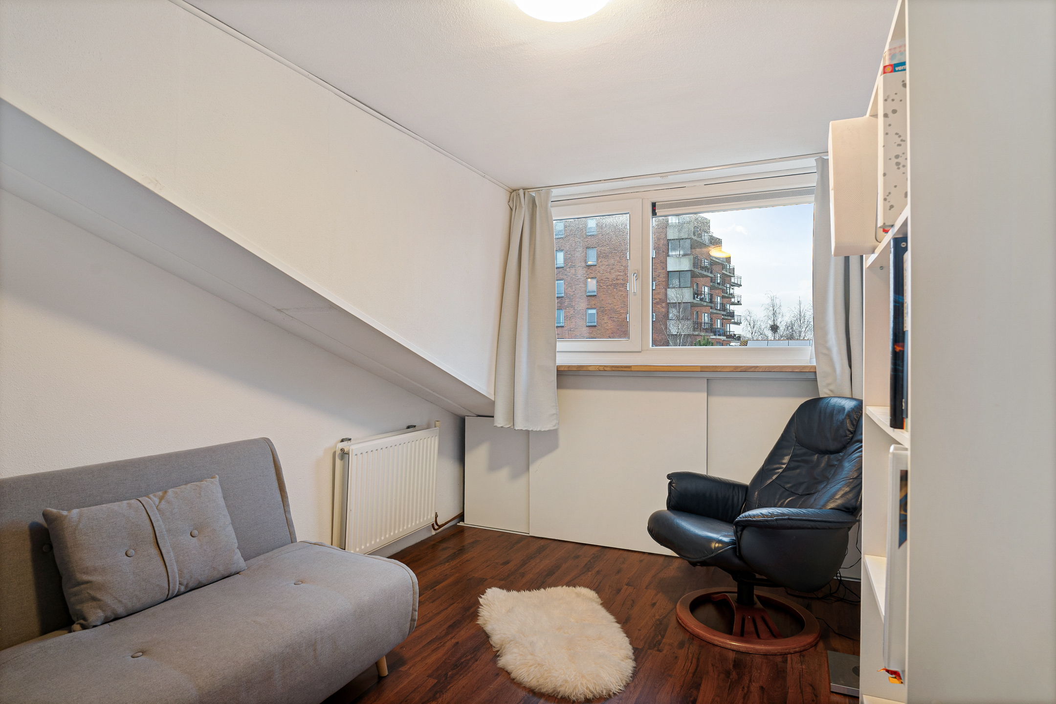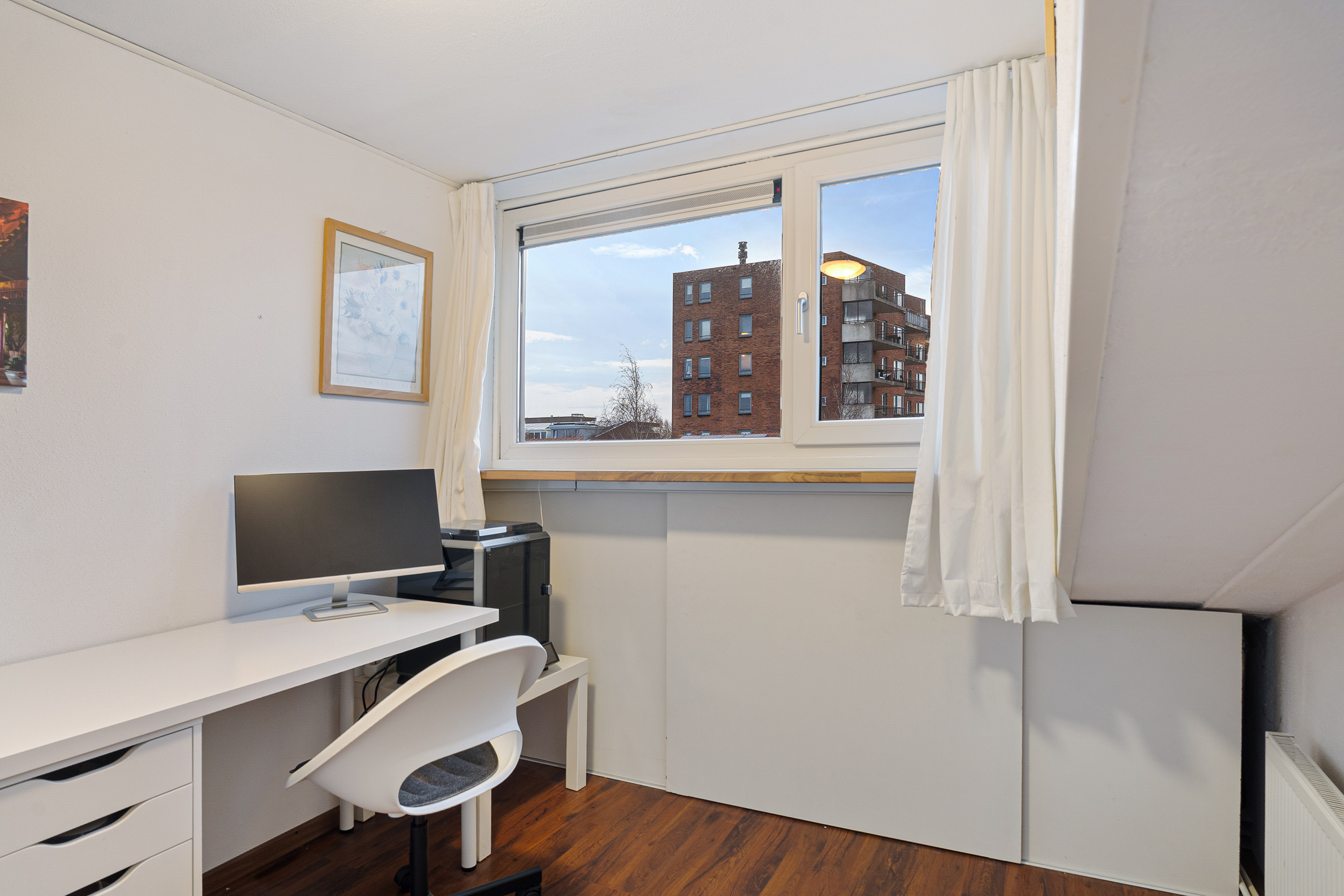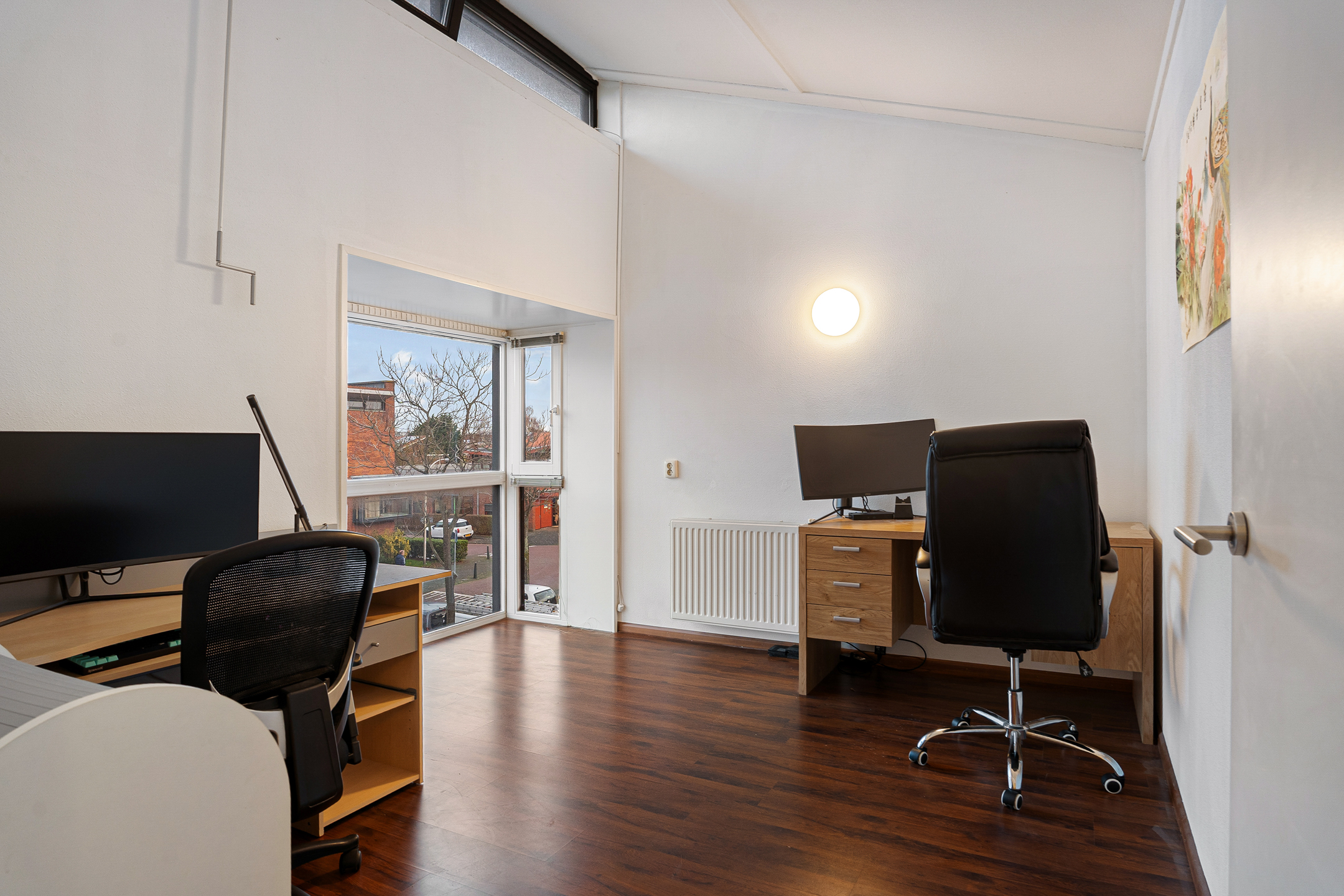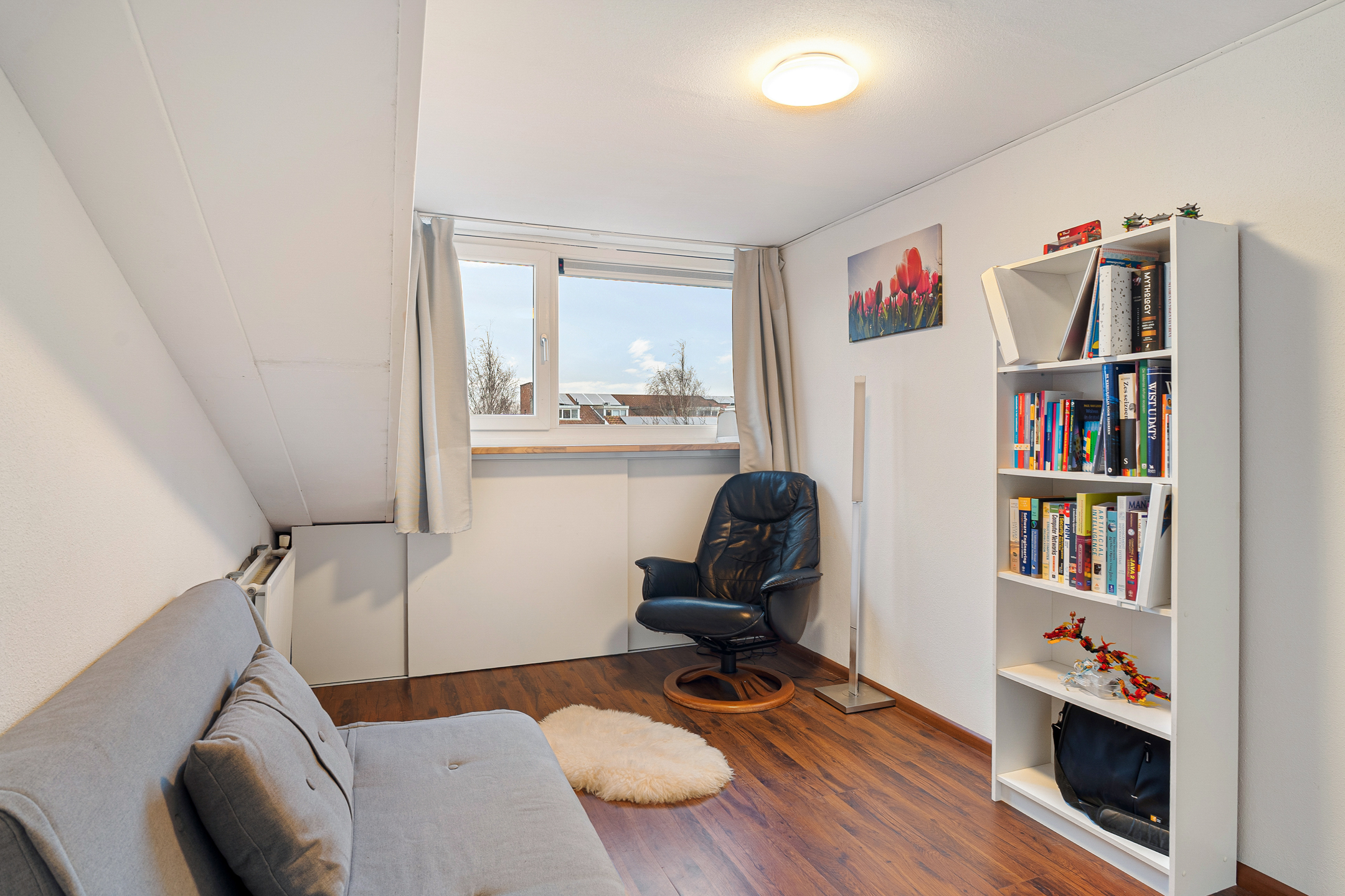 De tweede verdieping biedt verrassend veel ruimte en is ideaal voor een groot gezin, thuiswerken of logees. Aan de voorzijde ligt een ruime slaapkamer met hoge nok en veel daglicht.