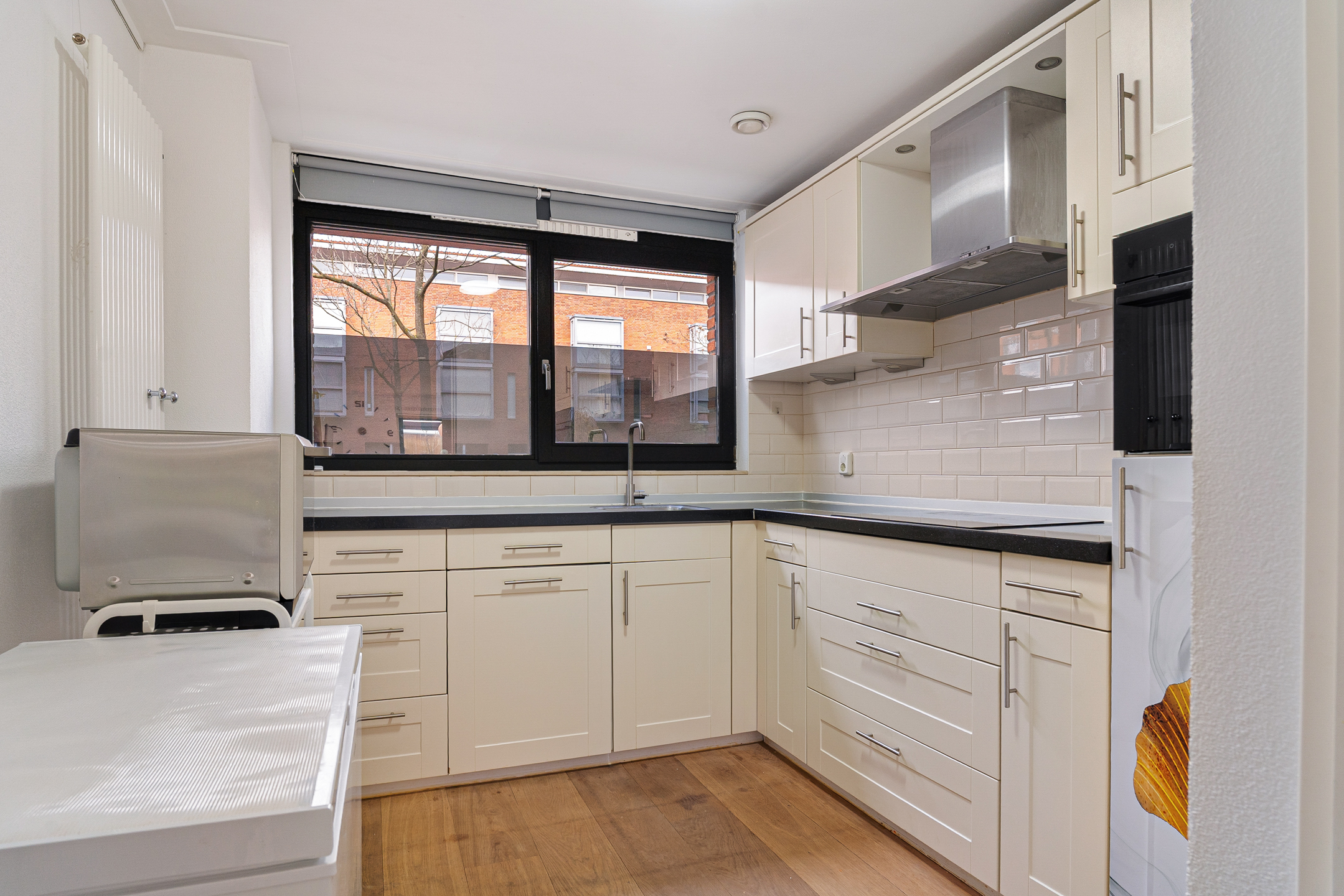 Een functionele en prettige keuken met uitzicht op de straat. Aan de achterzijde verbindt een schuifpui de woonkamer met de serre en de tuin, waardoor binnen en buiten mooi in elkaar overlopen.