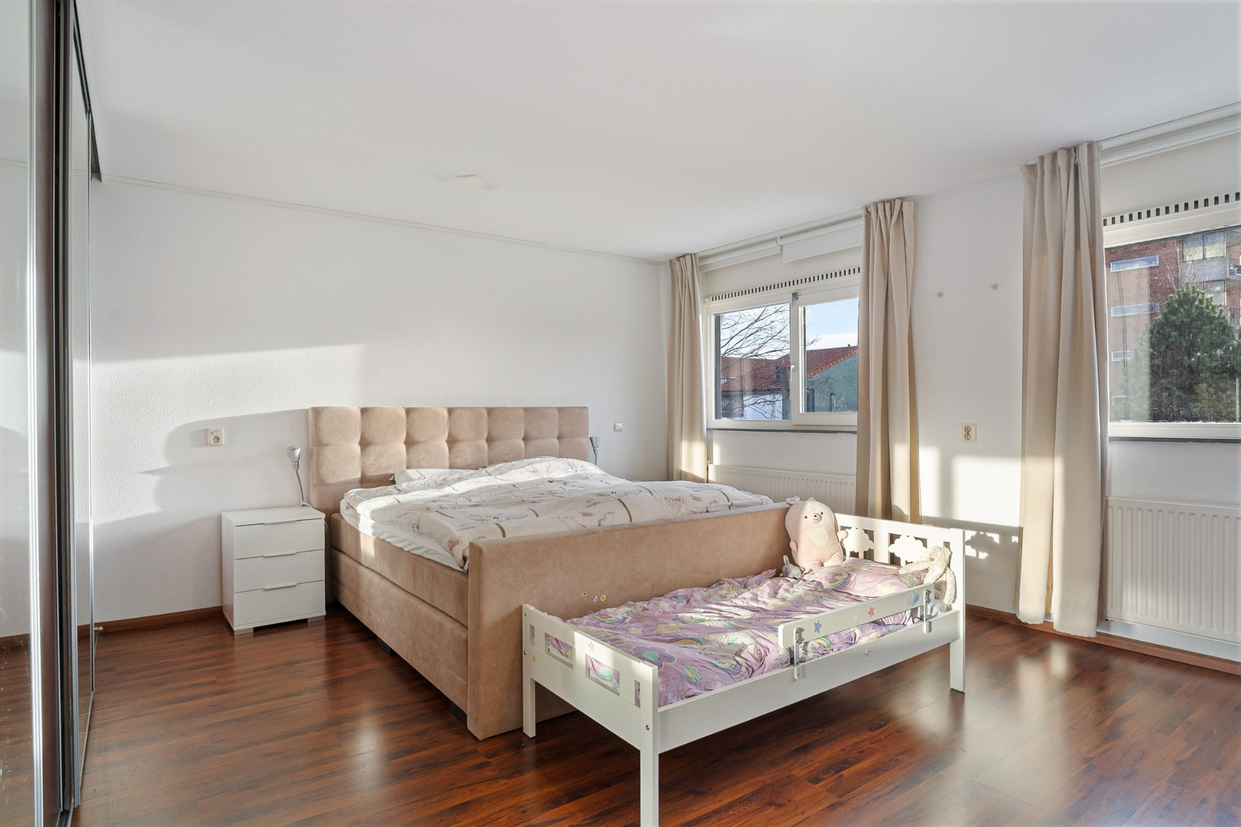 De achterzijde is ingericht als riante hoofdslaapkamer, ontstaan uit twee voormalige kamers en voorzien van een grote vaste kastenwand en een rustige, luxe sfeer.