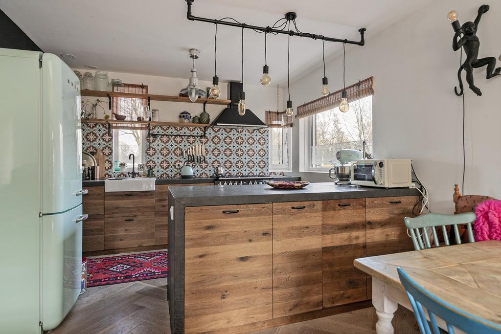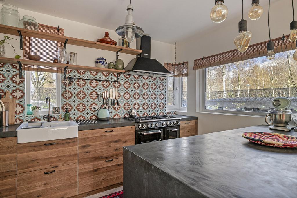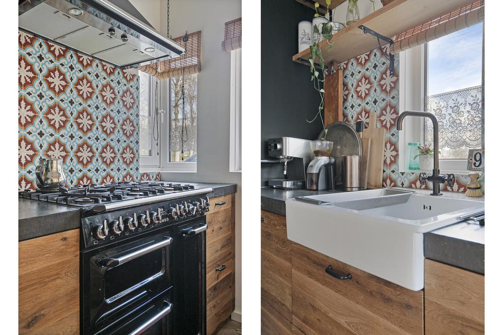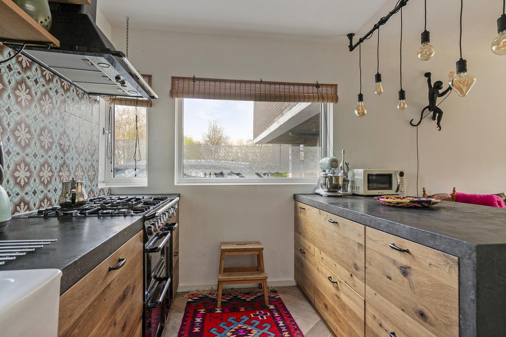 In de entreehal bevindt zich de meterkast en een toilet. Direct na de tussendeur is er een trapopgang naar de eerste verdieping. Bij binnenkomst in de woonkamer valt het meteen op dat er veel natuurlijk lichtinval is. De ruimte is ingelegd met een prachtige visgraatvloer. Aan de voorzijde van de woning is de open keuken gelegen. De keuken heeft een zwart, vrijstaand 6-pits gasfornuis met 3 ovens, een afzuigkap, een vaatwasmachine en een koelvriescombinatie. Verder is de keuken voorzien van veel kastruimte.