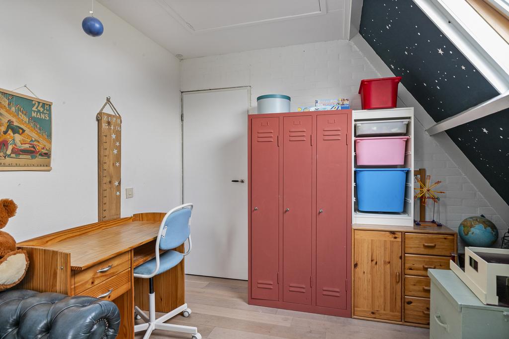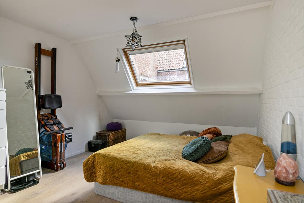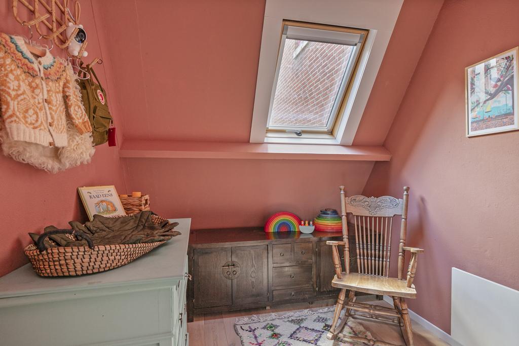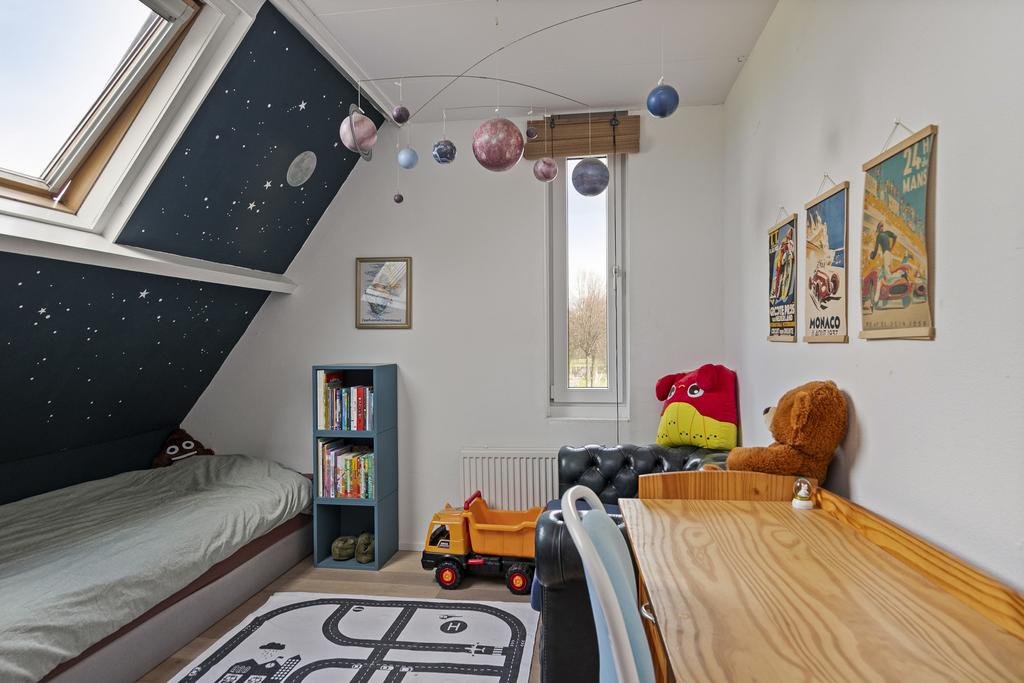 Slaapkamer 5 en het kantoor liggen aan de achterzijde van de woning. Deze slaapkamer is een kamer met twee lagen. Middels een houten ladder kom je op de vliering waar een slaapzolder gecreëerd is.