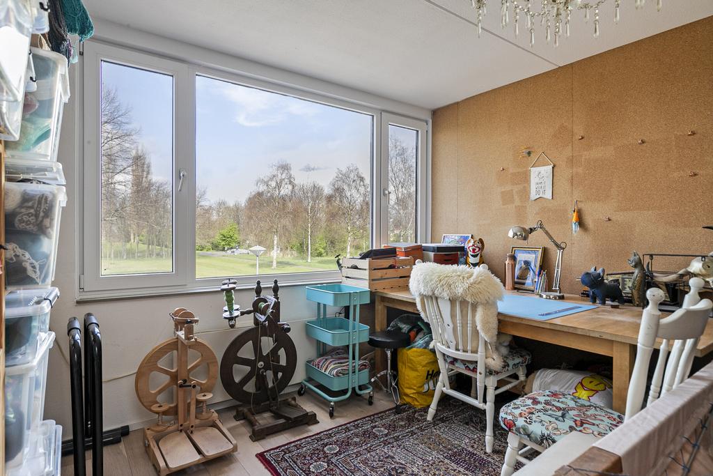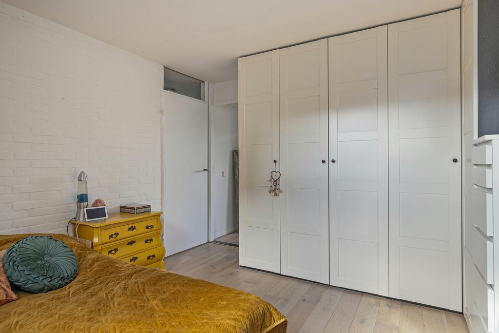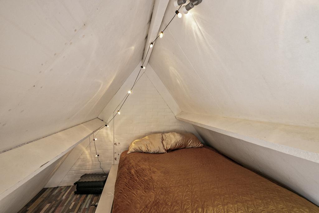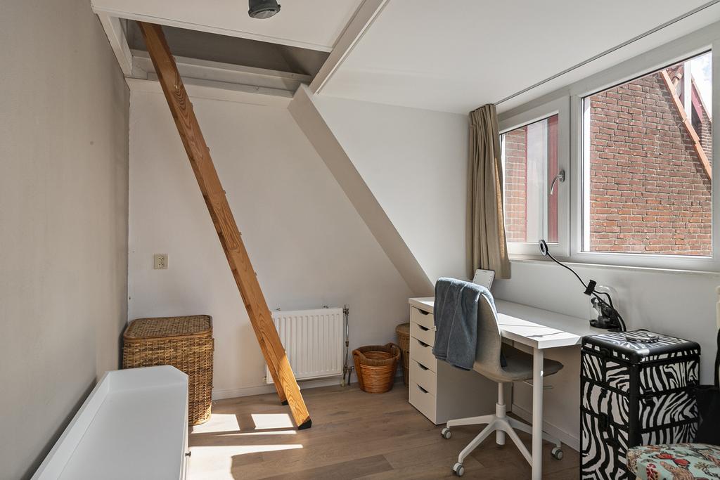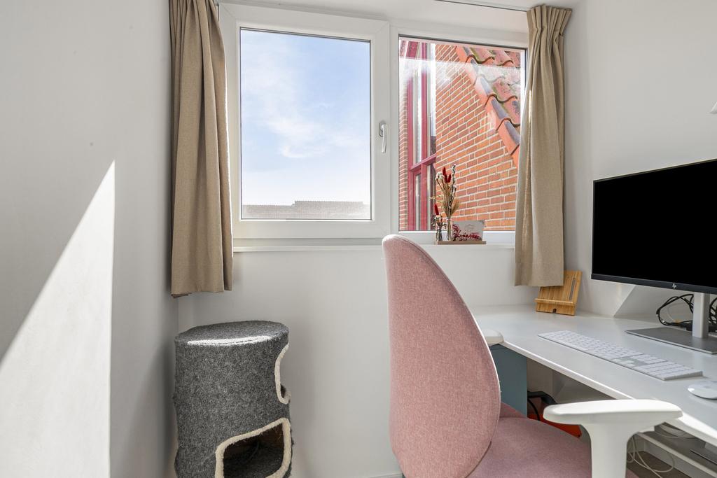 Slaapkamer 5 en het kantoor liggen aan de achterzijde van de woning. Deze slaapkamer is een kamer met twee lagen. Middels een houten ladder kom je op de vliering waar een slaapzolder gecreëerd is.