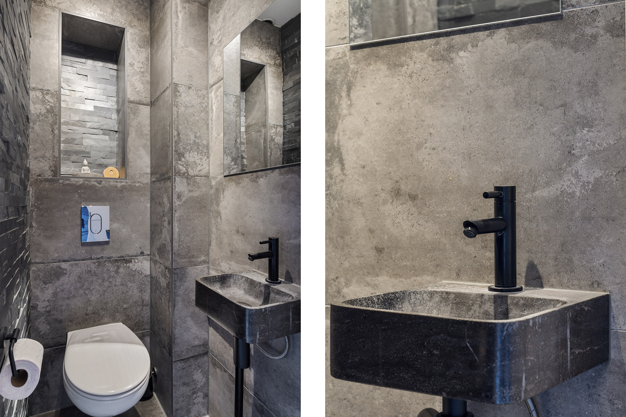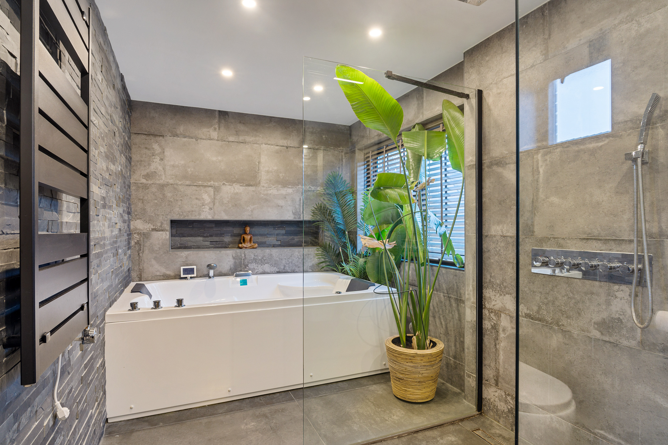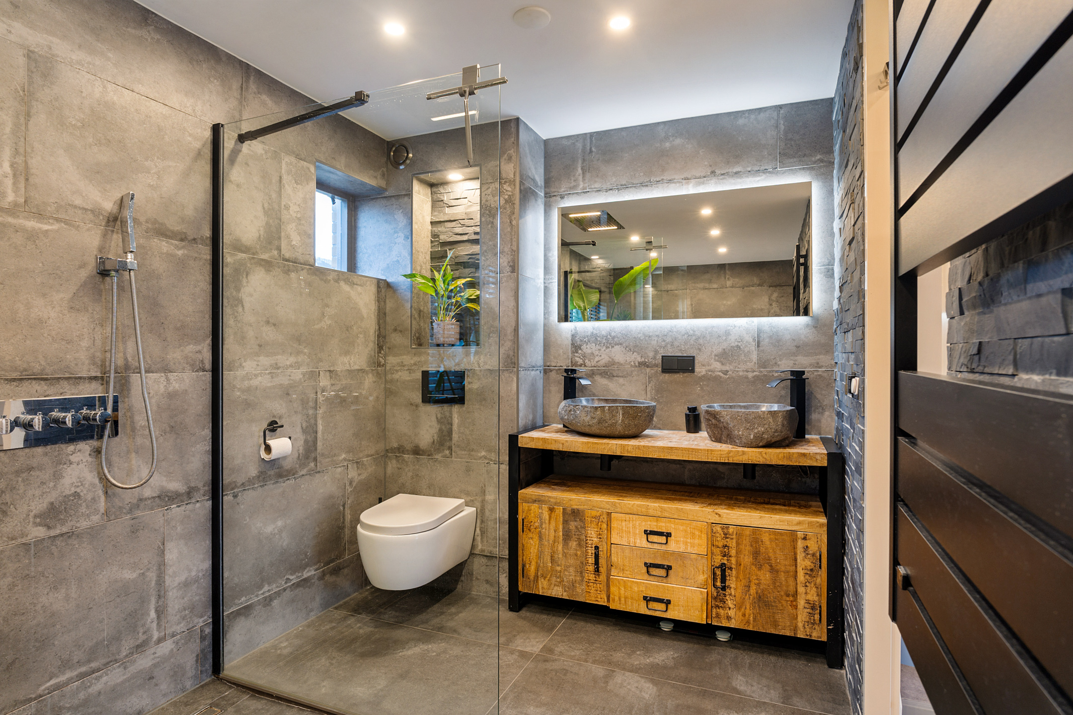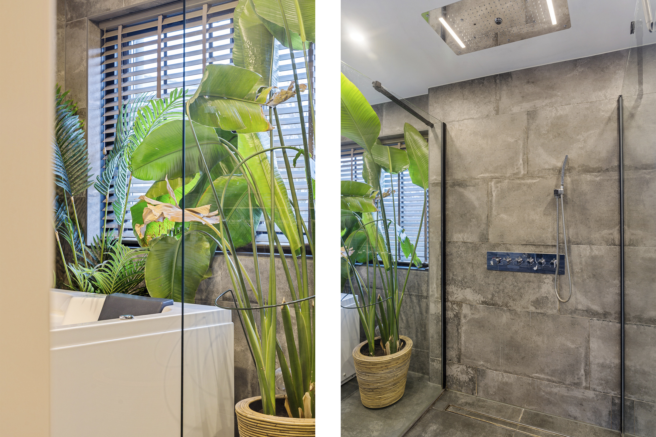 Aan de voorzijde is de luxe en vergrote badkamer gesitueerd, ingericht als een echte wellnessruimte. De badkamer beschikt over een tweepersoons jacuzzi en een ruime inloopdouche met regendouche vanuit het plafond. Daarnaast is er een wastafelmeubel met twee stenen waskommen en een toilet.