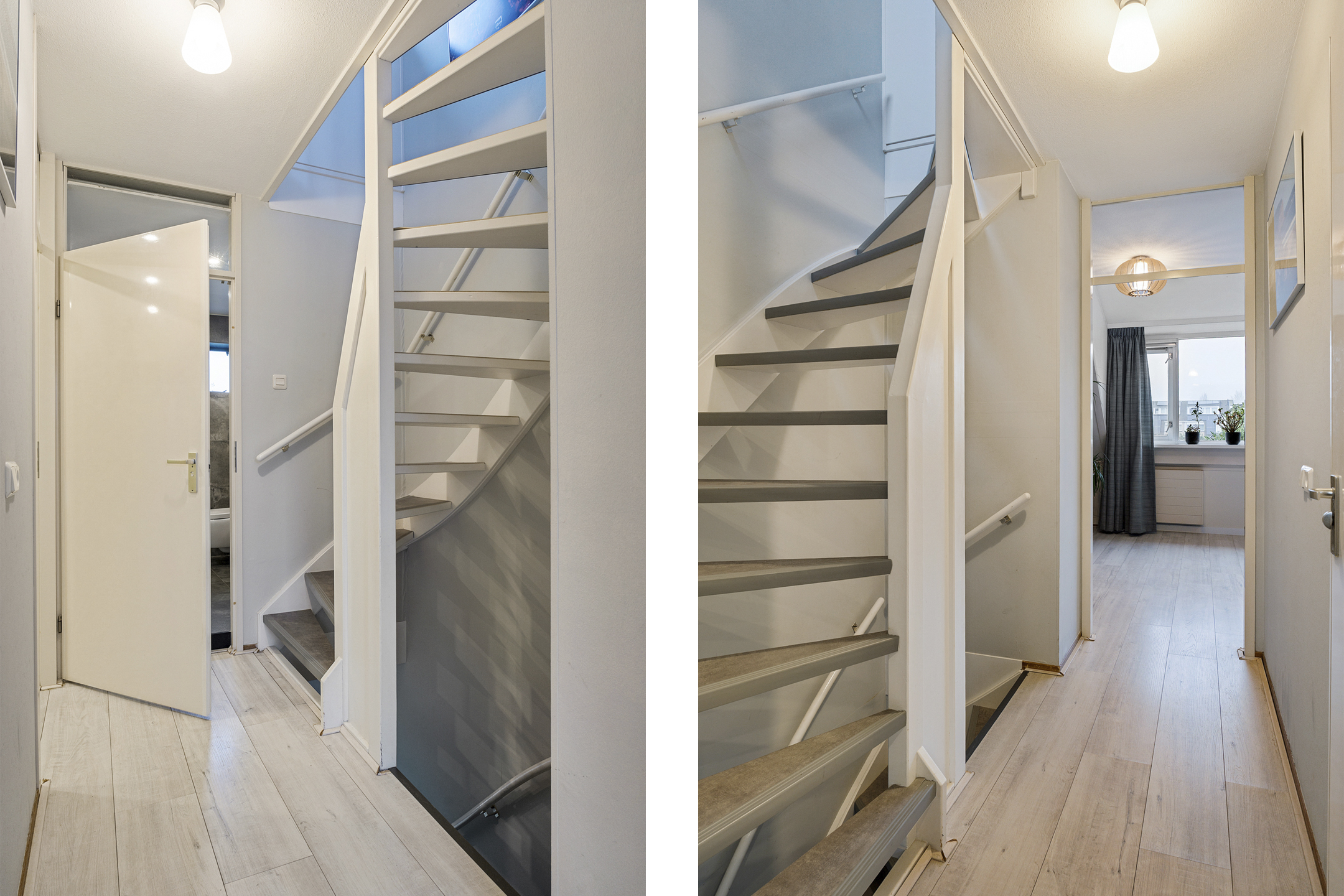 Via de vaste trap bereik je de voorzolder, waar een dakvenster zorgt voor daglicht. Hier bevinden zich de aansluitingen voor de wasmachine, de cv-combiketel, de mechanische ventilatiebox en de omvormer van de zonnepanelen.