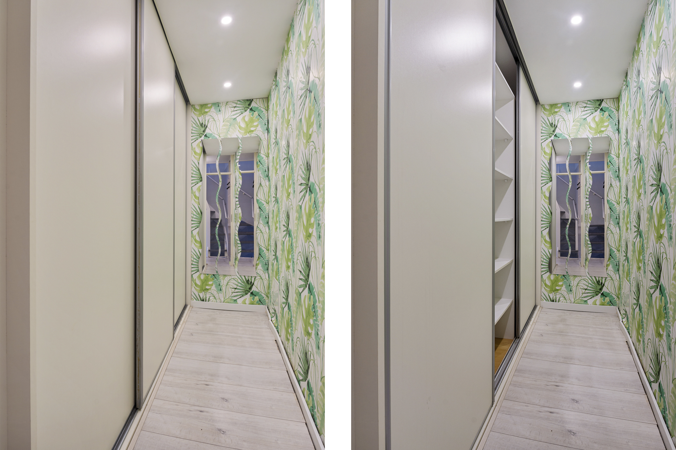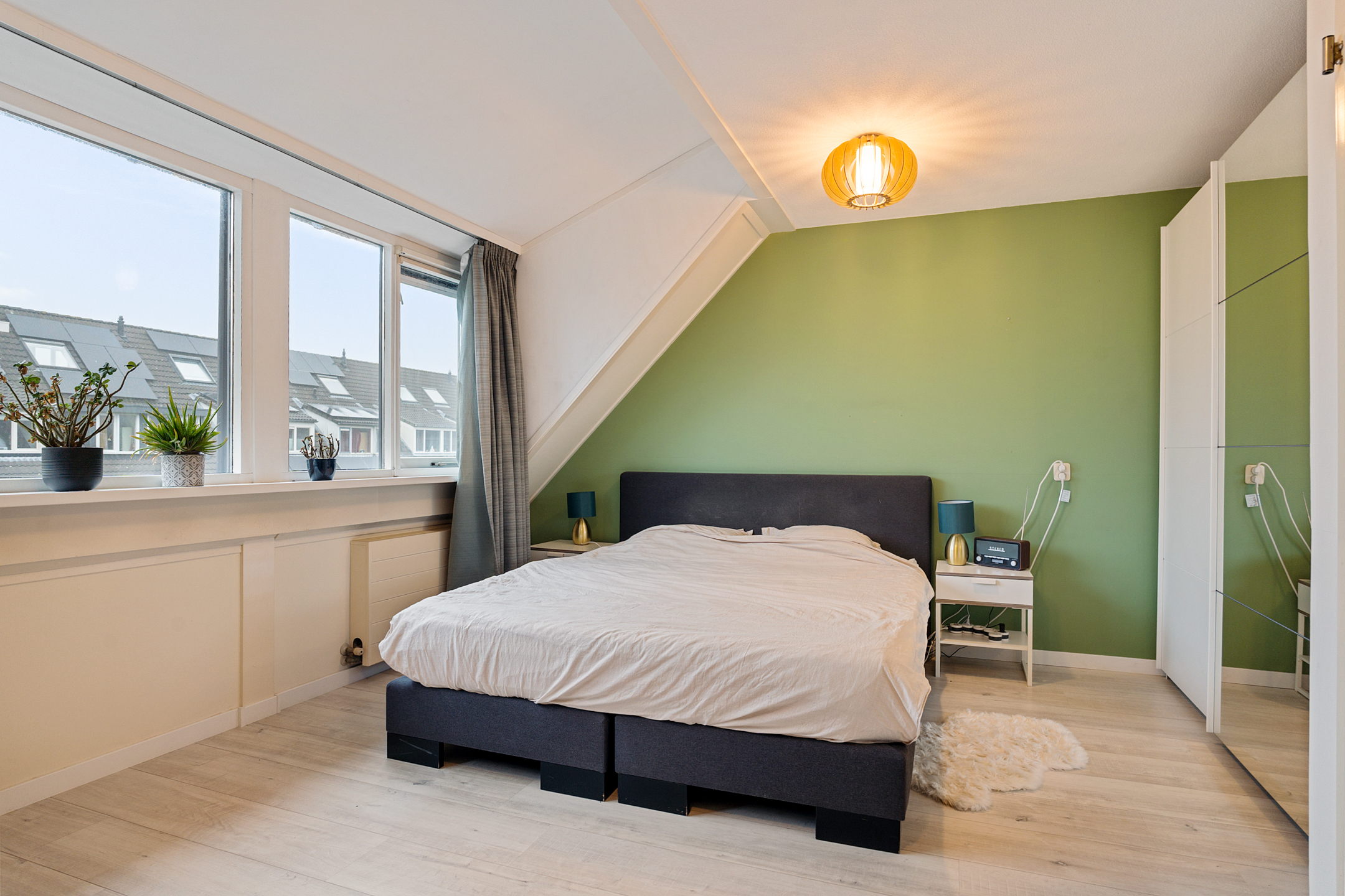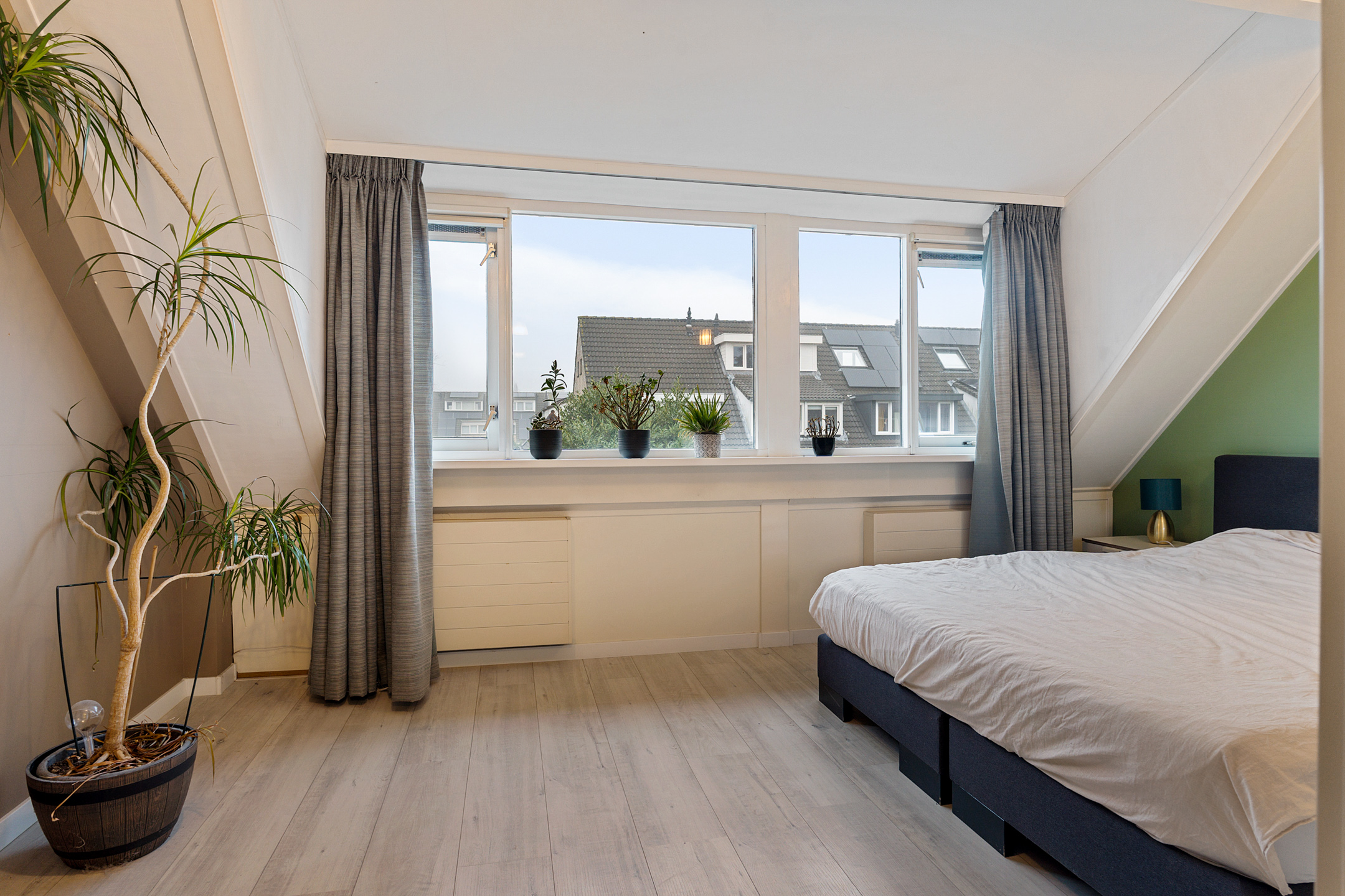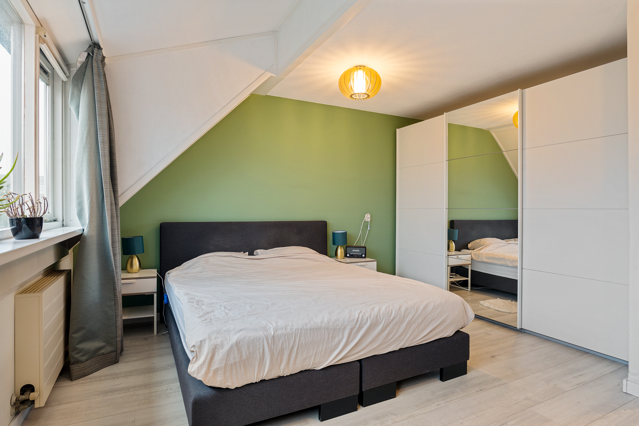 Op de eerste verdieping kom je uit op de overloop, die toegang geeft tot de verschillende vertrekken. Hier bevindt zich een ruime inloopkast met een vaste kast voorzien van schuifdeuren. Aan de achterzijde van de woning ligt een royale slaapkamer met dakkapel, wat zorgt voor extra ruimte en prettige lichtinval.