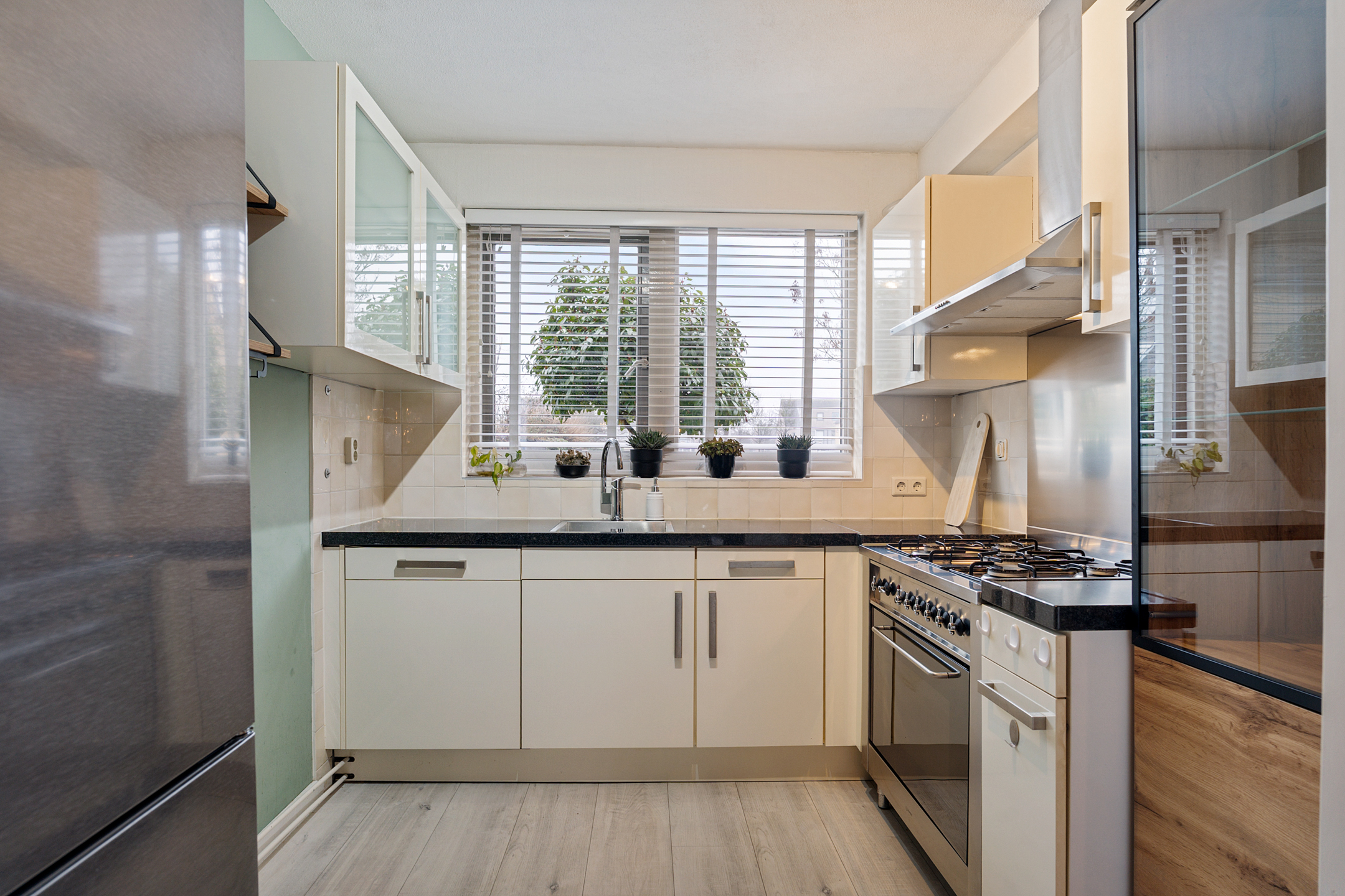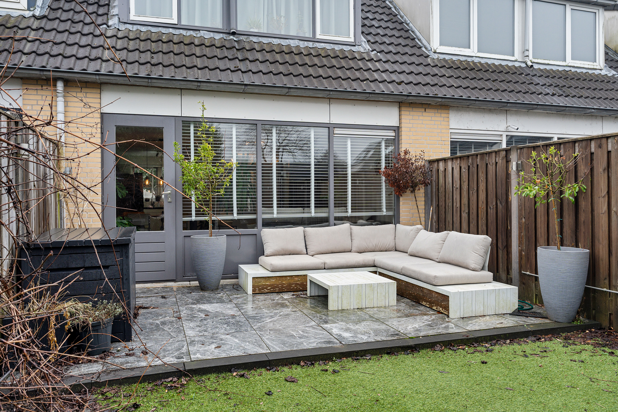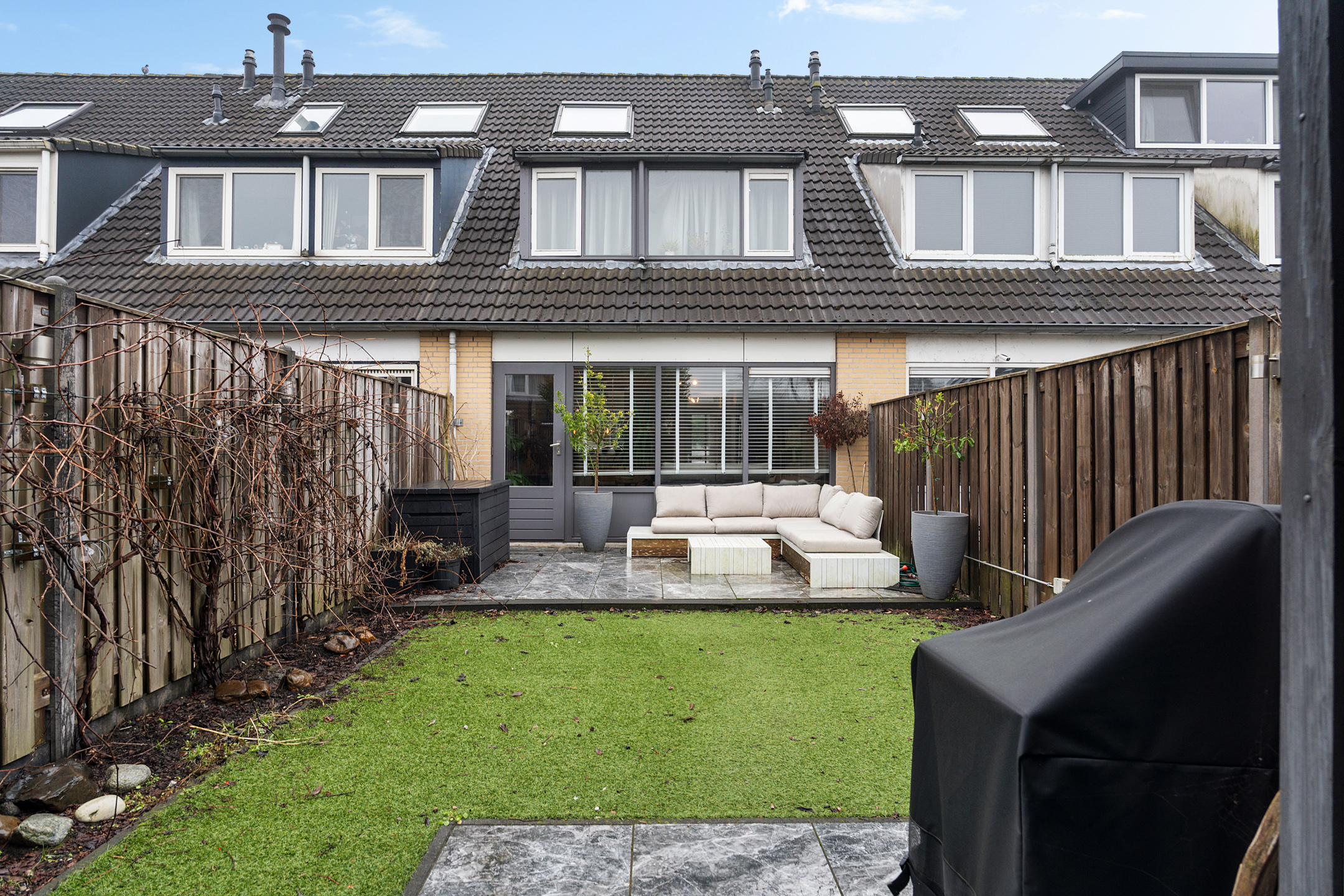 Aan de voorzijde van de woning bevindt zich de keuken, uitgevoerd in een hoekopstelling en voorzien van een natuurstenen werkblad. De achtertuin ligt op het noorden en is ingericht met een terras en kunstgras. Daarnaast is er een houten berging aanwezig en beschikt de tuin over een handige achterom.