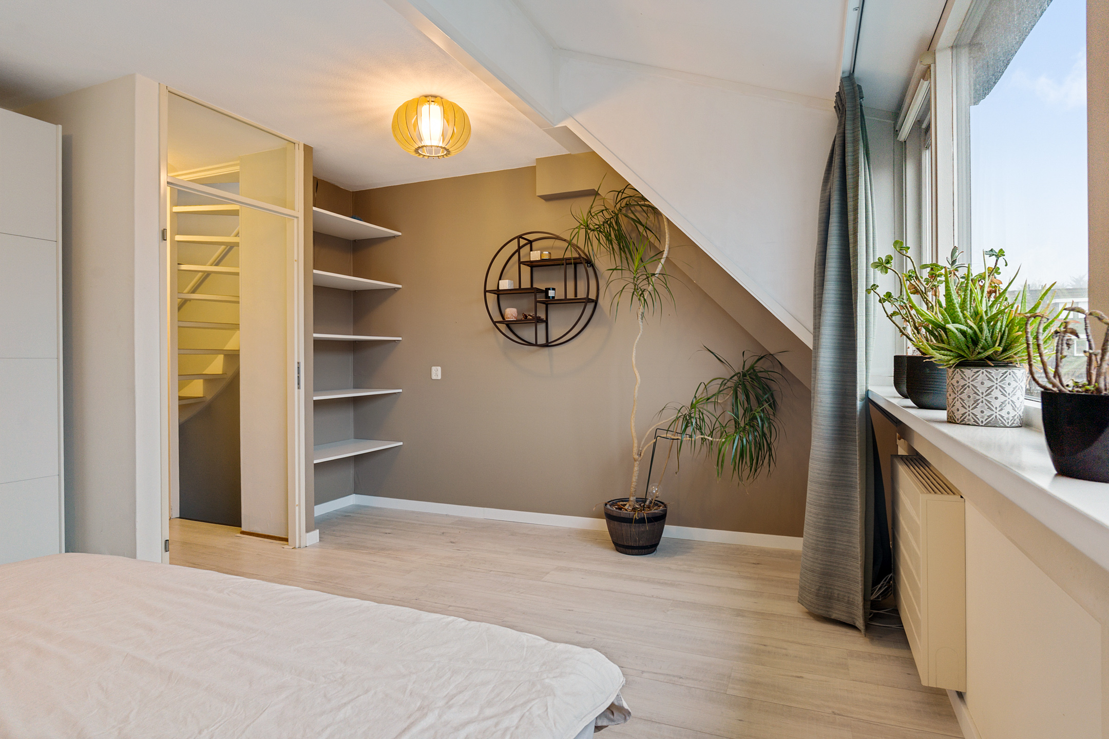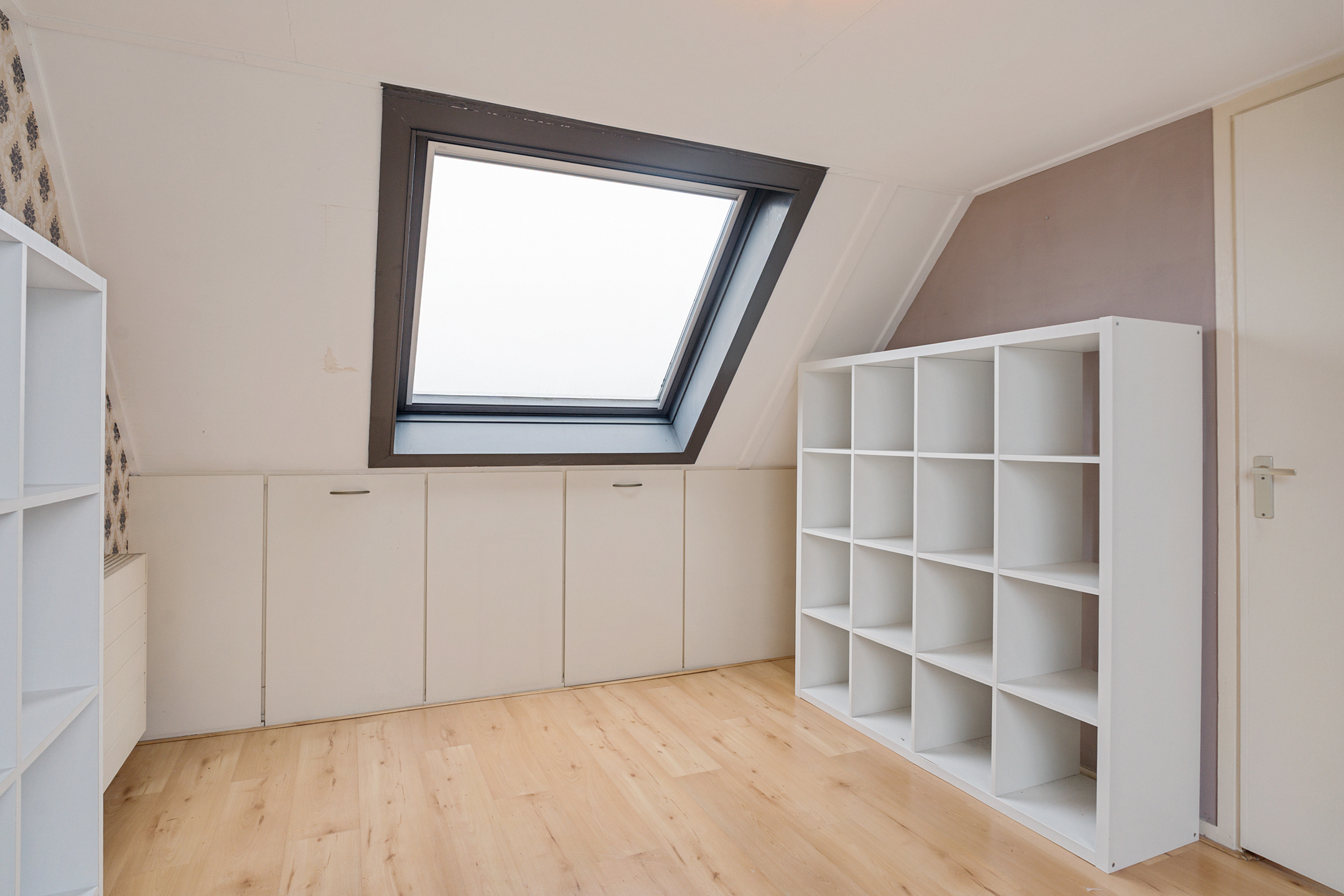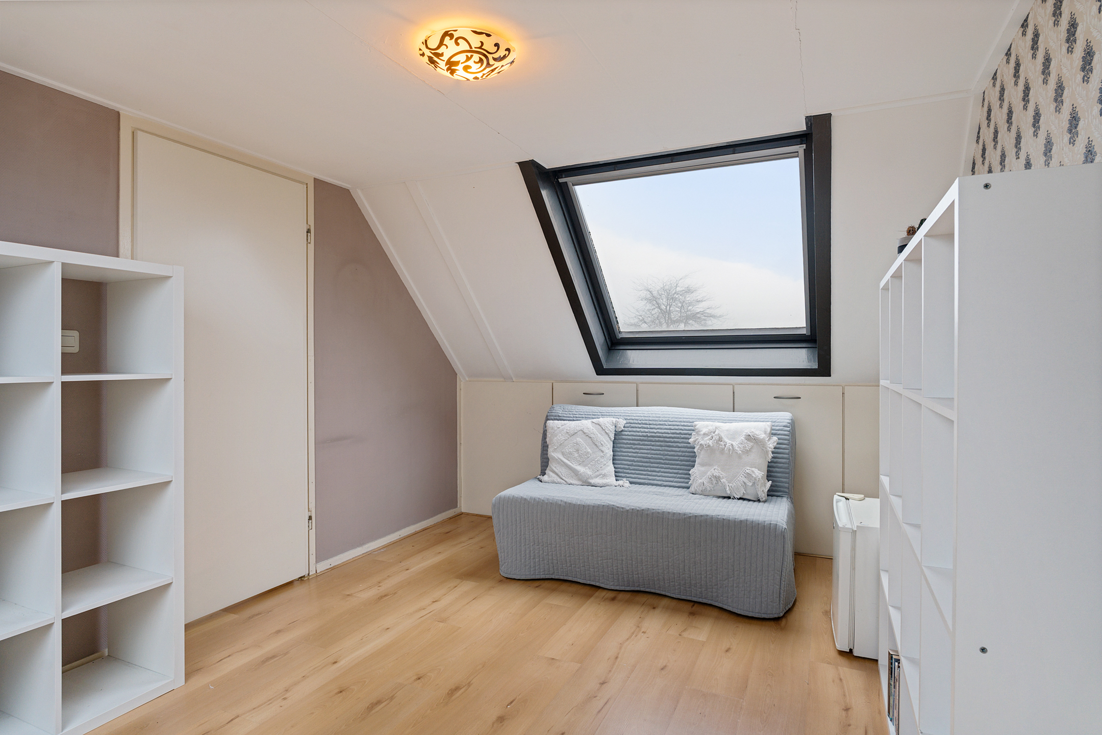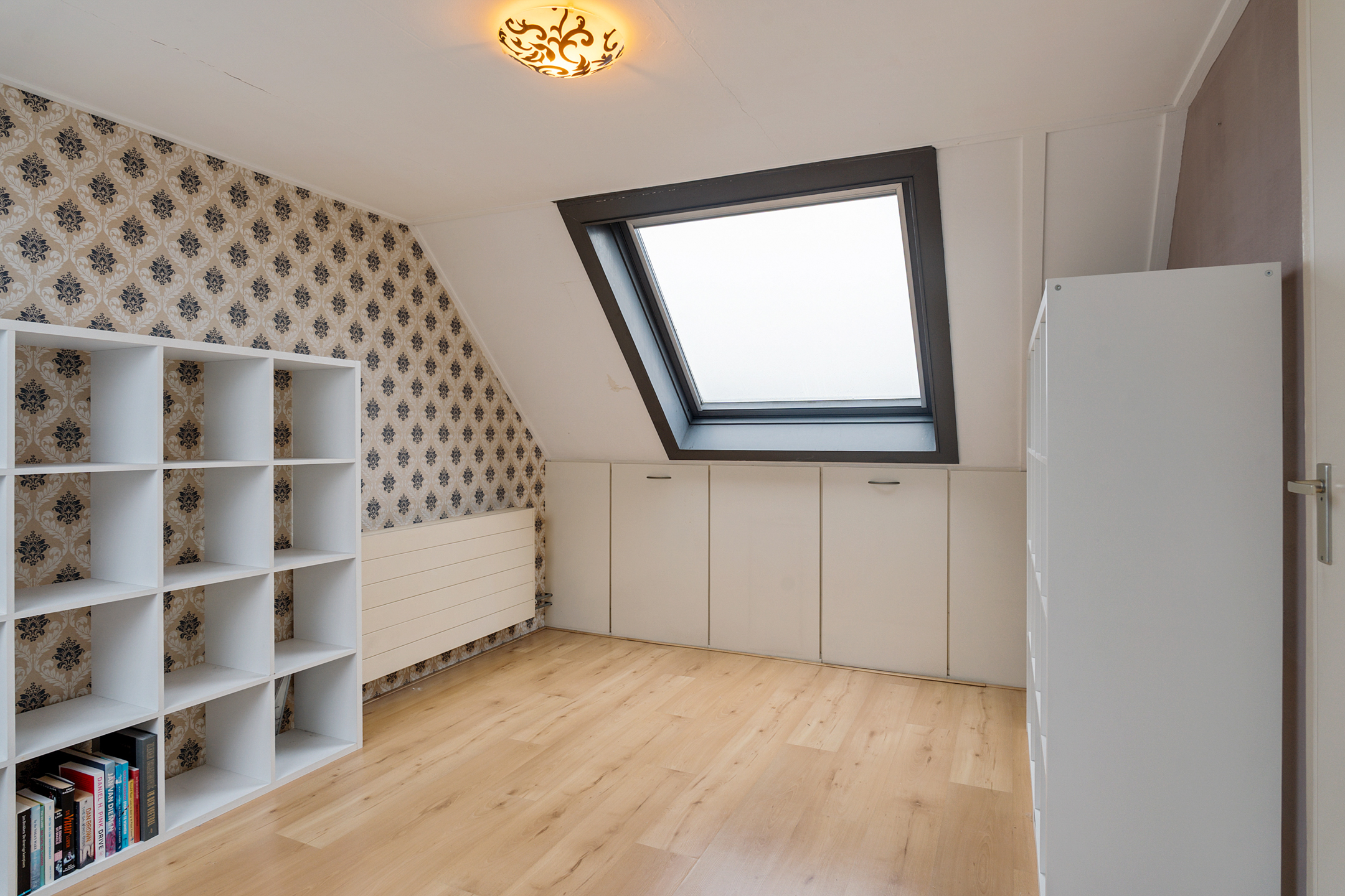 Aansluitend kom je in de grote zolderkamer, die is voorzien van dakvensters en praktische bergruimte. Daarnaast is er boven de slaapkamer nog een extra vliering aanwezig, ideaal voor het opbergen van spullen die je niet dagelijks nodig hebt.