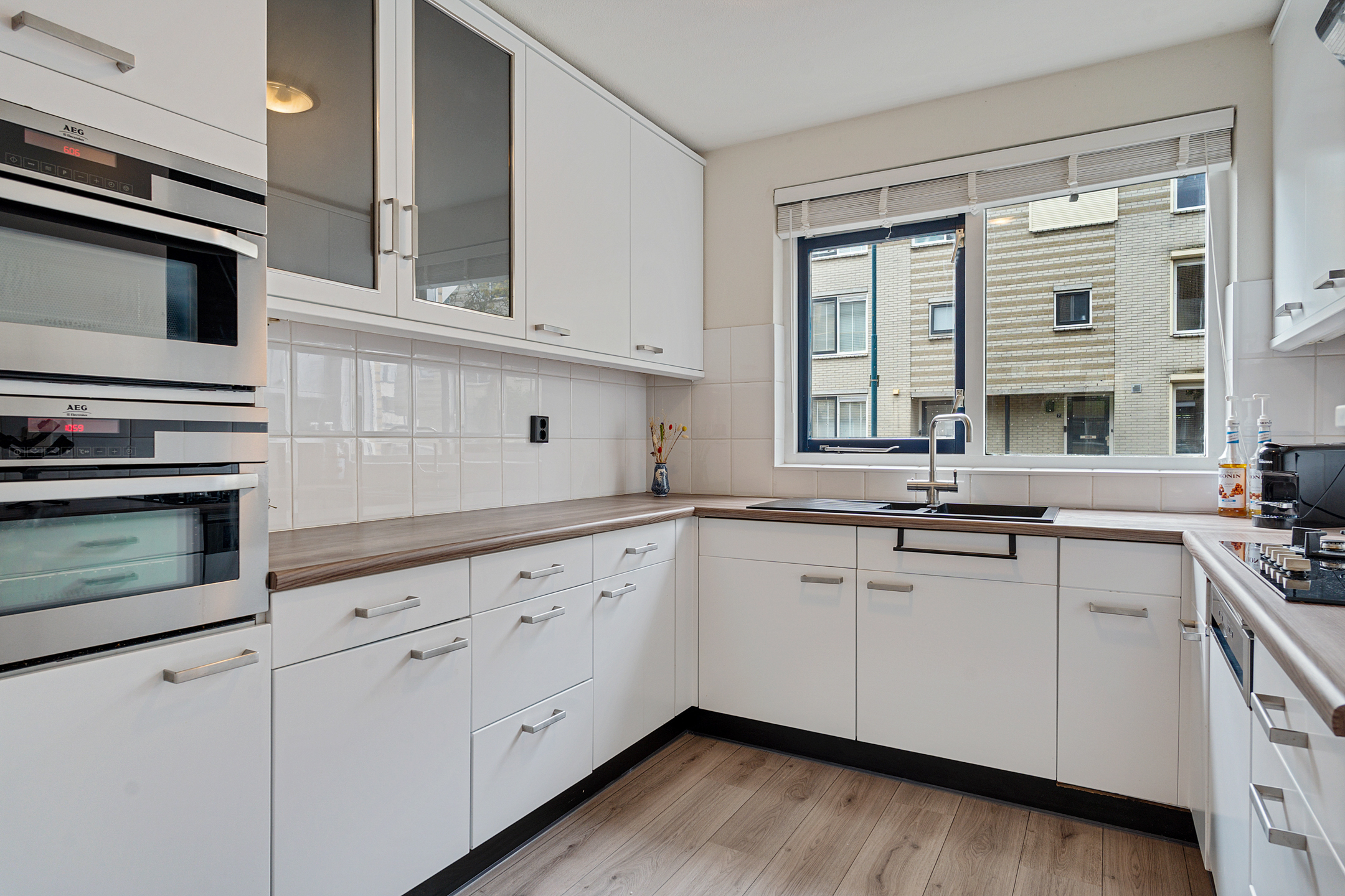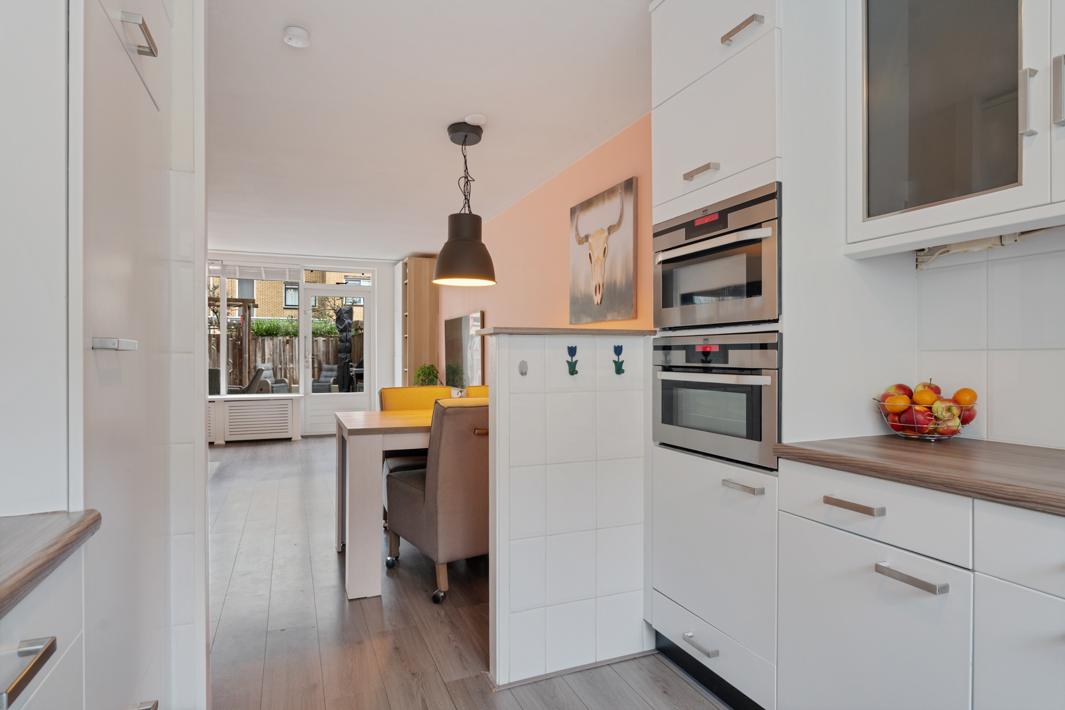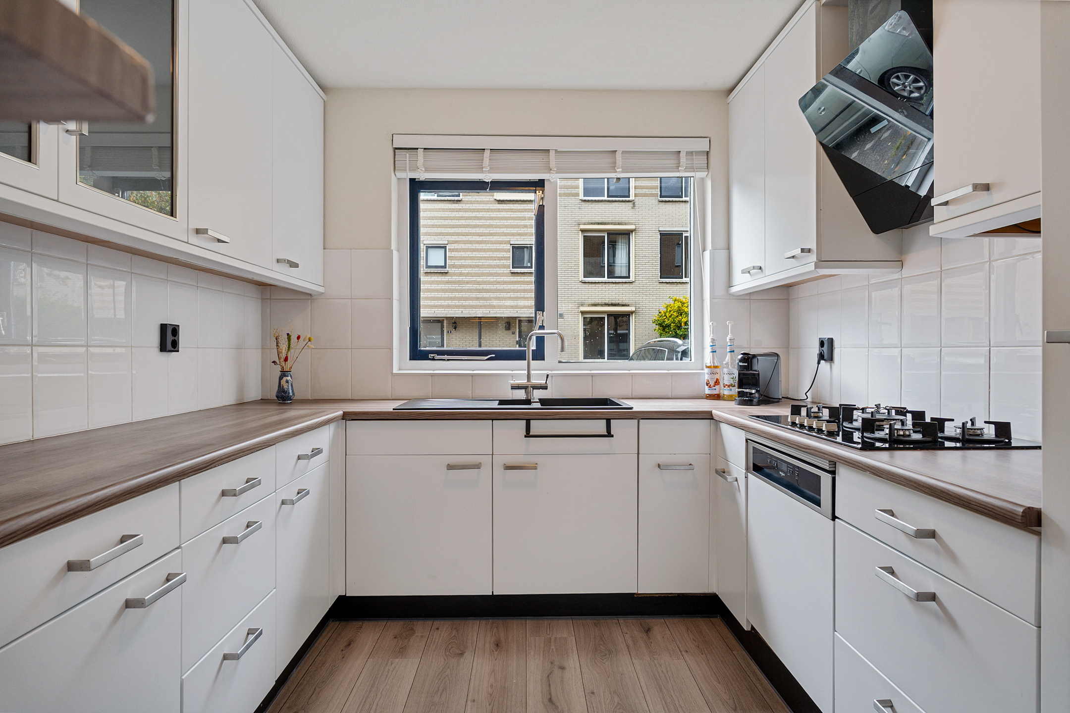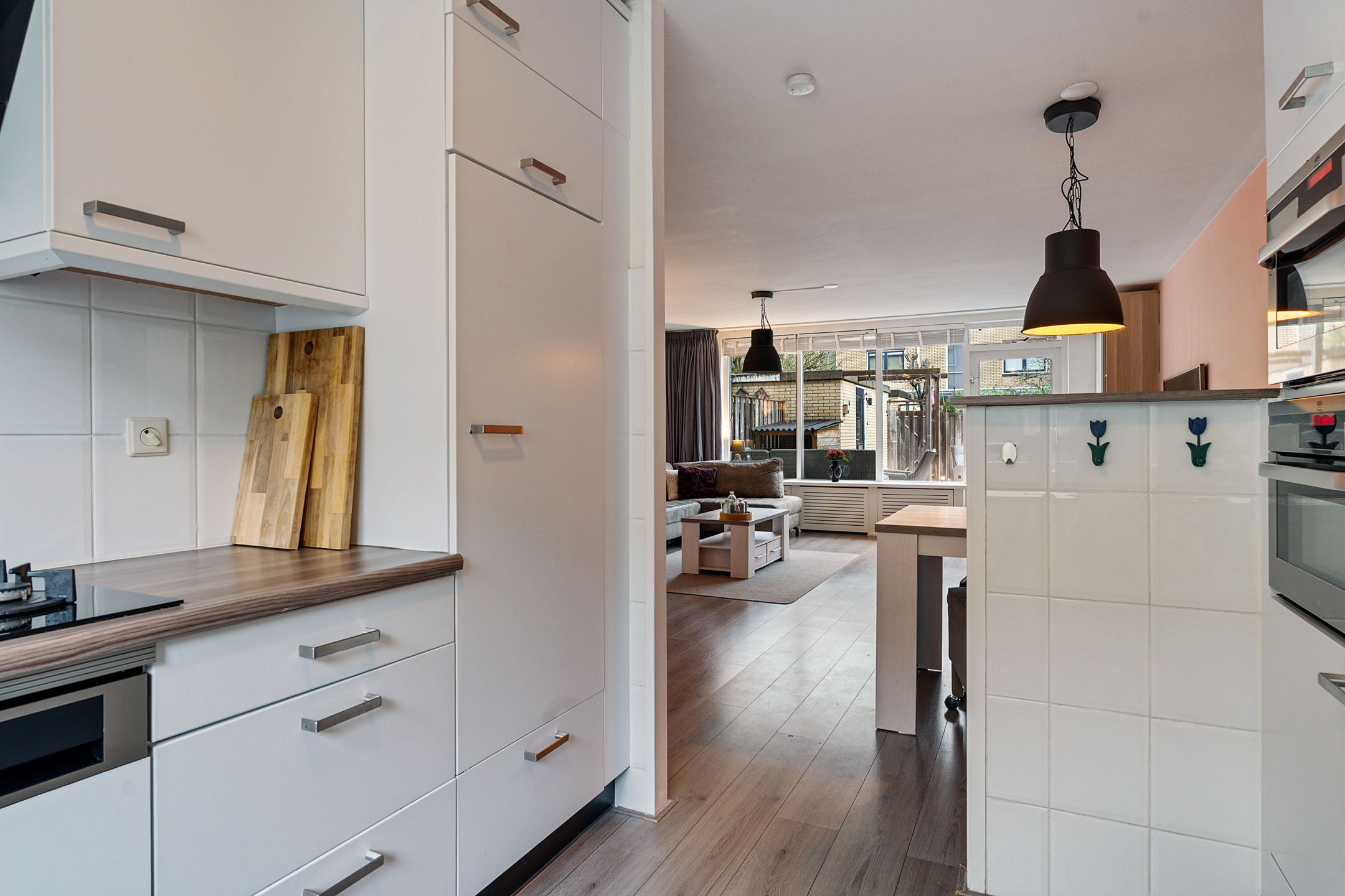 Je komt binnen in een ruime hal met toilet, meterkast en trapopgang. Vanuit hier stap je de lichte woonkamer in met zicht op de tuin. De wanden zijn strak afgewerkt en de ruimte voelt direct huiselijk aan. Aan de voorzijde van de woning ligt de keuken met veel werk- en bergruimte, voorzien van diverse inbouwapparatuur zoals een combi-oven, vaatwasser, gaskookplaat en koel-vriescombinatie.