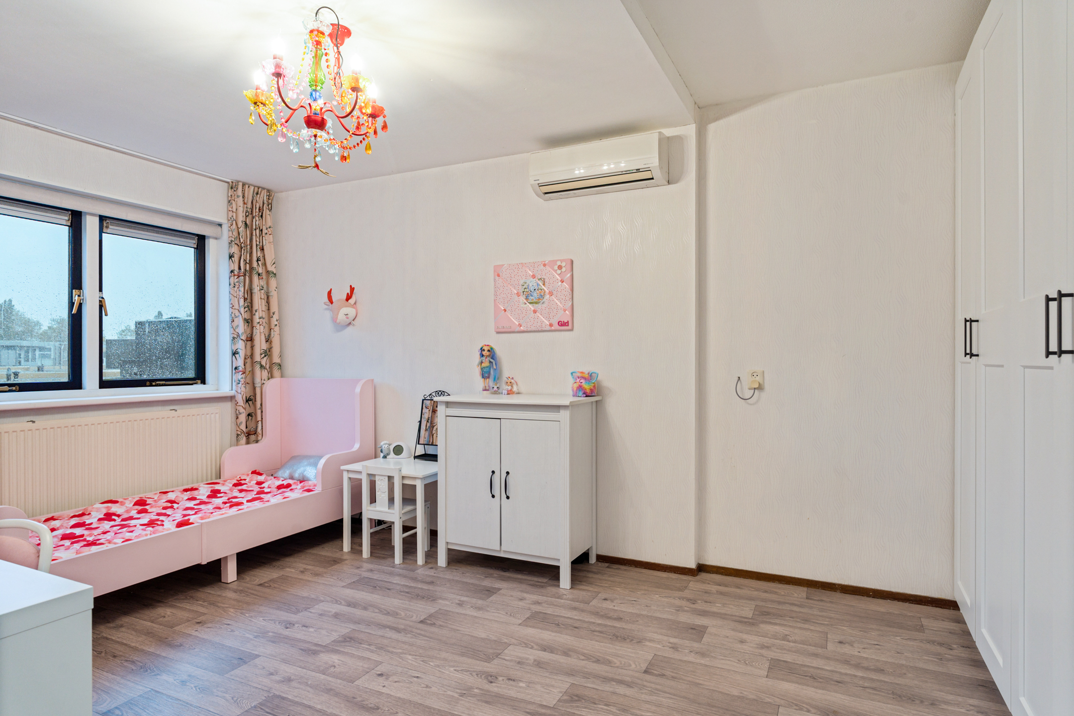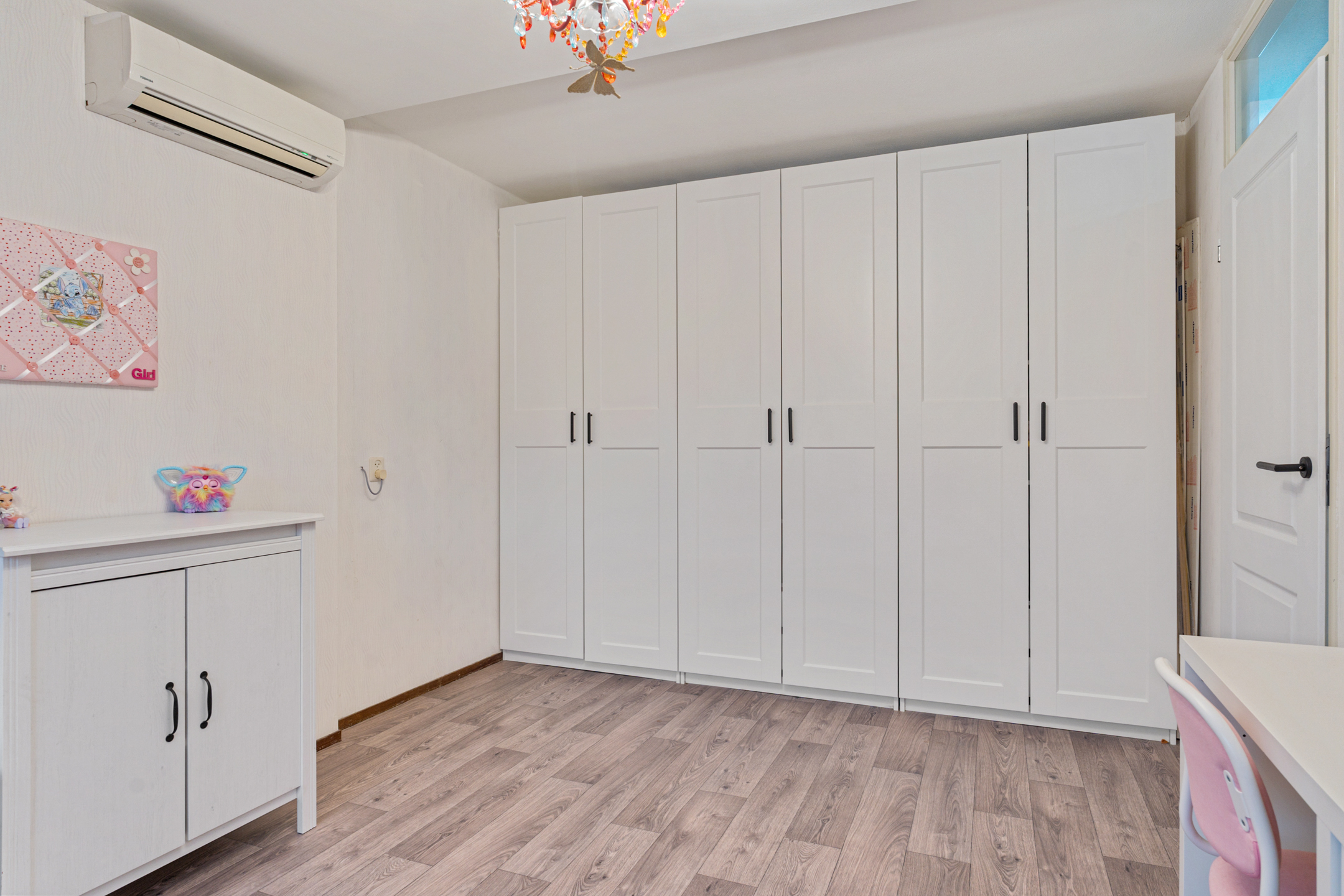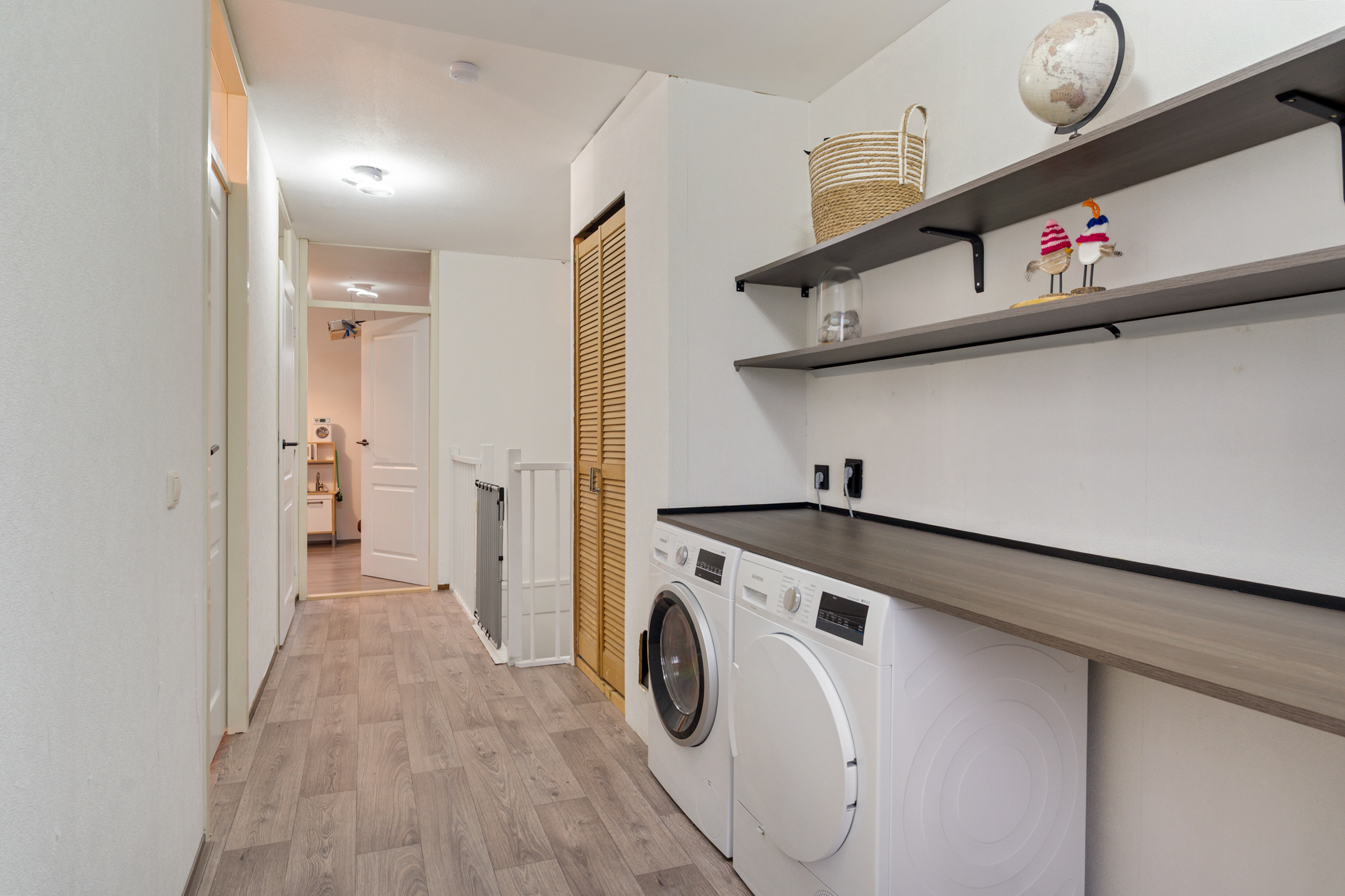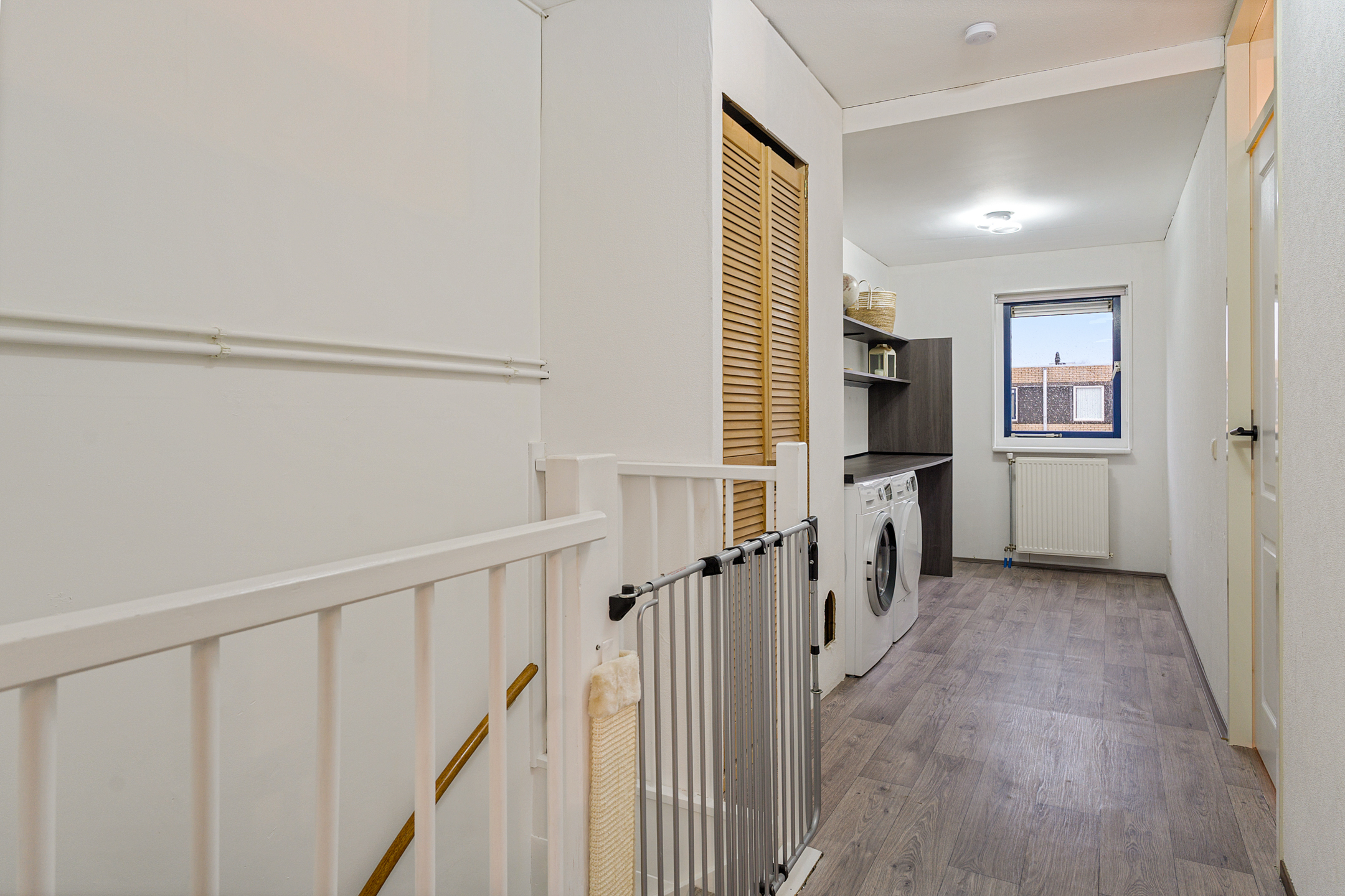 De tweede verdieping beschikt over nog twee volwaardige slaapkamers, waarvan één is uitgerust met airconditioning. Verder is er een ruime overloop met aansluitingen voor de wasmachine en de opstelplaats van de cv-ketel. Daarnaast is er een aparte berging, ideaal voor het opbergen van spullen.