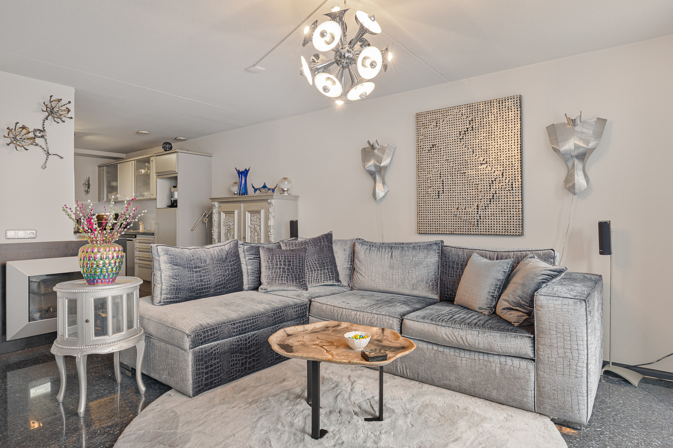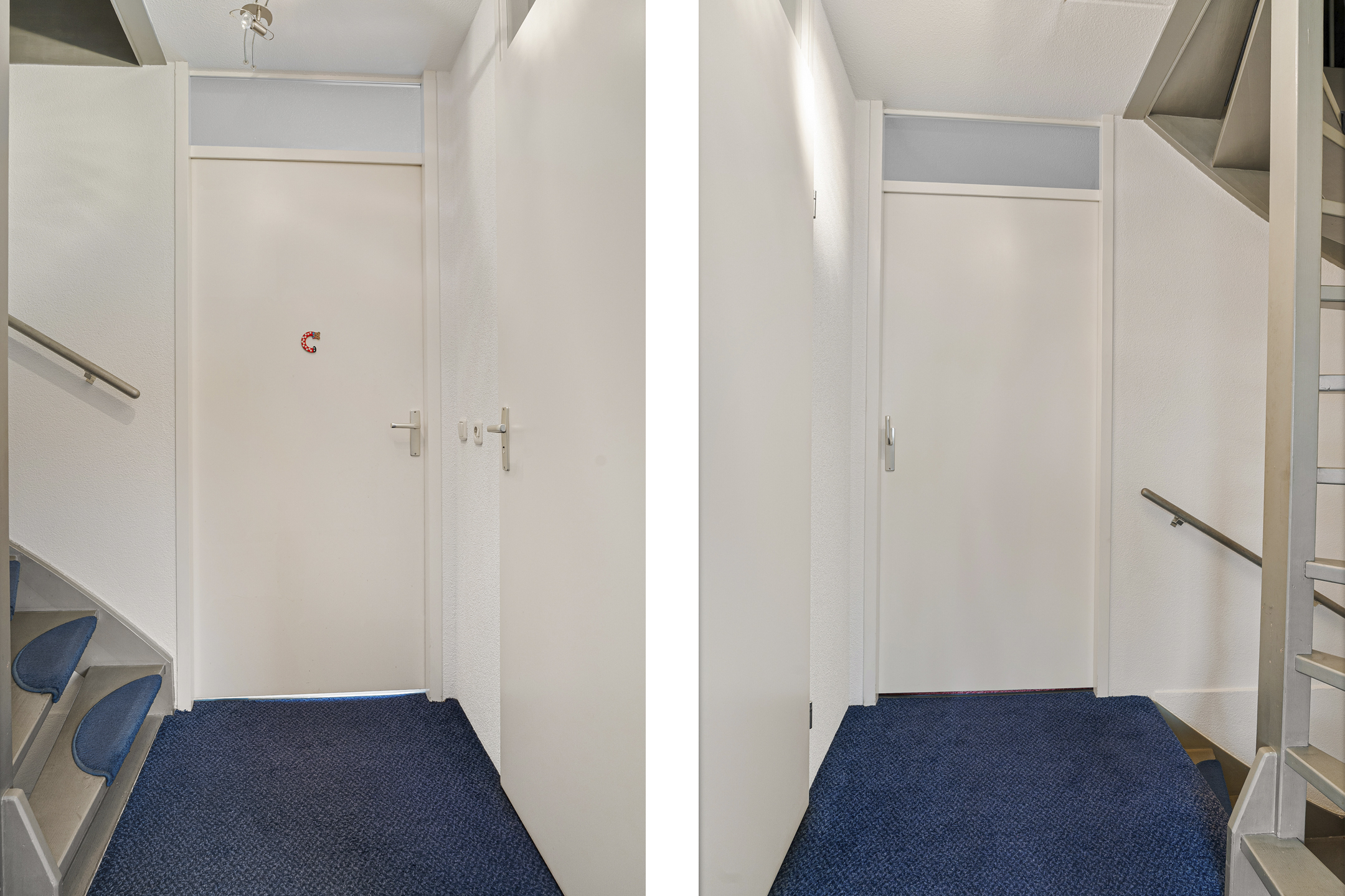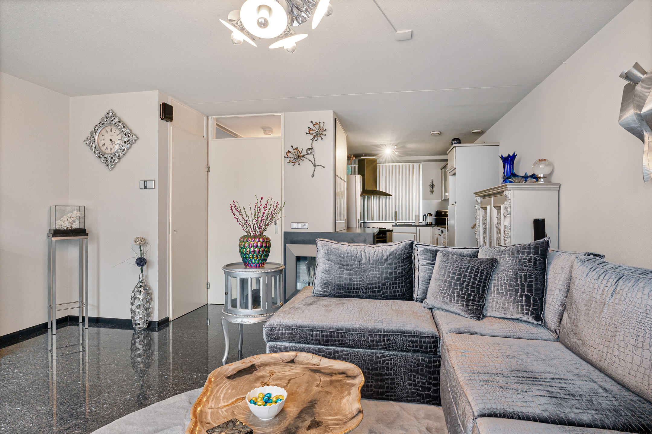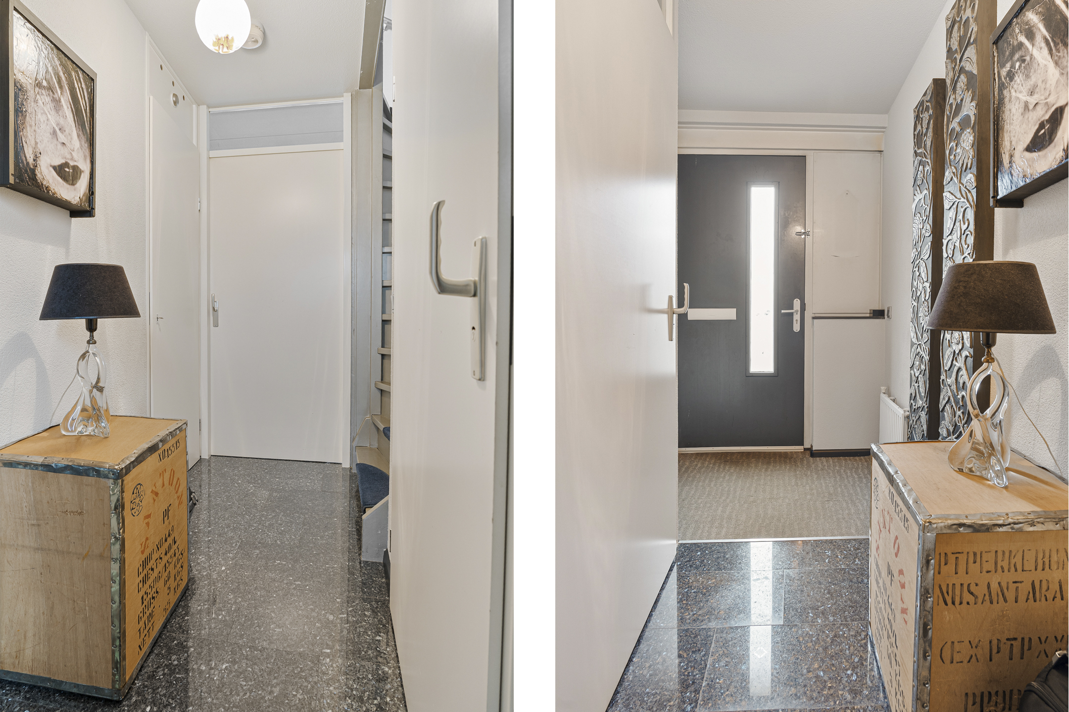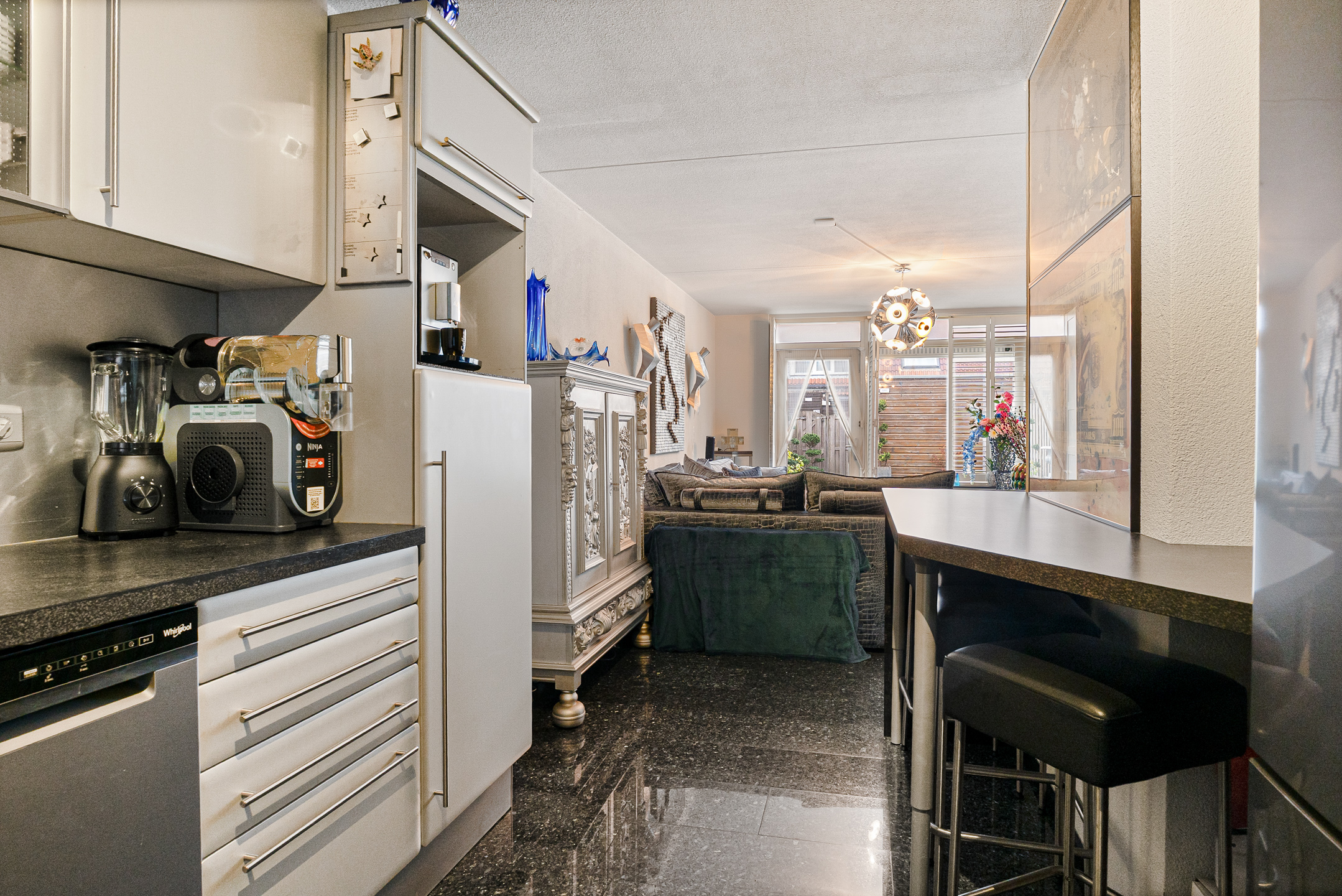 Je komt binnen in de hal met meterkast, toilet en toegang tot de woonkamer. De graniettegelvloer loopt door over de gehele begane grond en vormt samen met de spachtelputz wandafwerking een praktische en nette basis.