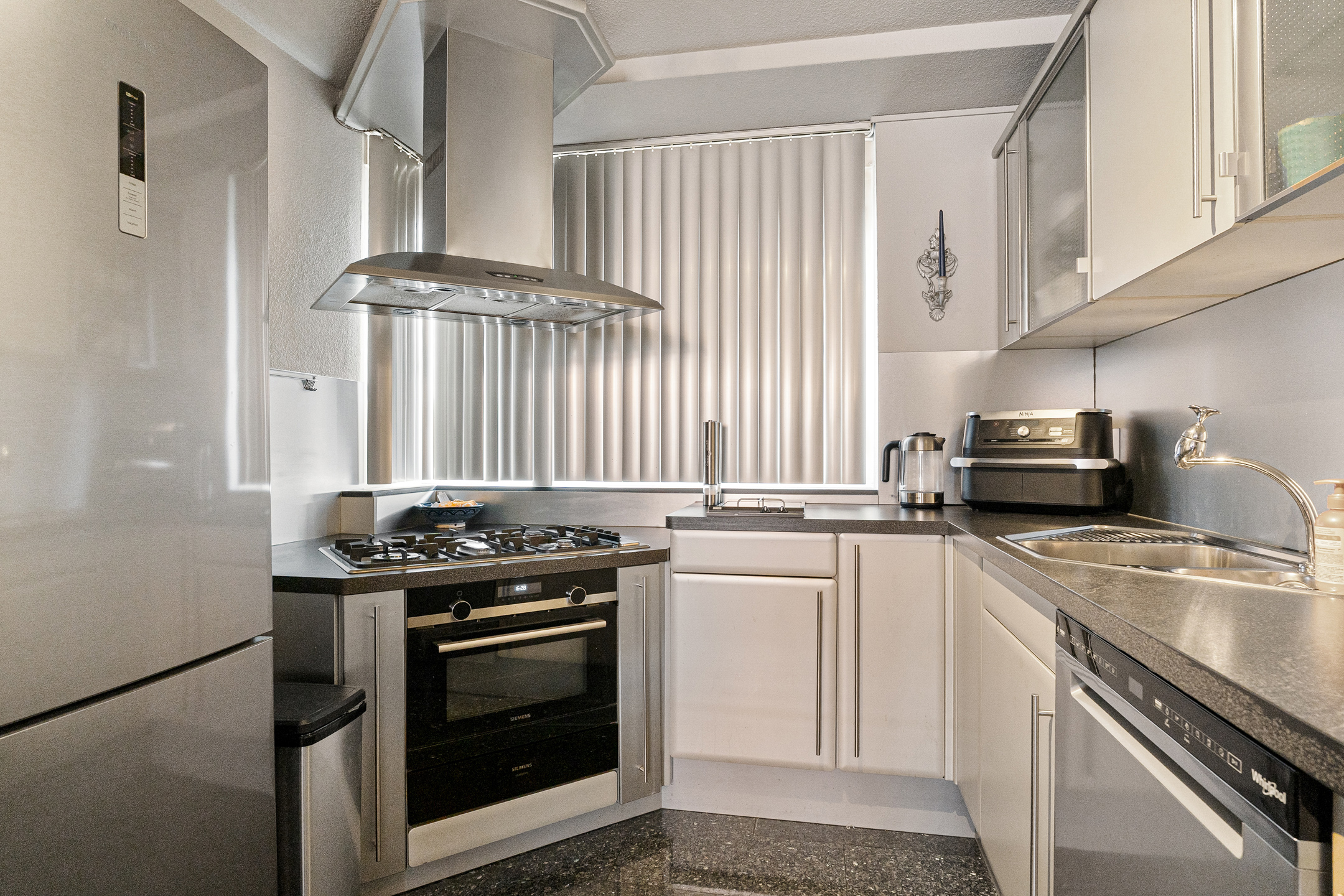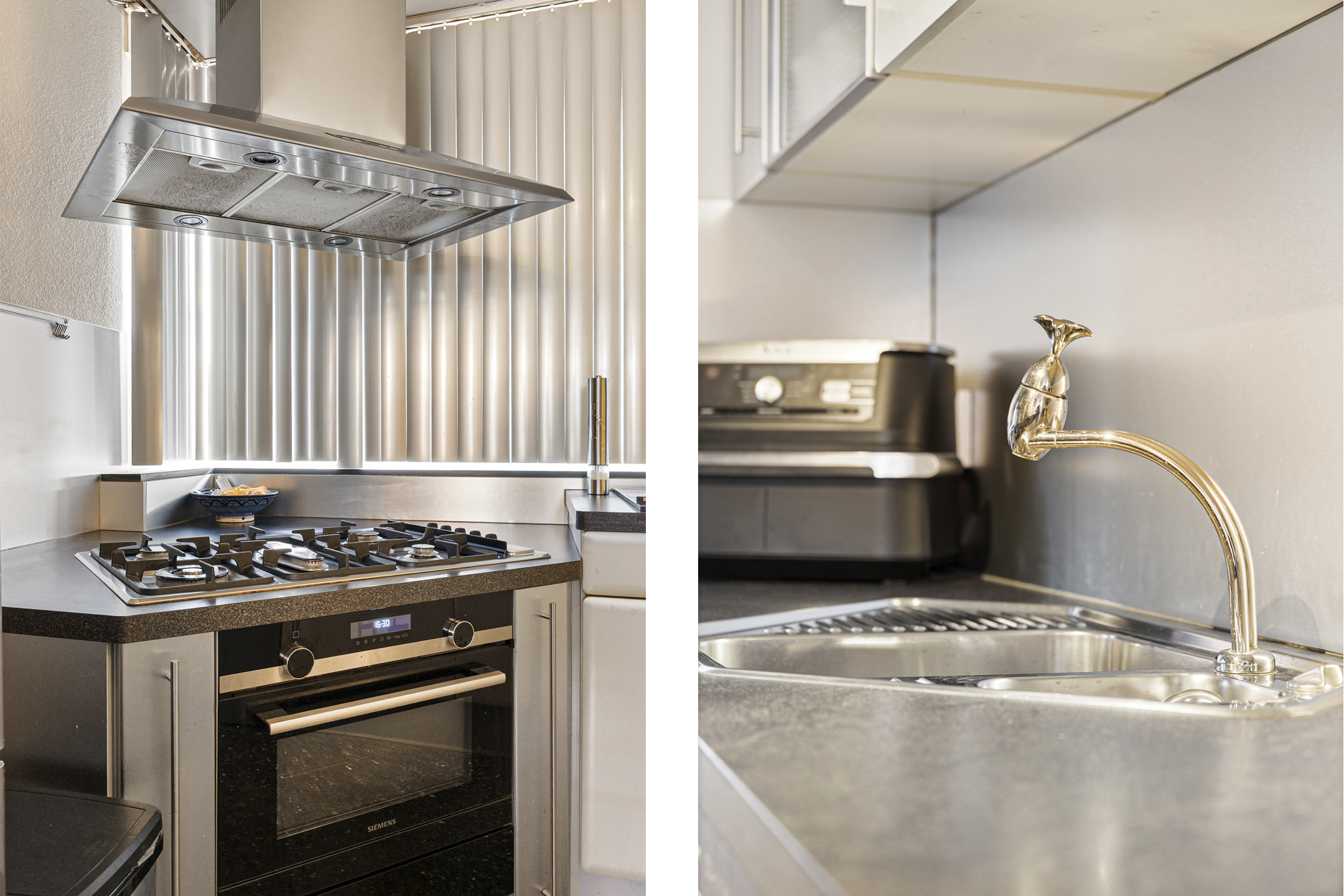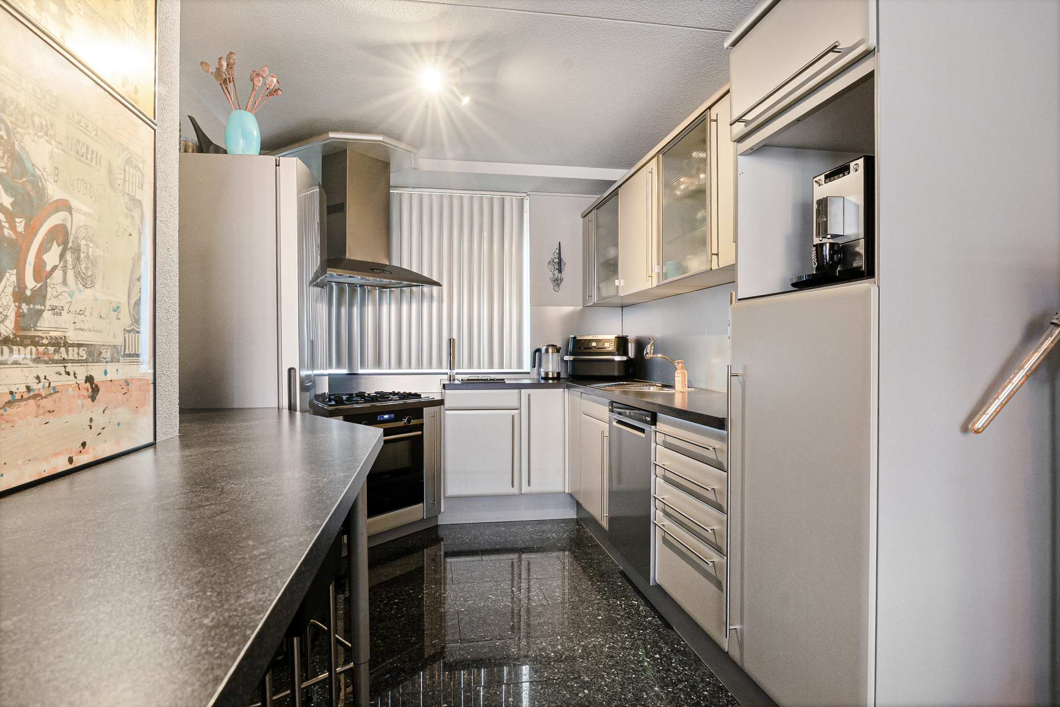 Aan de voorzijde ligt de open keuken met baropstelling, waar je met vier personen kunt zitten. De keuken heeft een zilver metallic afwerking en beschikt over een 5-pits kookplaat, oven, ingebouwde frituur, vaatwasser uit 2025, losse koel-/vriescombinatie en een aparte plek voor de koffiemachine. De kookplaat wordt vervangen door inductie.