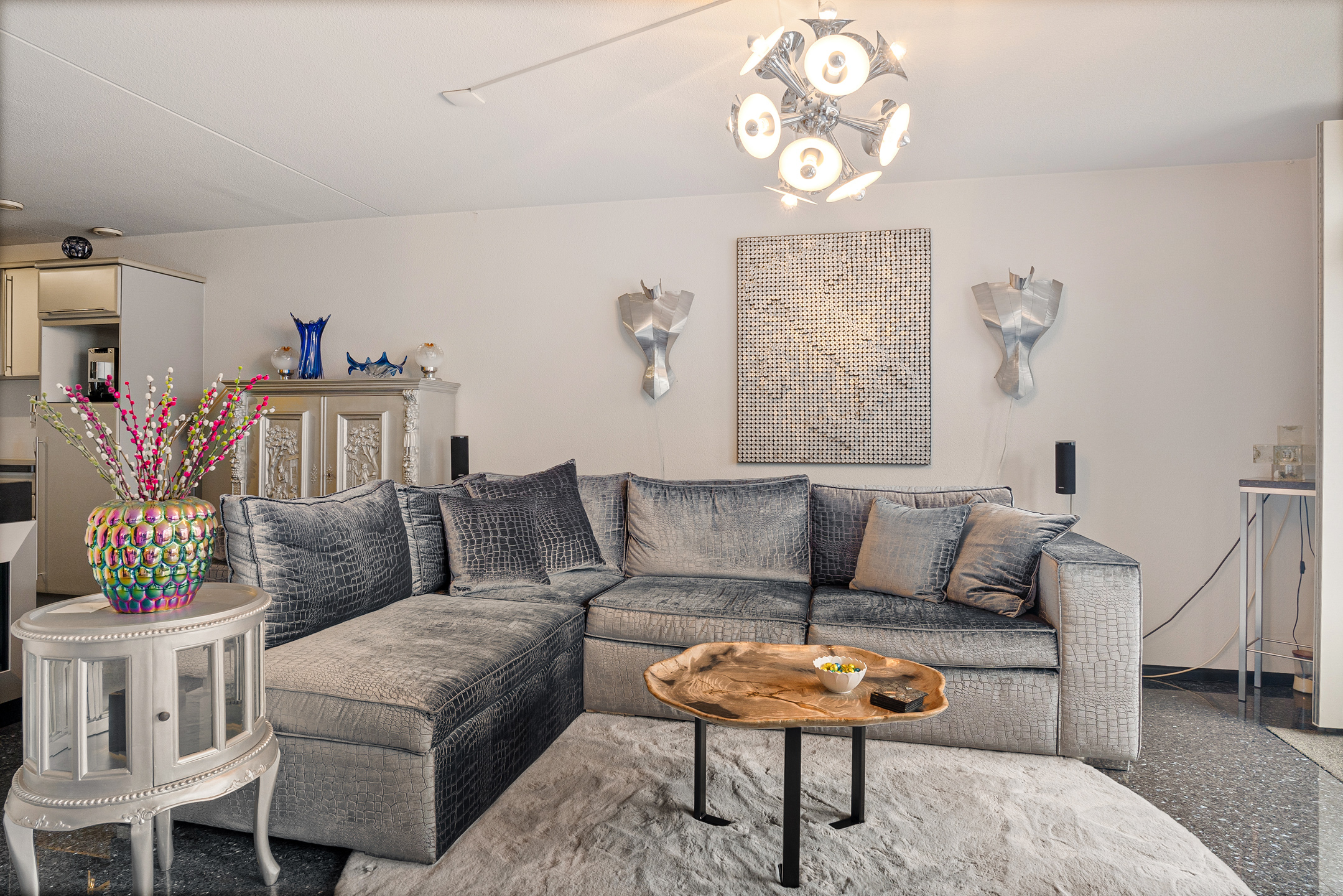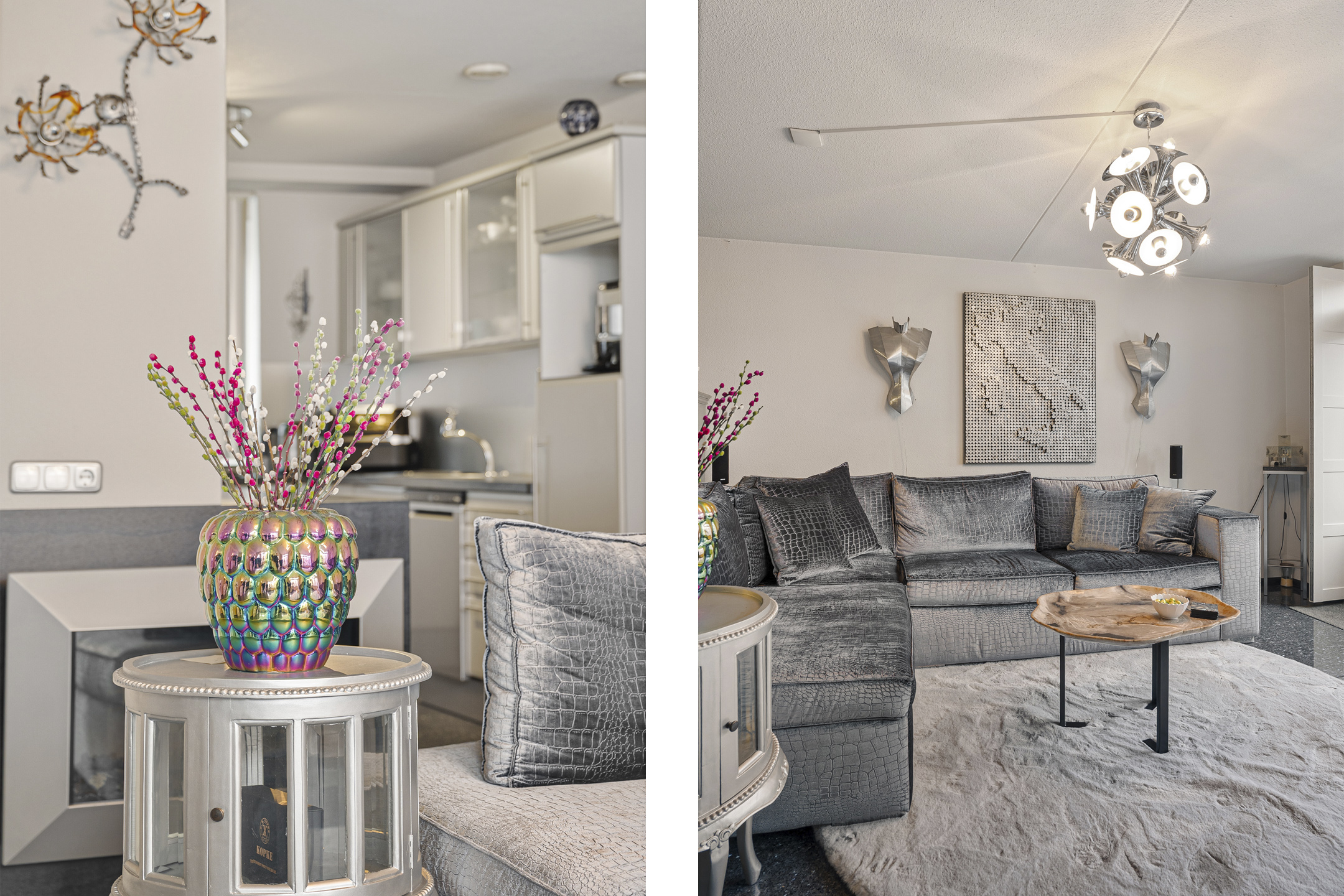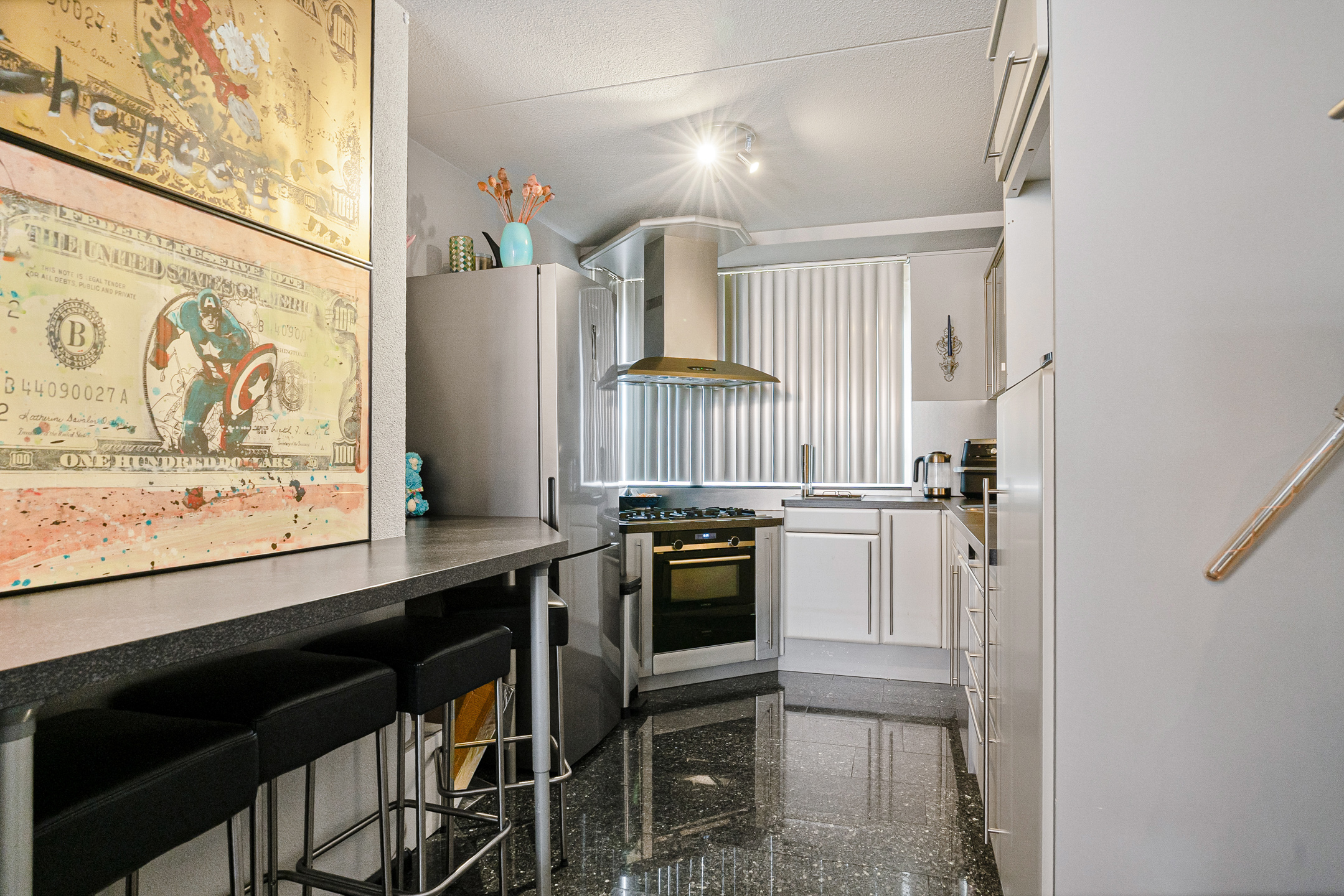 Aan de voorzijde ligt de open keuken met baropstelling, waar je met vier personen kunt zitten. De keuken heeft een zilver metallic afwerking en beschikt over een 5-pits kookplaat, oven, ingebouwde frituur, vaatwasser uit 2025, losse koel-/vriescombinatie en een aparte plek voor de koffiemachine. De kookplaat wordt vervangen door inductie.