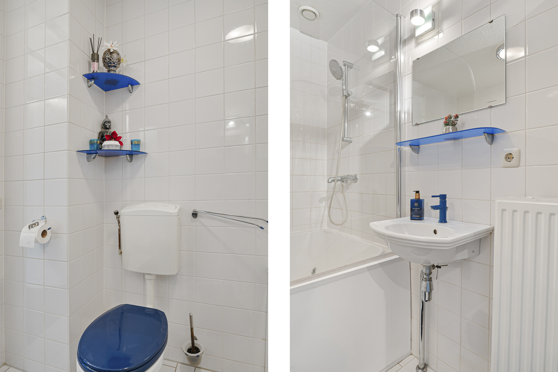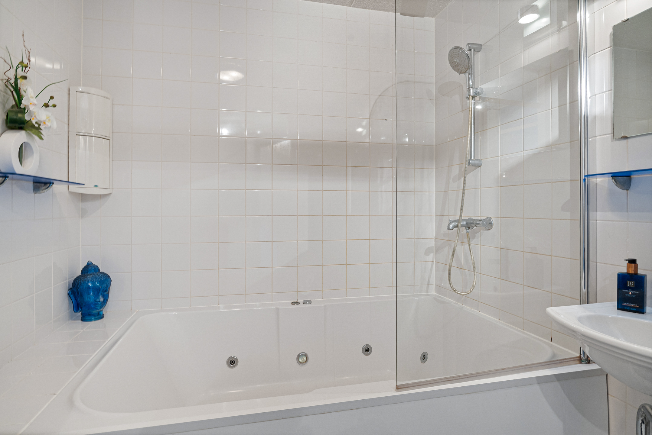 In de badkamer vind je een tweede toilet, wastafel, handdoekradiator en een tweepersoons whirlpool ligbad met meerdere jets. De lichte tegelafwerking zorgt voor een rustige basis.