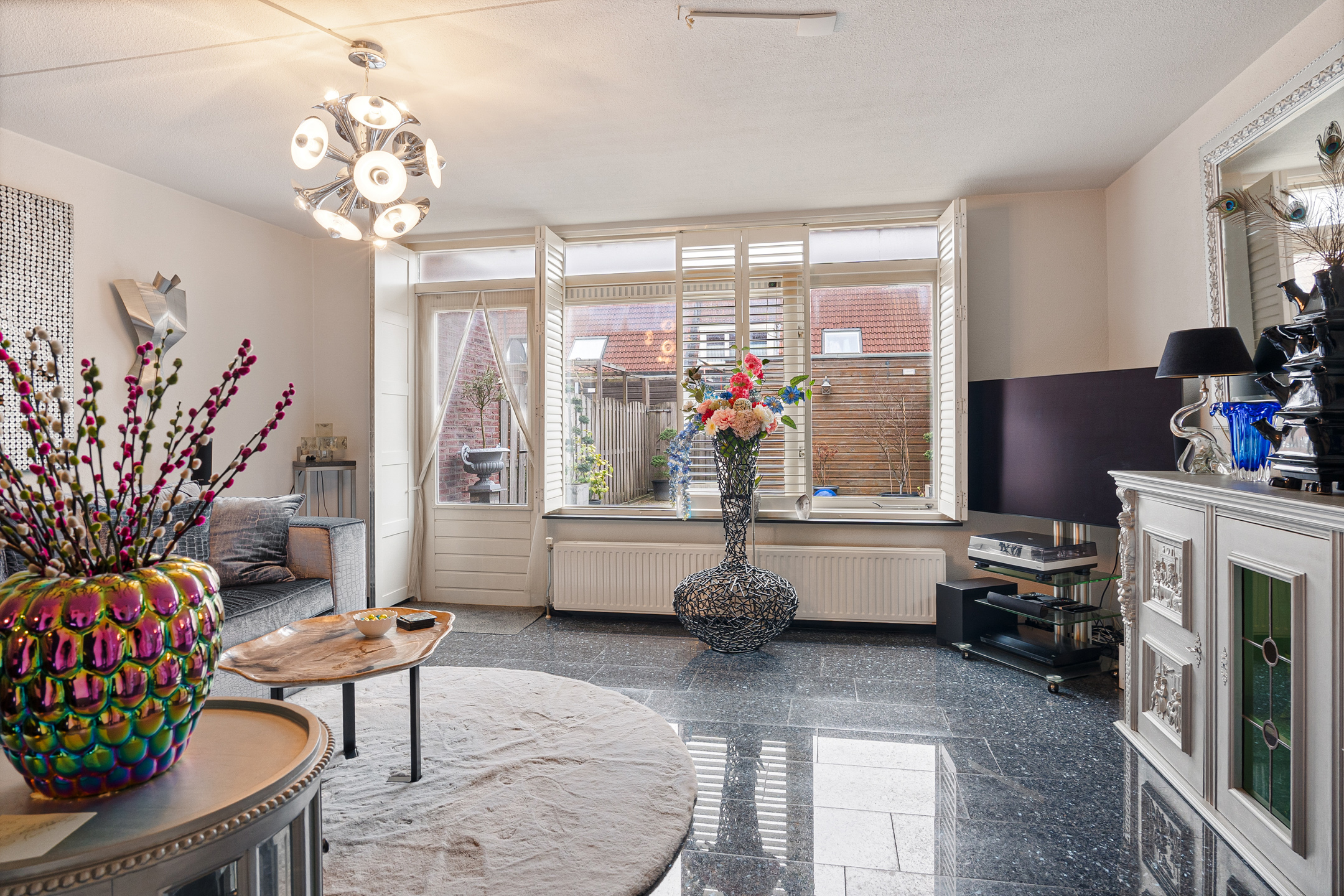 + Woonkamer aan de tuinzijde met tuindeur en shutters