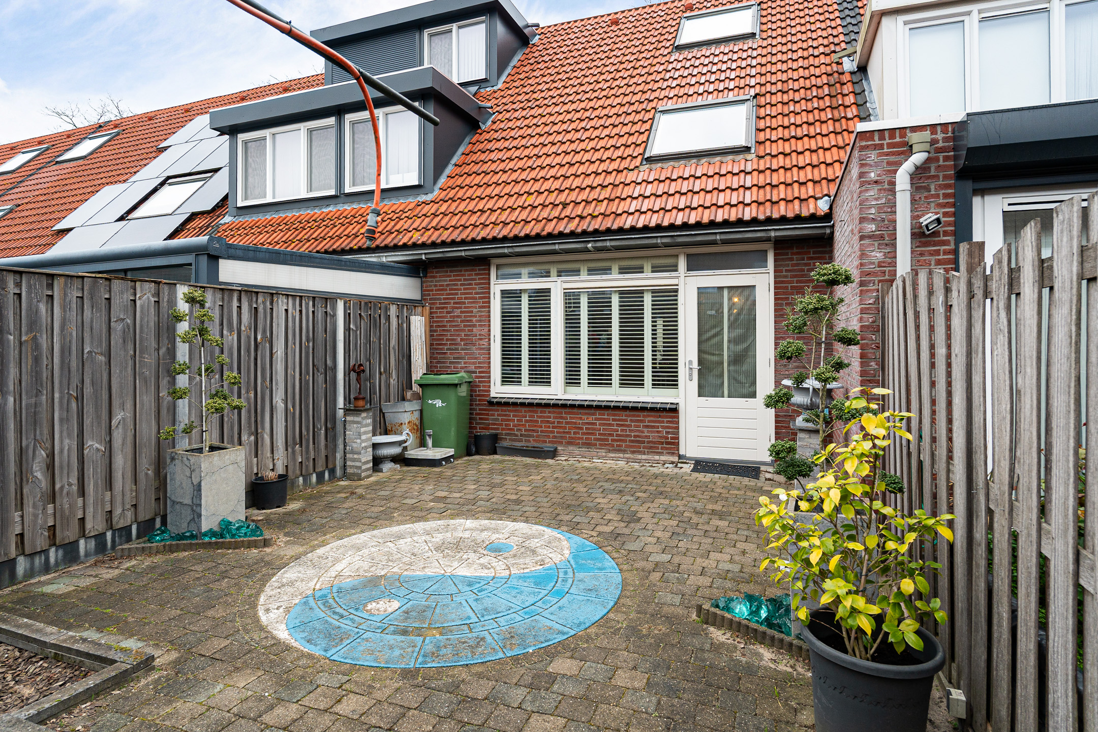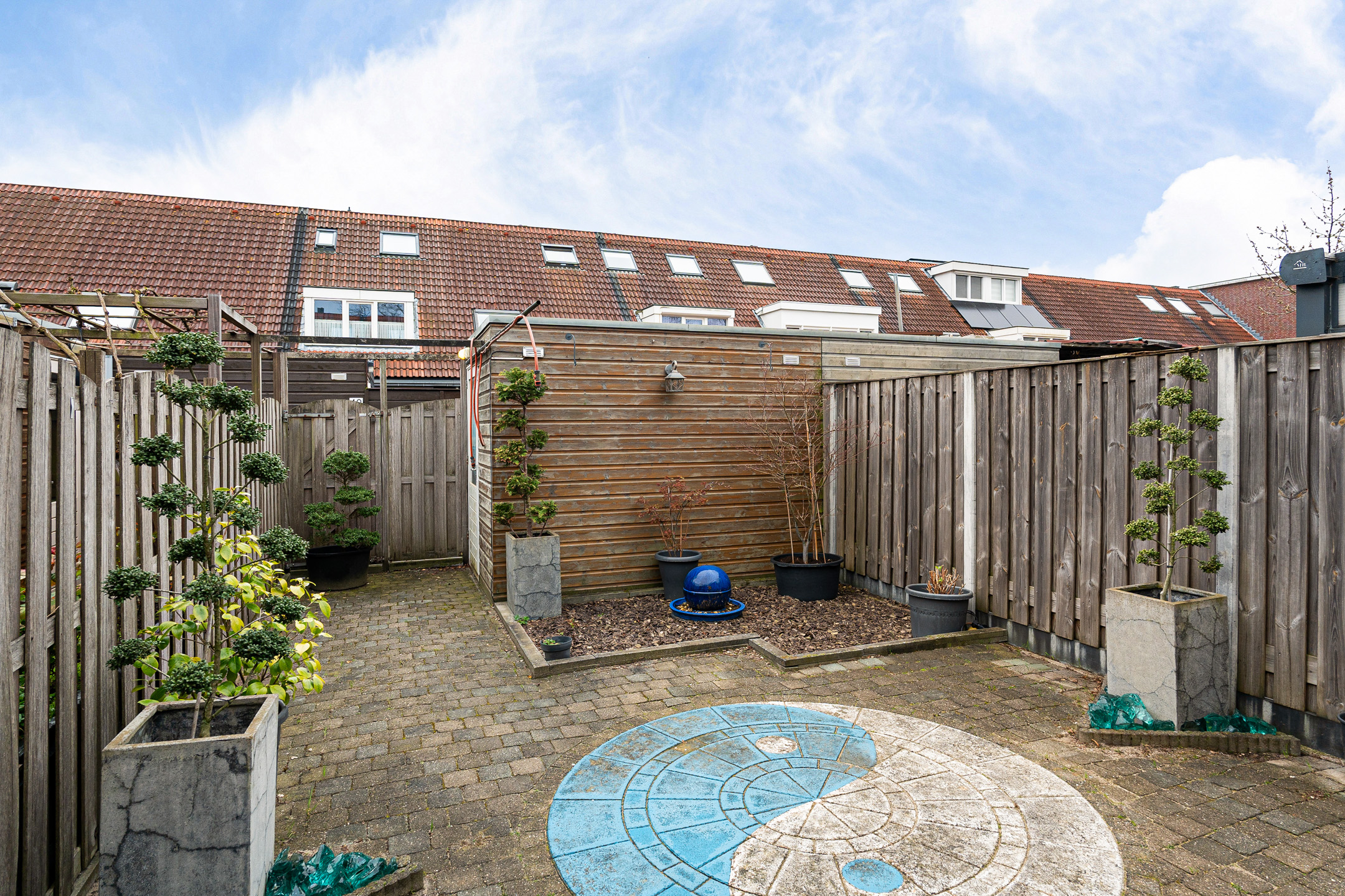 De achtertuin is aangelegd met voldoende ruimte om buiten te zitten. Achterin staat een houten berging en via de achterom kom je gemakkelijk met fietsen of tuinspullen de tuin in. De schuttingen geven de tuin een beschut karakter.